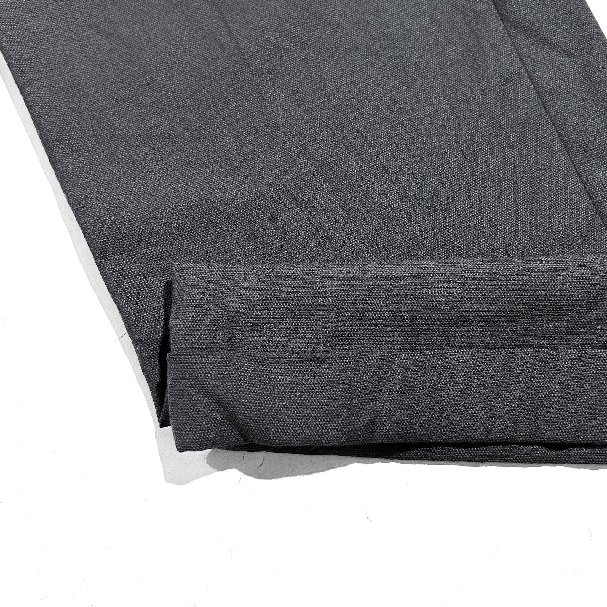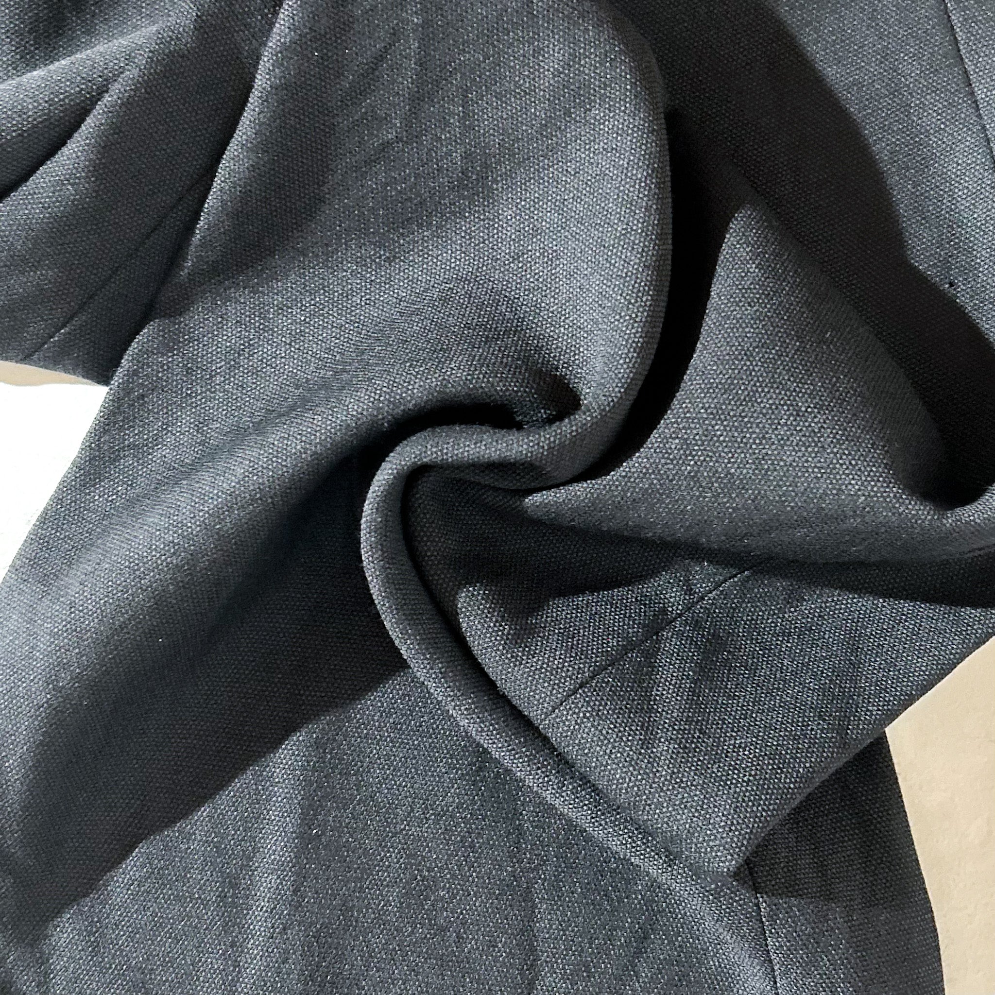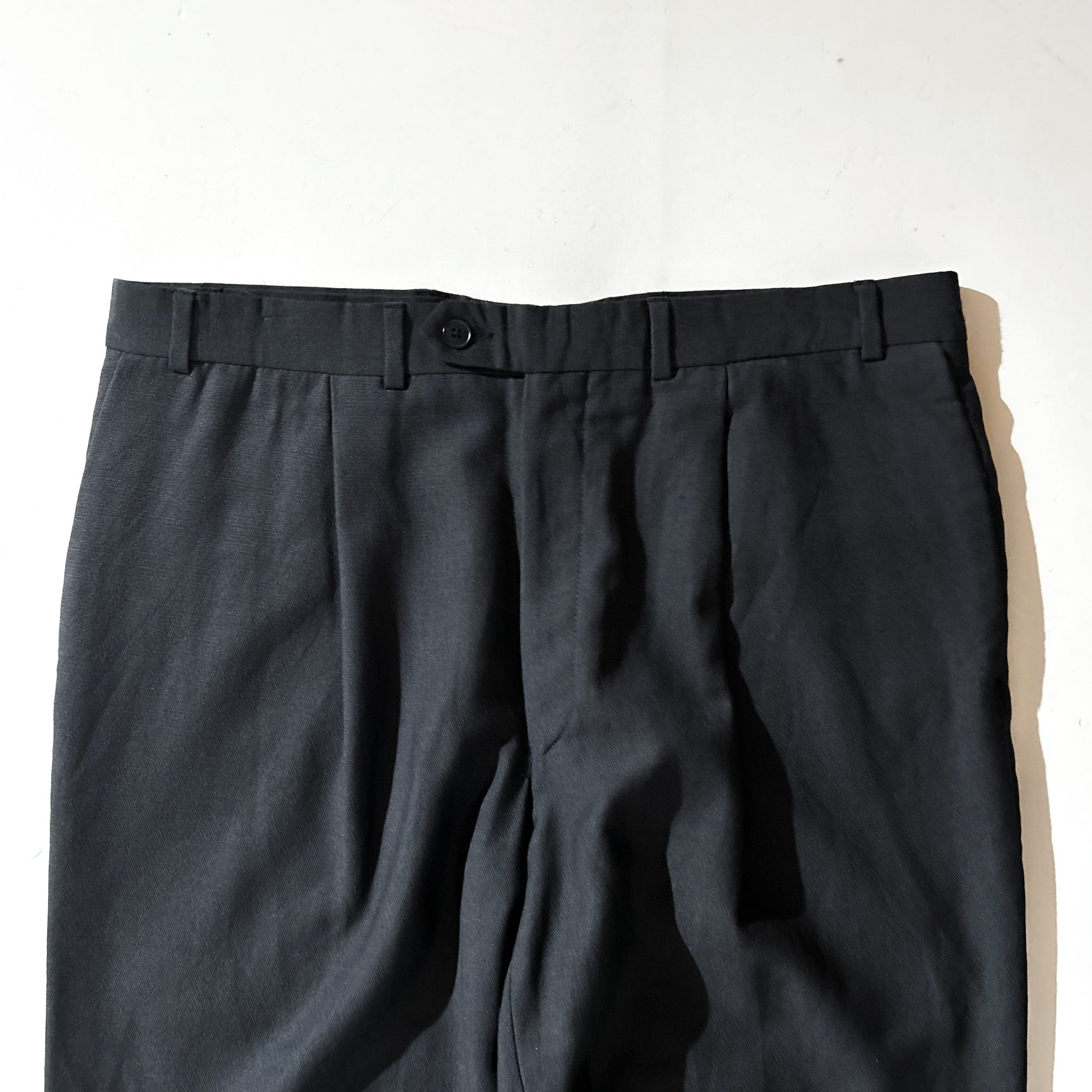【Webスタッフ大鹿のおすすめ商品】 ニューヨーク発の都会的ブランド〈DKNY〉から、クラシックな1タック入りスラックスが入荷しました。 素材表記は欠損していますが、手触りや落ち感からレーヨンまたはウール混紡と思われる生地感。サマーウールのような軽やかな風合いで、春・夏・秋と3シーズン快適に着用いただけます。 織りの表情が独特で、過去に取り扱ったイヴ・サンローランのスラックスを彷彿とさせるような、さりげない高級感が魅力。ハイブランド顔負けのクオリティを感じられる一本です。 シルエットは、渡りにゆとりを持たせたルーズなテーパードライン。裾にかけて緩やかに細くなる、〈Polo Chino〉や〈Levi’s 560〉のような丸みを帯びたシルエット。裾はダブル仕上げで、ラフな印象の中にもクラシックなムードを忘れません。 前ポケットはアウトシームに沿って配置されており、両玉縁仕様のバックポケットを採用。ミニマルかつ洗練された印象に仕上がっています。
