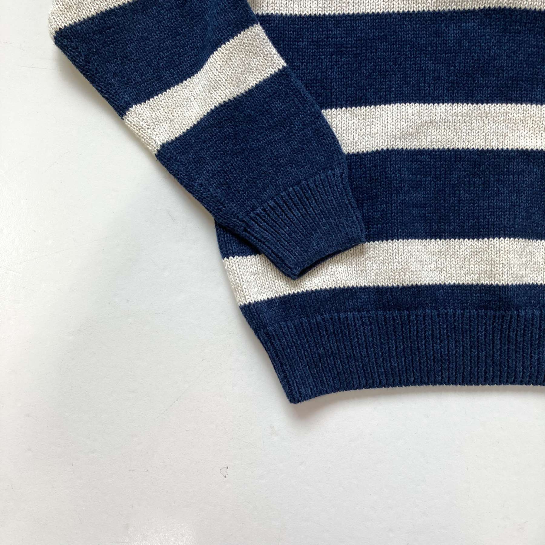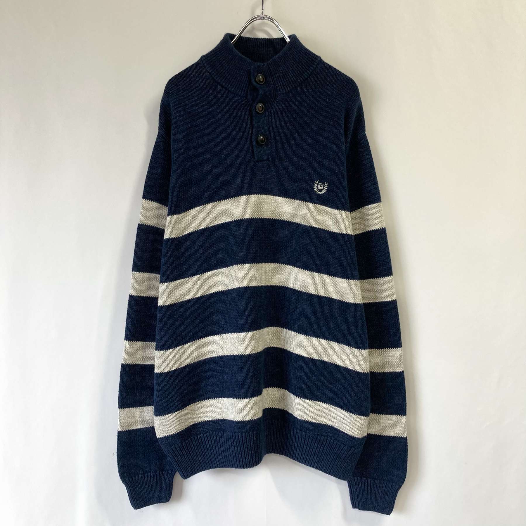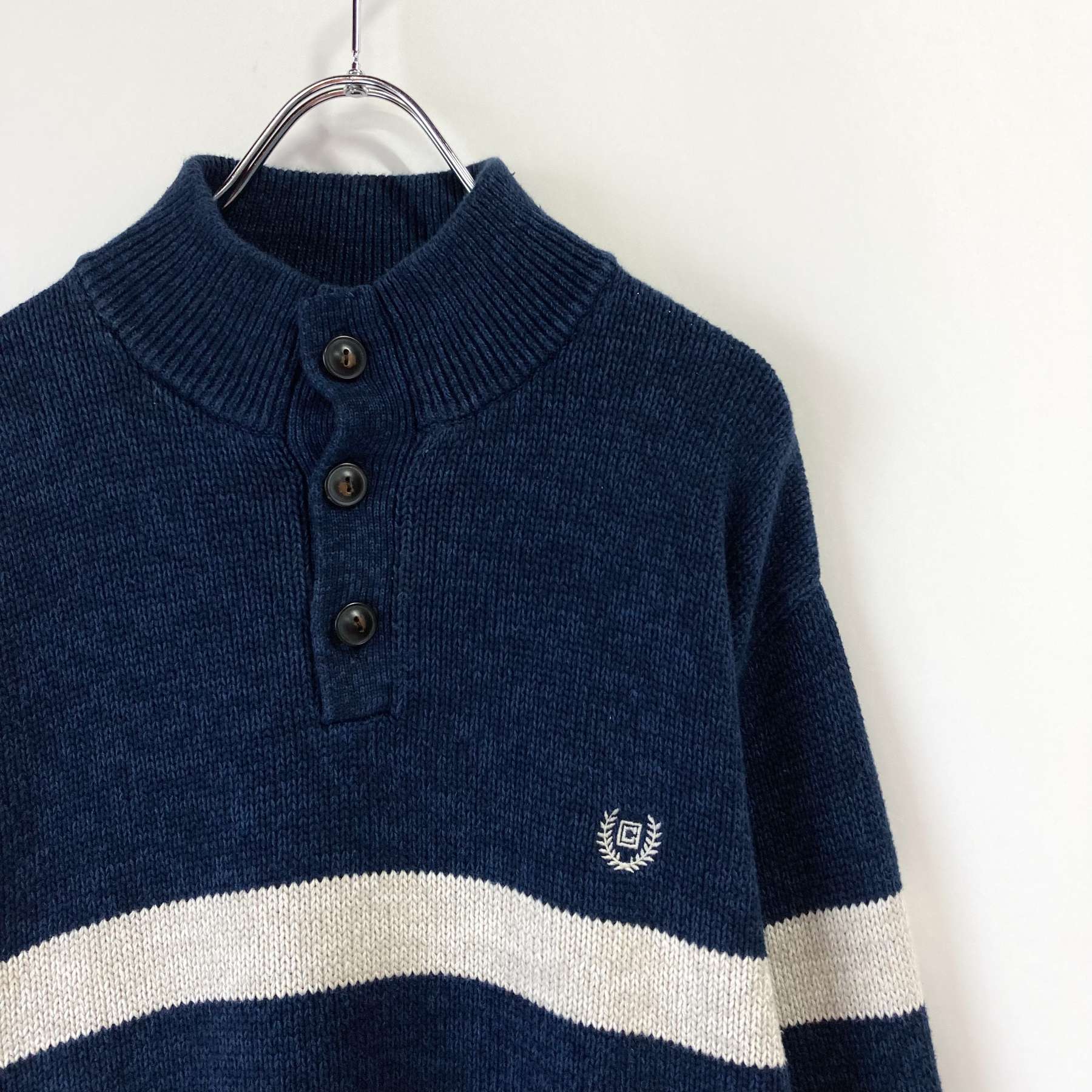 古着 CHAPS ライン プルオーバー コットン ボタン付きハイネック ボーダーニットセーター