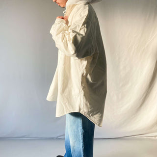 シルクが使われていて、色も白なので高級感のある1着になっております。 サイズが大きいので、インナーとしても羽織りとしても着れて、きれいになりすぎずカジュアルにも着れる万能なアイテムです。