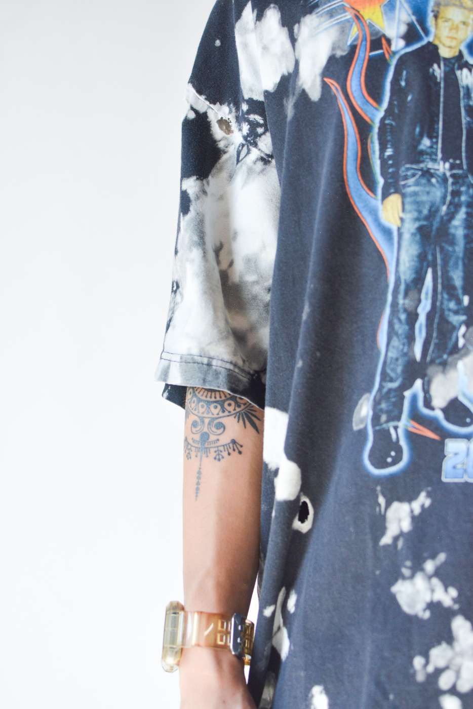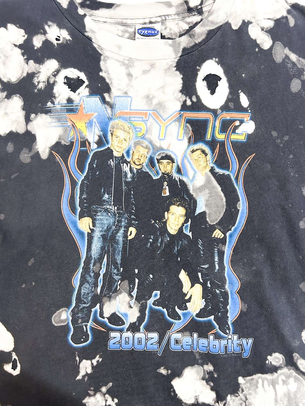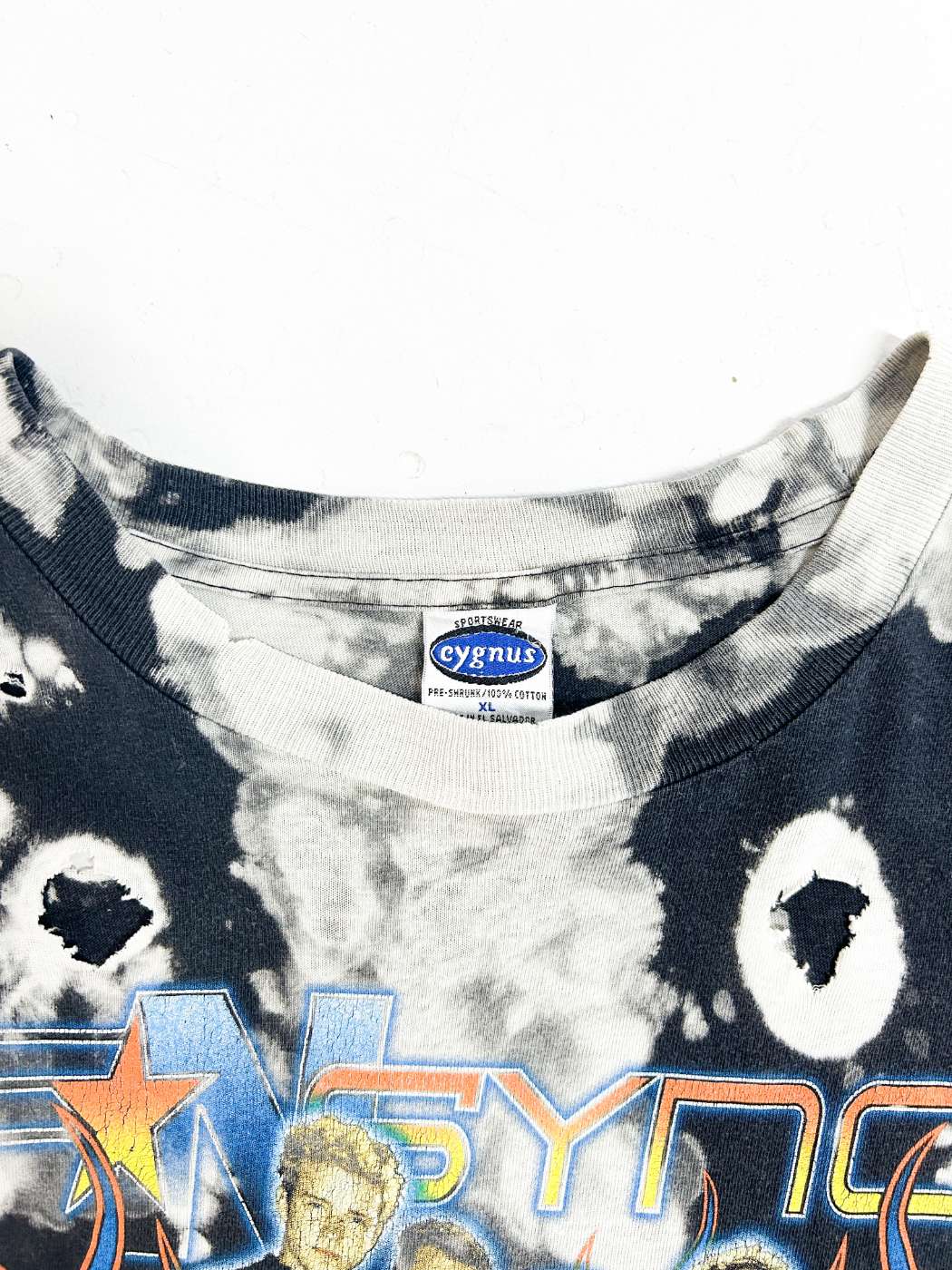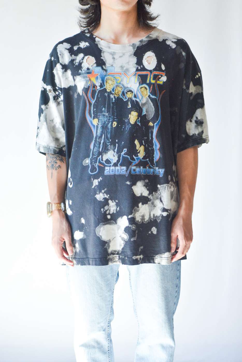 2002年に解散したアメリカのグループ"*NSYNC"のプリントTシャツ。タイダイでこのダメージ感にグランジぽさを感じますね。