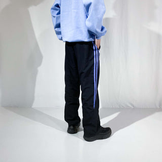 adidasのトラックパンツになります。 ウエストにドローコードが付いている為、どなたでもご着用いただけるアイテムです。 黒地にパープルのサイドラインが粋な1着。 細身なシルエットでスタイリッシュな印象ですよ!