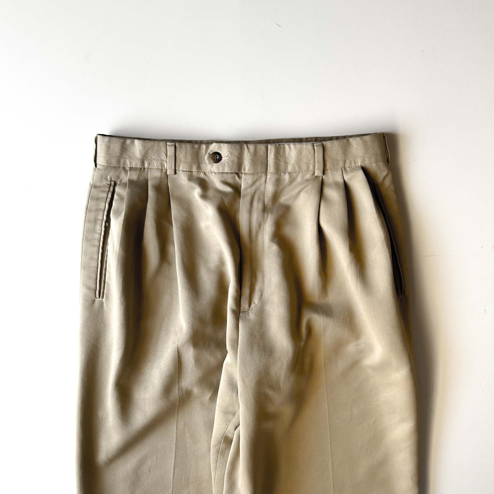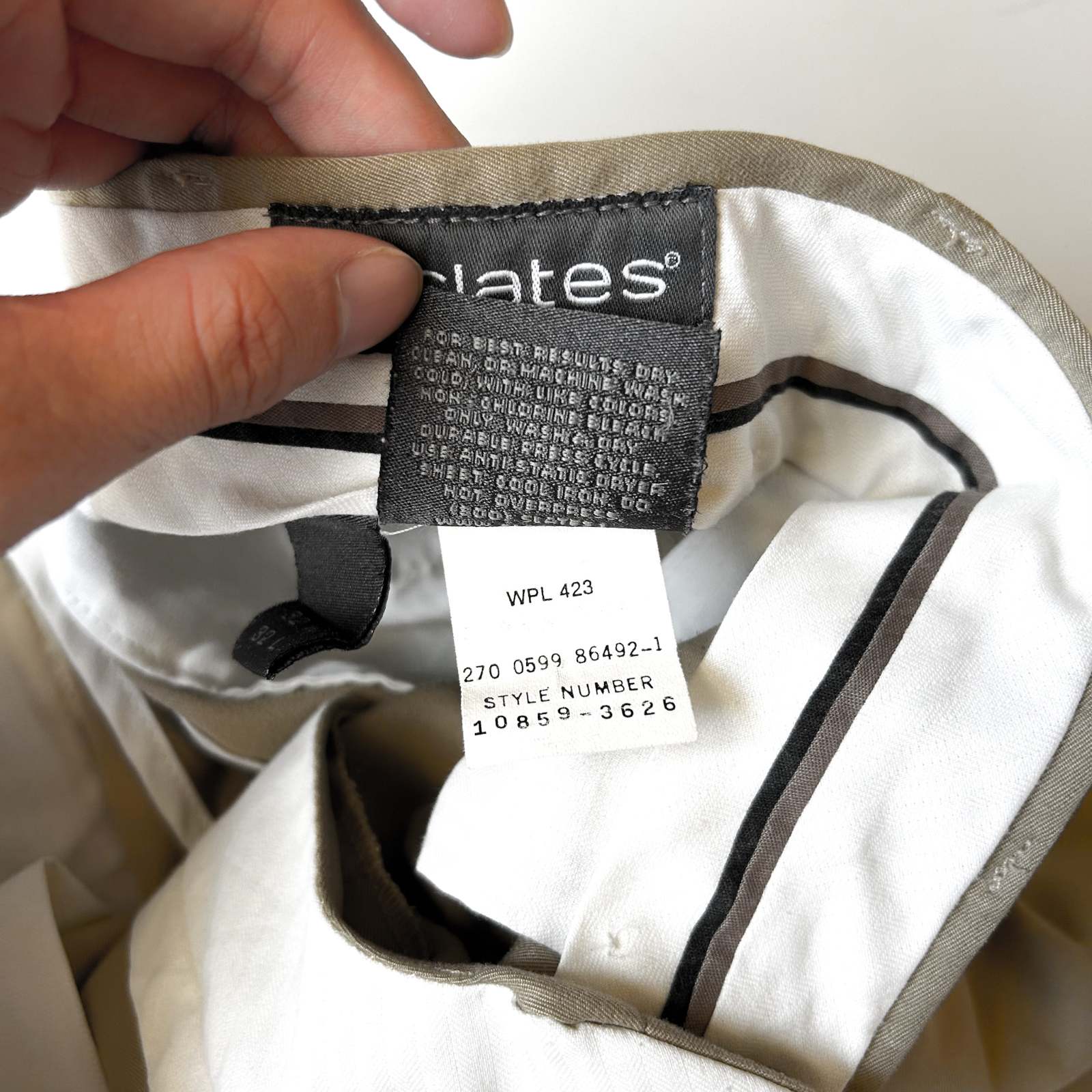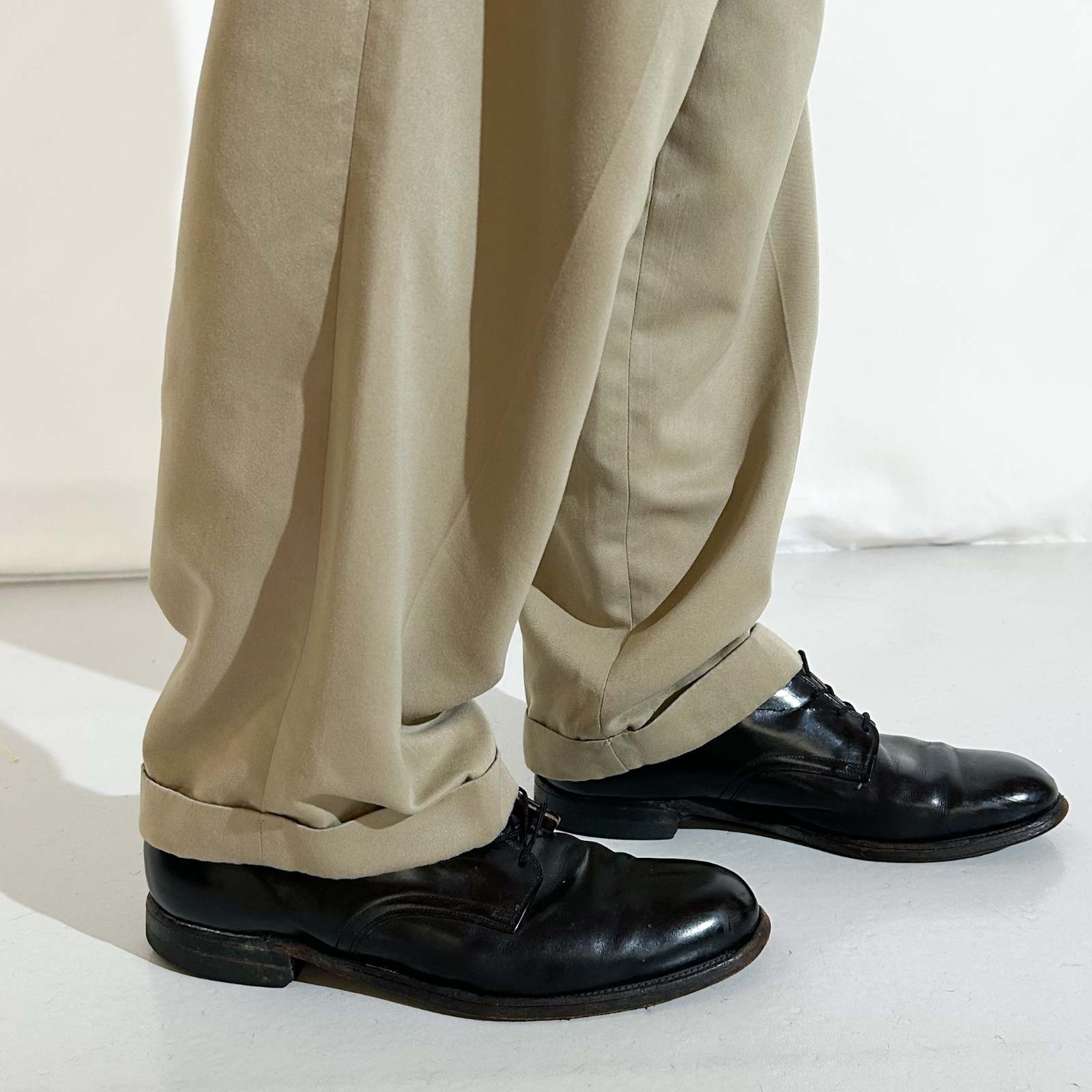【Webスタッフ大鹿のおすすめ商品】普通の入荷でも出している**リーバイスのスラックスライン「SLATES(スレイツ)」**ですが、今回も僕の好きなアイテムということでおすすめ枠でチョイスしました。 しかも今回は珍しい3タック仕様。…さらに生産国は**ドミニカ共和国(Dominican Republic)**で、古着好きからも評価の高い時代の一本です。 ベージュカラーで、キレイめなチノパン感覚でも履ける万能さ。渡りはしっかりゆったりめ、裾にかけては緩やかなテーパード。ただし裾幅も十分あるので、いわゆる細くなりすぎる感じはありません。 シルエット的には、古めのPOLO CHINOや00年代のLevi’s 560のような、街でも使いやすいワイド寄りのリラックスシルエットに近いです。 ちなみに、70年代のLevi’sには**「Panatela(パナテラ)」というスラックスラインもありましたが、あちらはもっと70s感が強め。起毛素材やフレアシルエットなどレトロな印象が強いです。 それに対して今回のSLATESは現代にも通用する都会的でスマートな1本**。ジワジワ人気になってきているので、今のうちにいかがでしょうか?