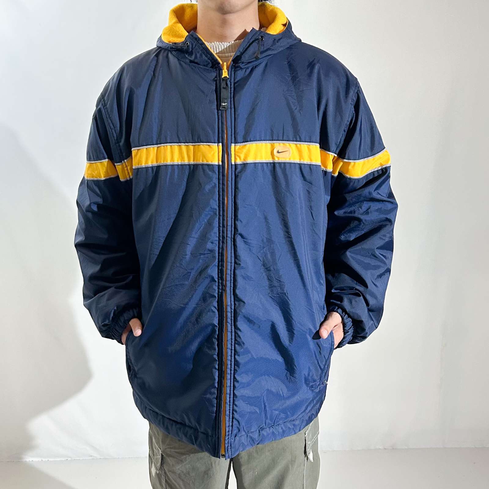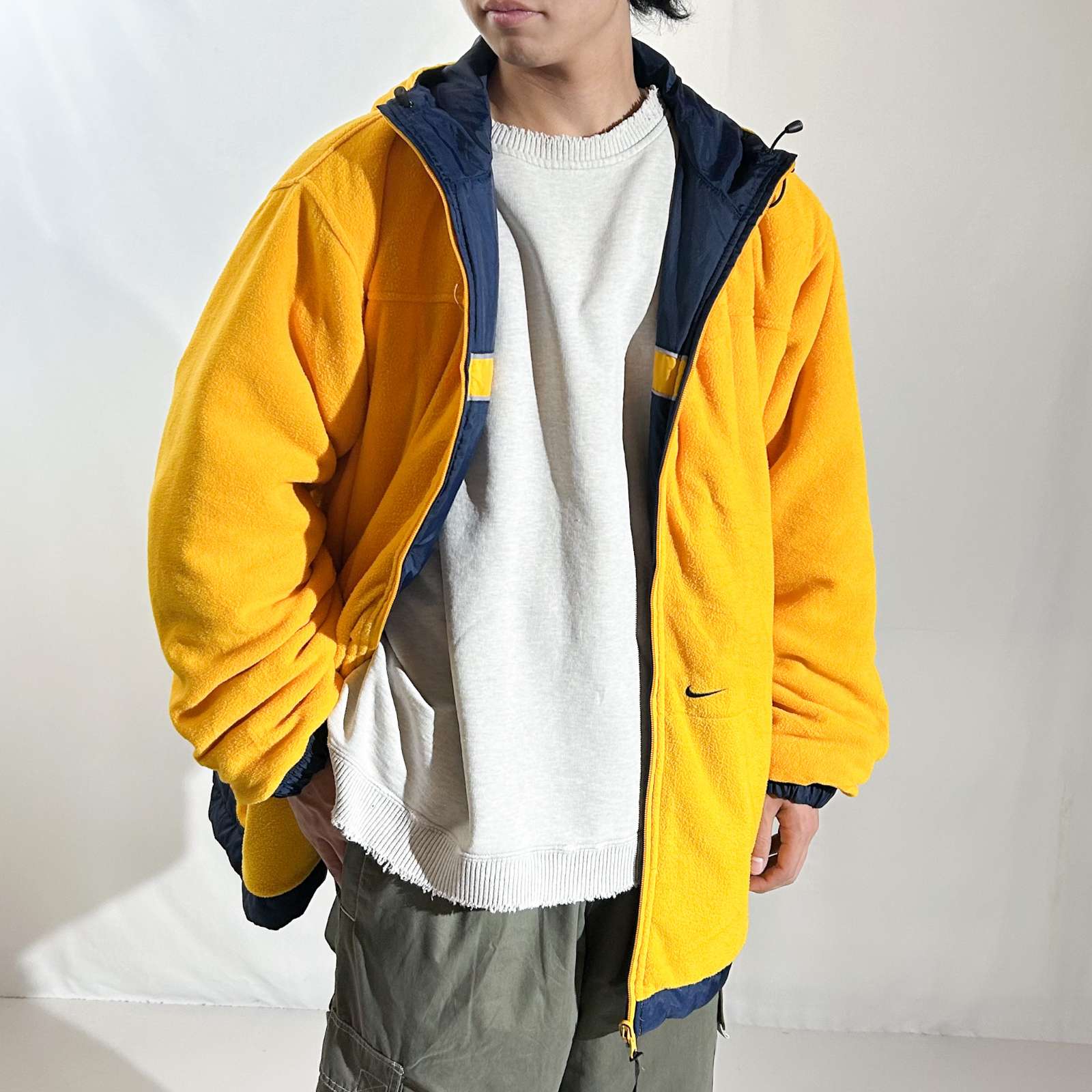 〈NIKE〉のリバーシブルジャケットが、デザイン違いで2点入荷しました。 基本的なシルエットや構造は同じで、サイズ表記のみ異なります。 お好みのサイズ感で選んでいただけたらと思います。 表(A面)はネイビーナイロンシェルでスポーティな印象、 裏(B面)はフリース素材で保温性も抜群。 しかもフリースは潰れやダメージのないGoodコンディション。 リバーシブル仕様なので、その日の気分で 「ナイロンでクールに」も「フリースでカジュアルに」も使い分け可能。寒さが増す今の時期から春先まで活躍する万能アウターです。こちらは状態考慮でかなりリーズナブルになっていると思います!