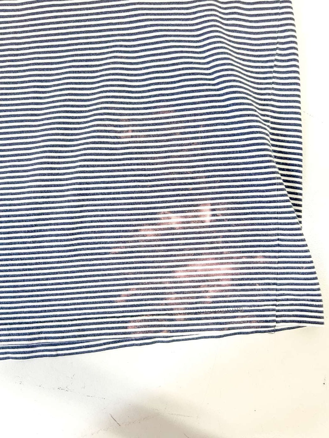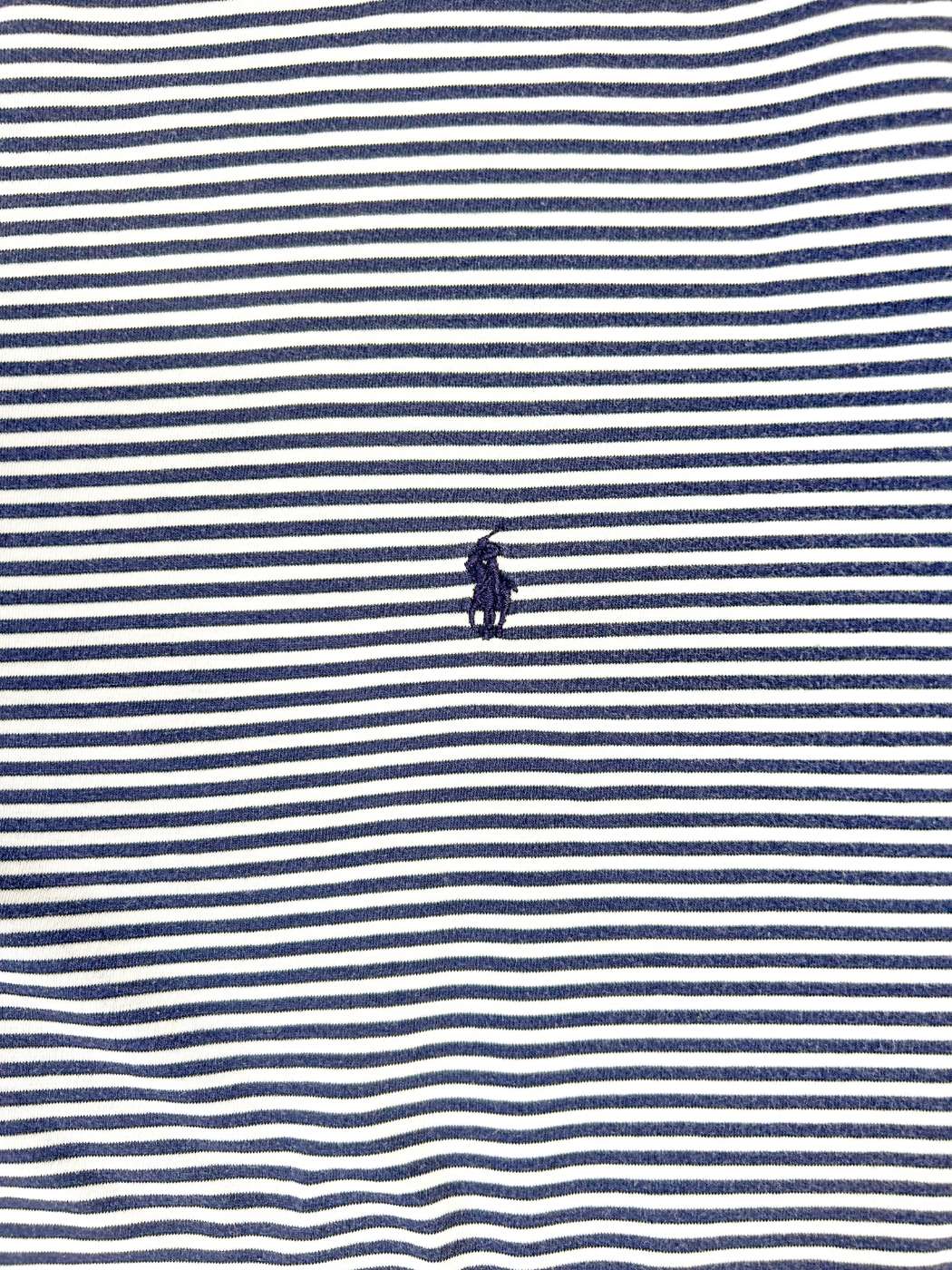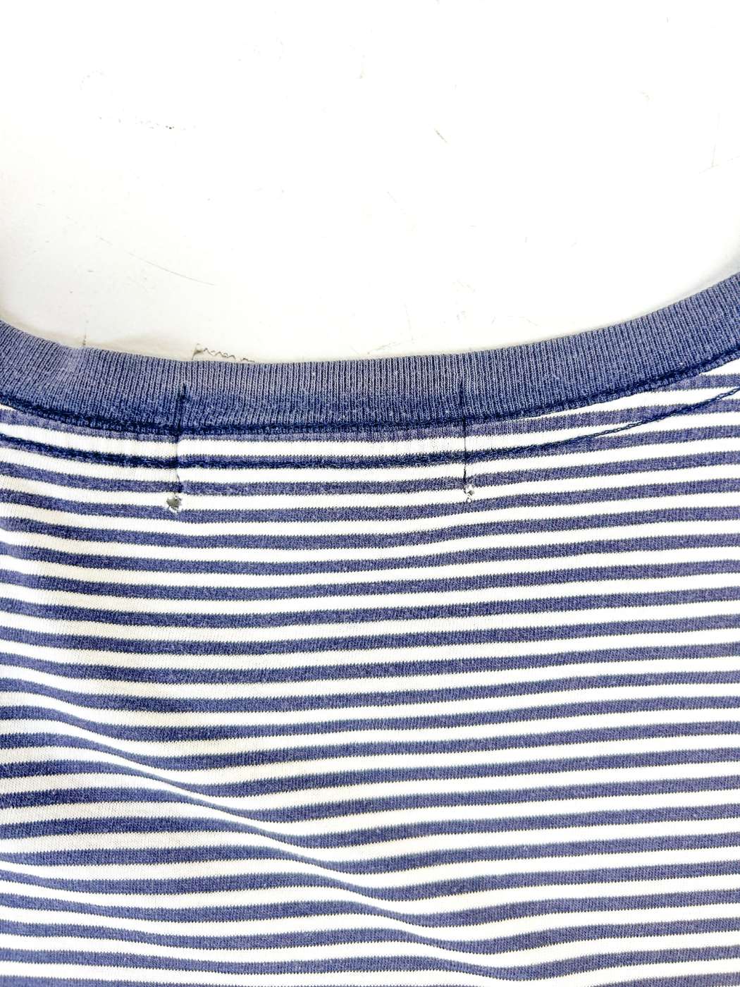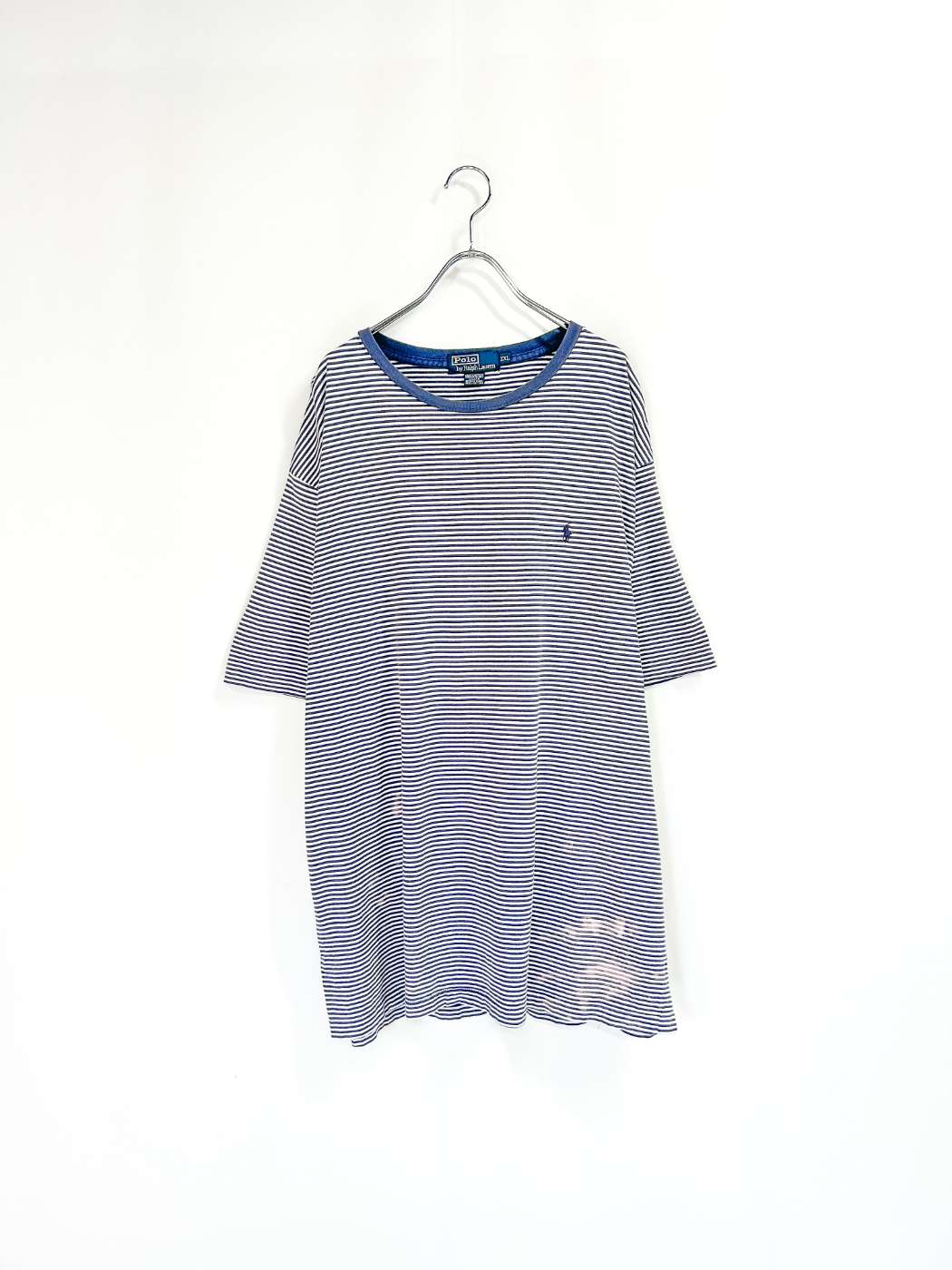 青の細かなボーダーでデザインされたTシャツ。ワンポイントのポニーの存在感があります。