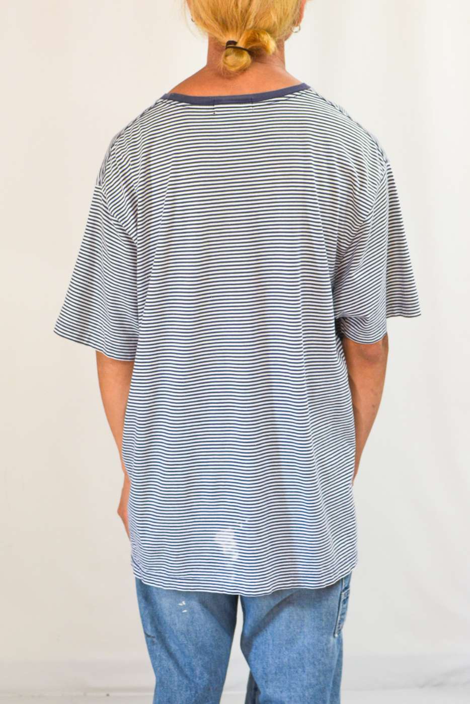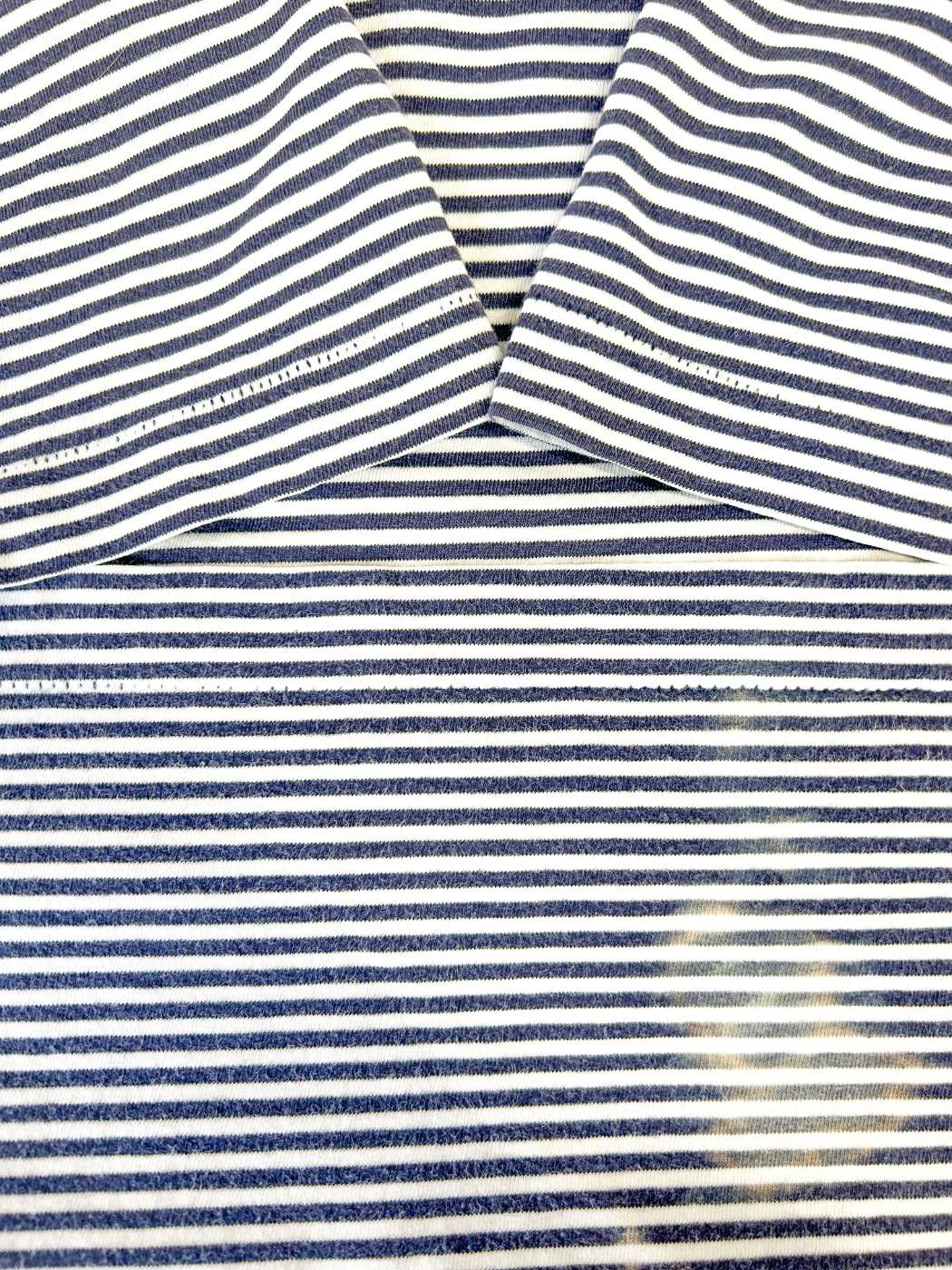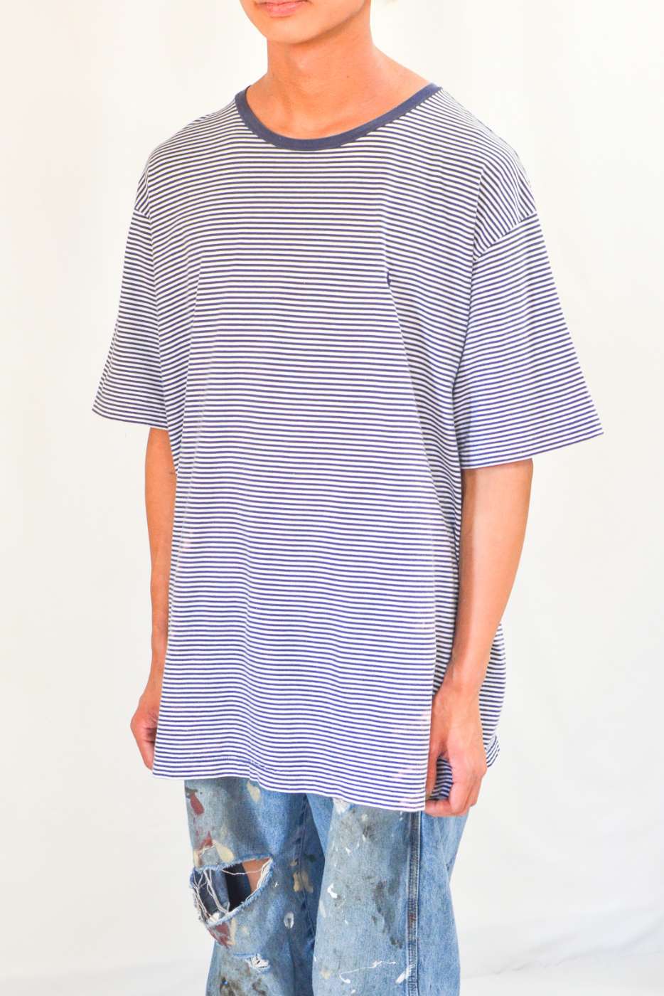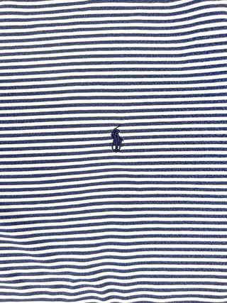 青の細かなボーダーでデザインされたTシャツ。ワンポイントのポニーの存在感があります。