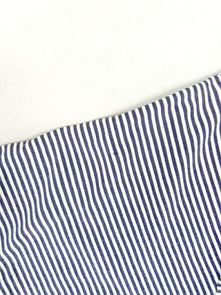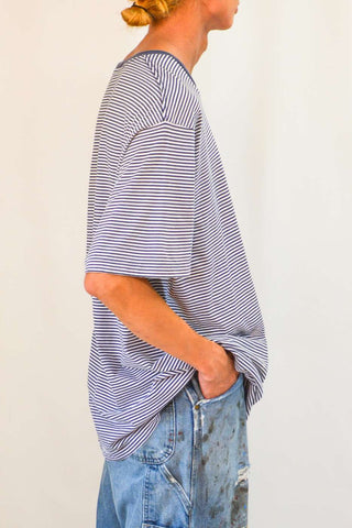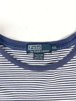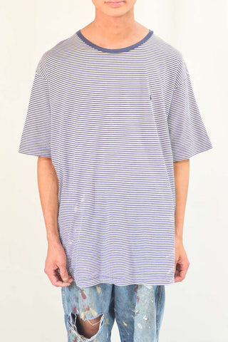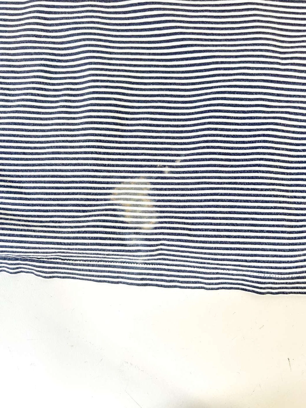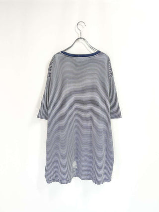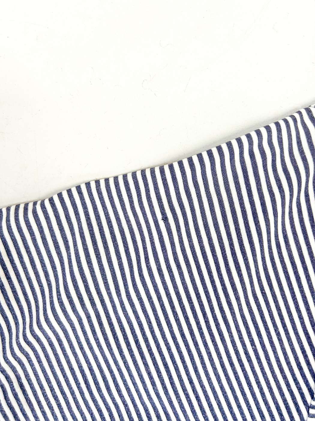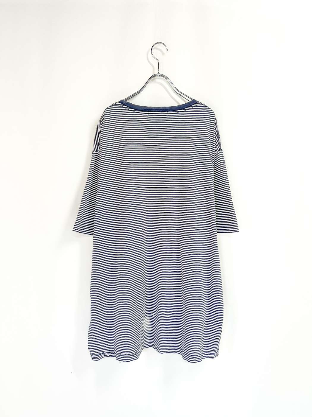 青の細かなボーダーでデザインされたTシャツ。ワンポイントのポニーの存在感があります。