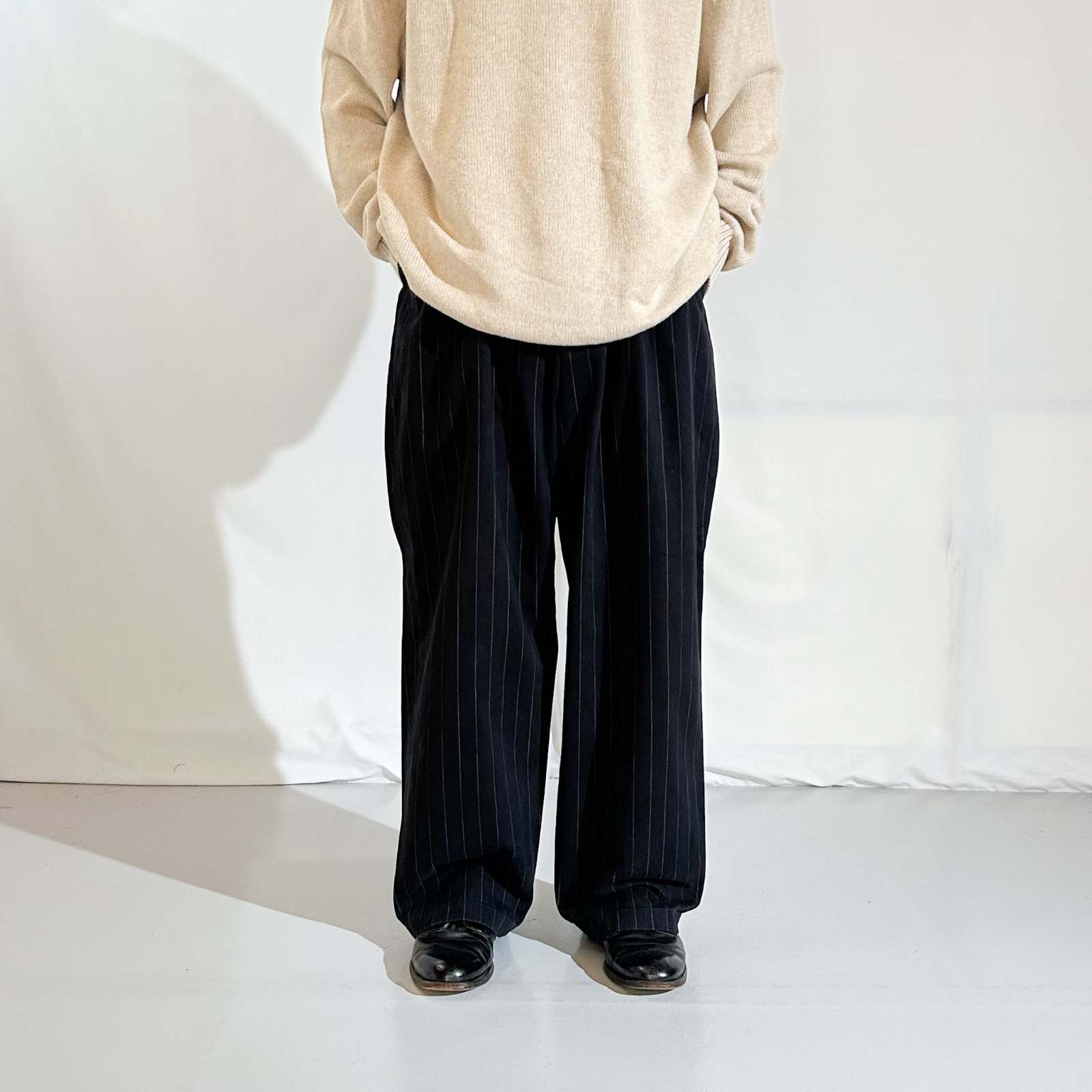 〈STRUCTURE〉のワイドスラックス。渡り幅39cm、裾幅27cmという圧倒的な極太ワイドシルエットが特徴です。ノータック仕様なのでウエストから裾にかけてズドンと落ちるストレートラインが強調され、存在感抜群。クラシックなピンストライプ柄が入り、シルエットの迫力に上品さをプラスしています。シンプルにTシャツでラフに合わせても良し、シャツやジャケットでドレッシーに寄せても良し。ワイドパンツ好きにはたまらない一本です。