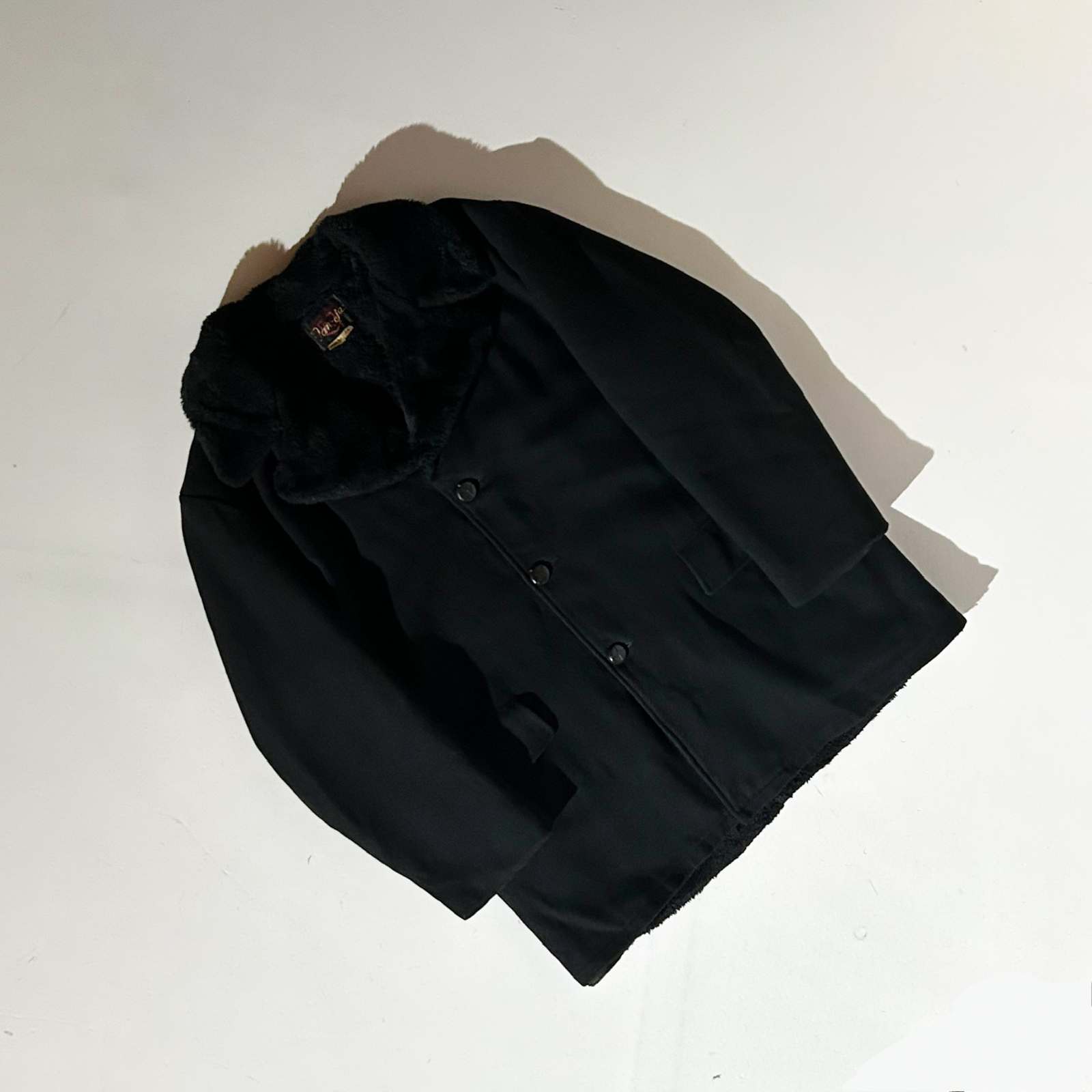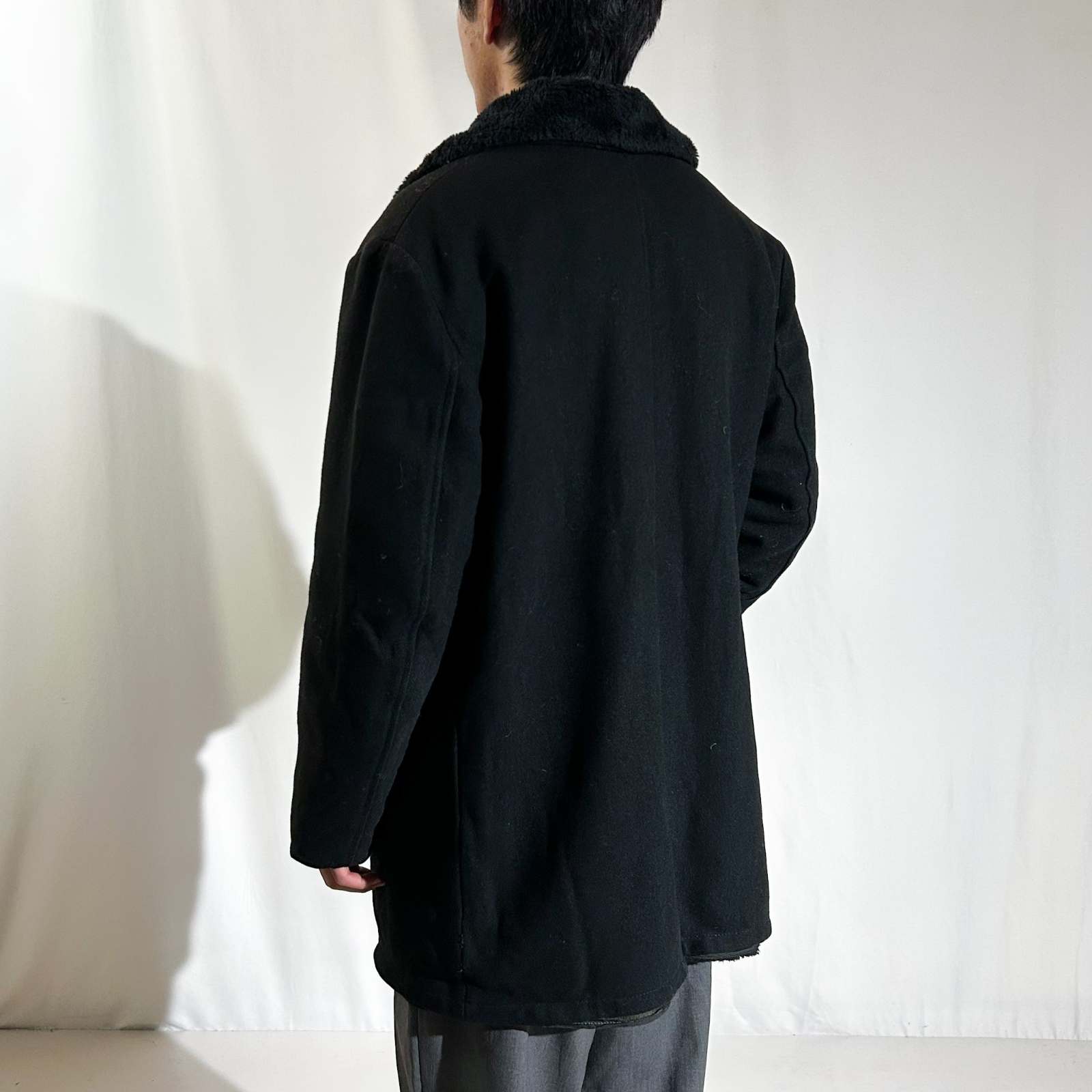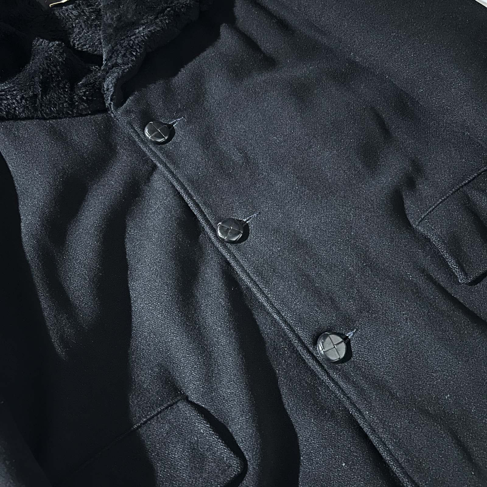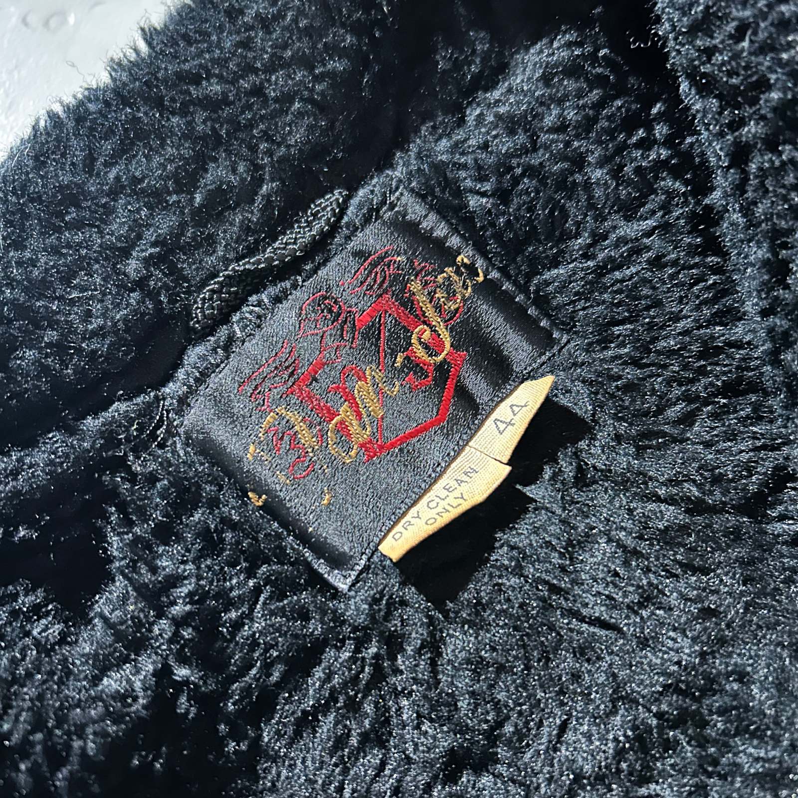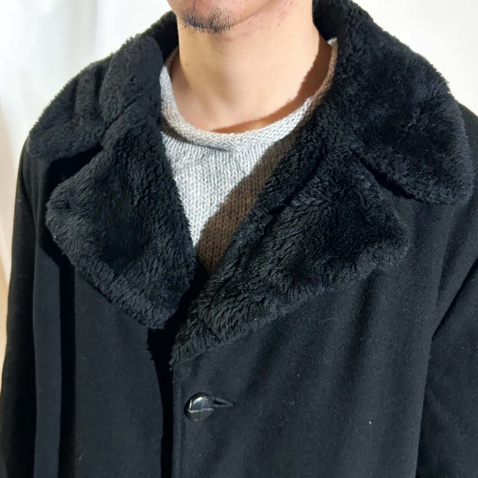 通称''不良''のコート。 首を大きく覆うようなショールカラーのボアとオールブラックの肉厚なウールボディ。 ブランドタグとユニオンチケットから恐らく60年代頃かと思われます。 裏もボア仕様となり保温性もある実用性あるデザイン。