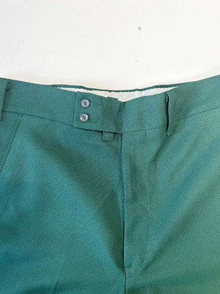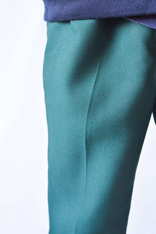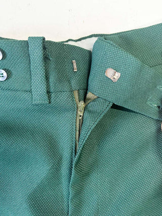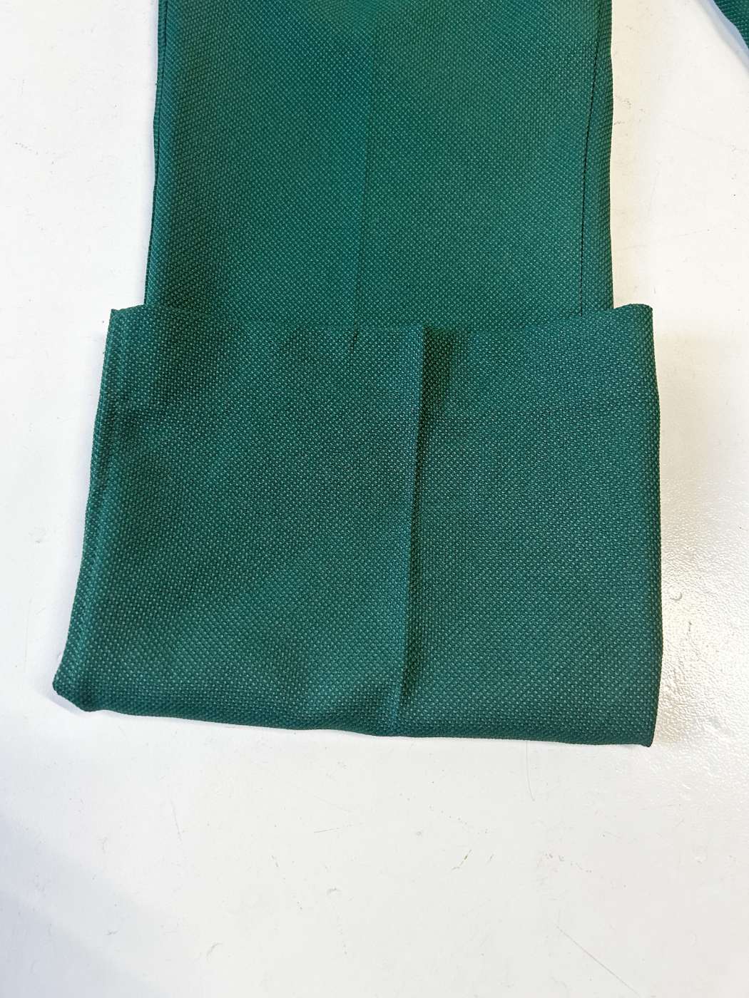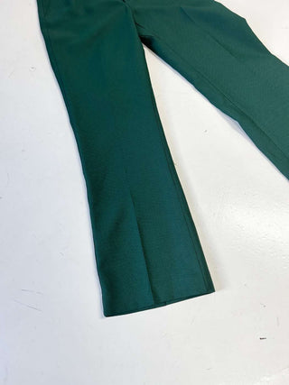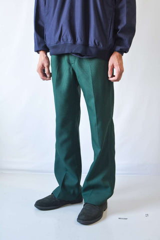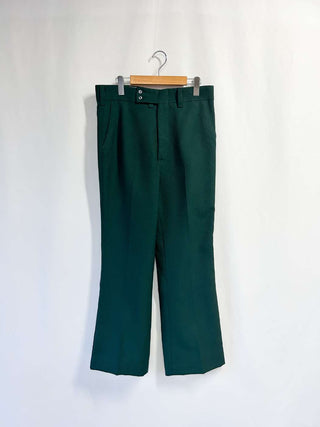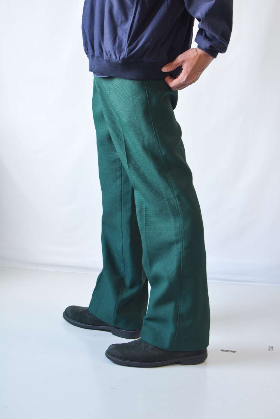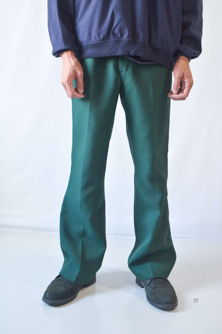 色味のいい緑のフレアパンツ。ポリエステルで軽く動きやすいです。