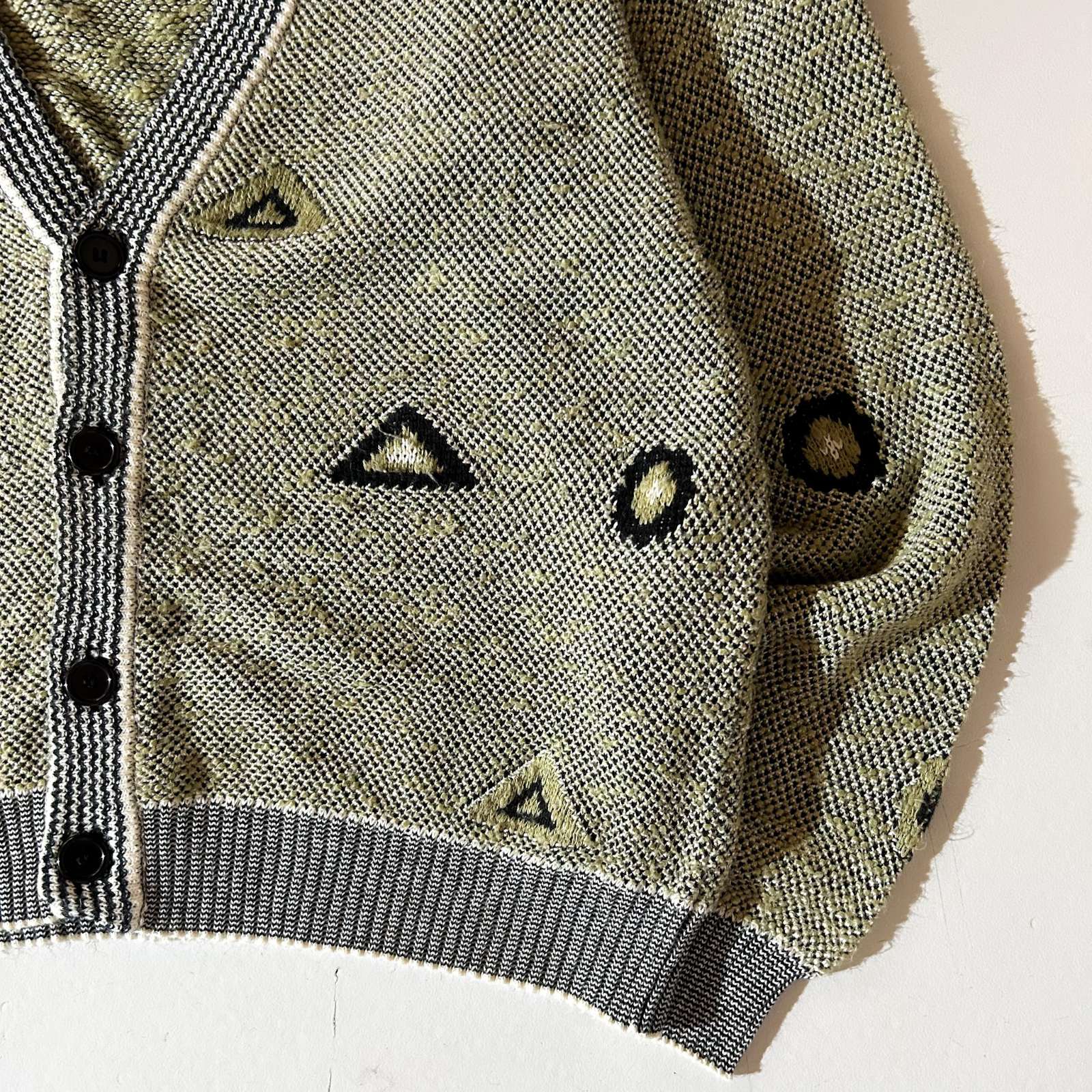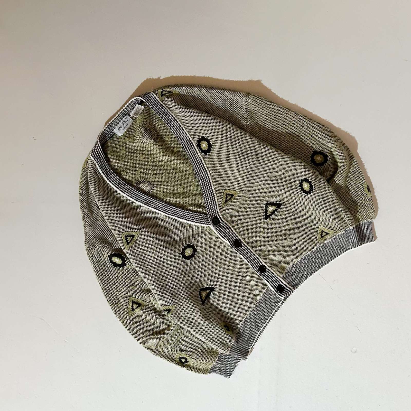 80年代Da vinciのニットカーディガンになります。こちらのブランドはビンテージモチーフだったり、いいデザインが多い印象です。まず、タグの名前だけでもかっこいい。薄めの緑に幾何学模様が散りばめられ、リブのラインも相まって古い雰囲気を感じます。アームの太さやリブの効きもあって状態がとてもいいです。 コットンも少し入ってる事で、毛玉も出来にくいですし、適度な重みもあって求めていた最高なカーディガンです。
