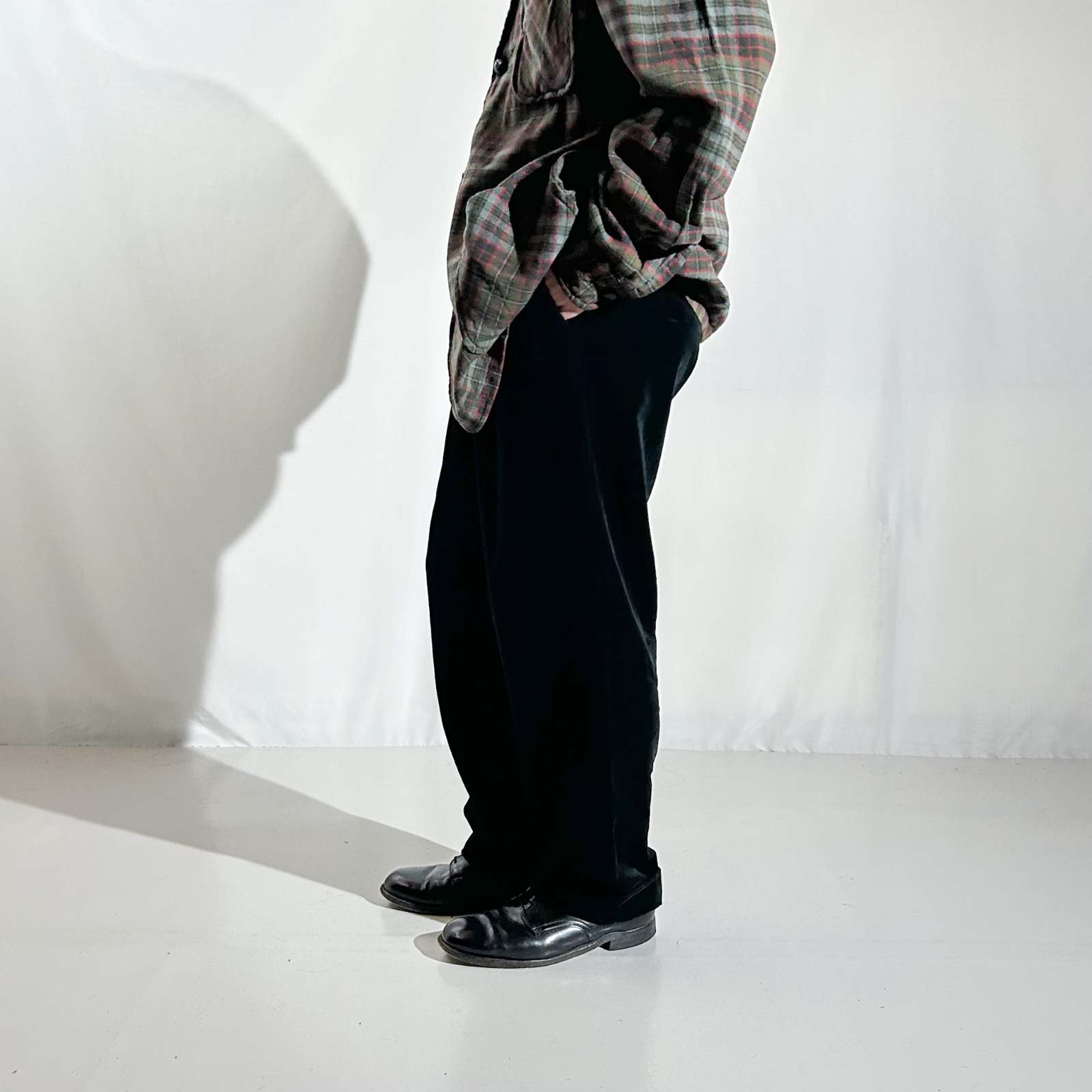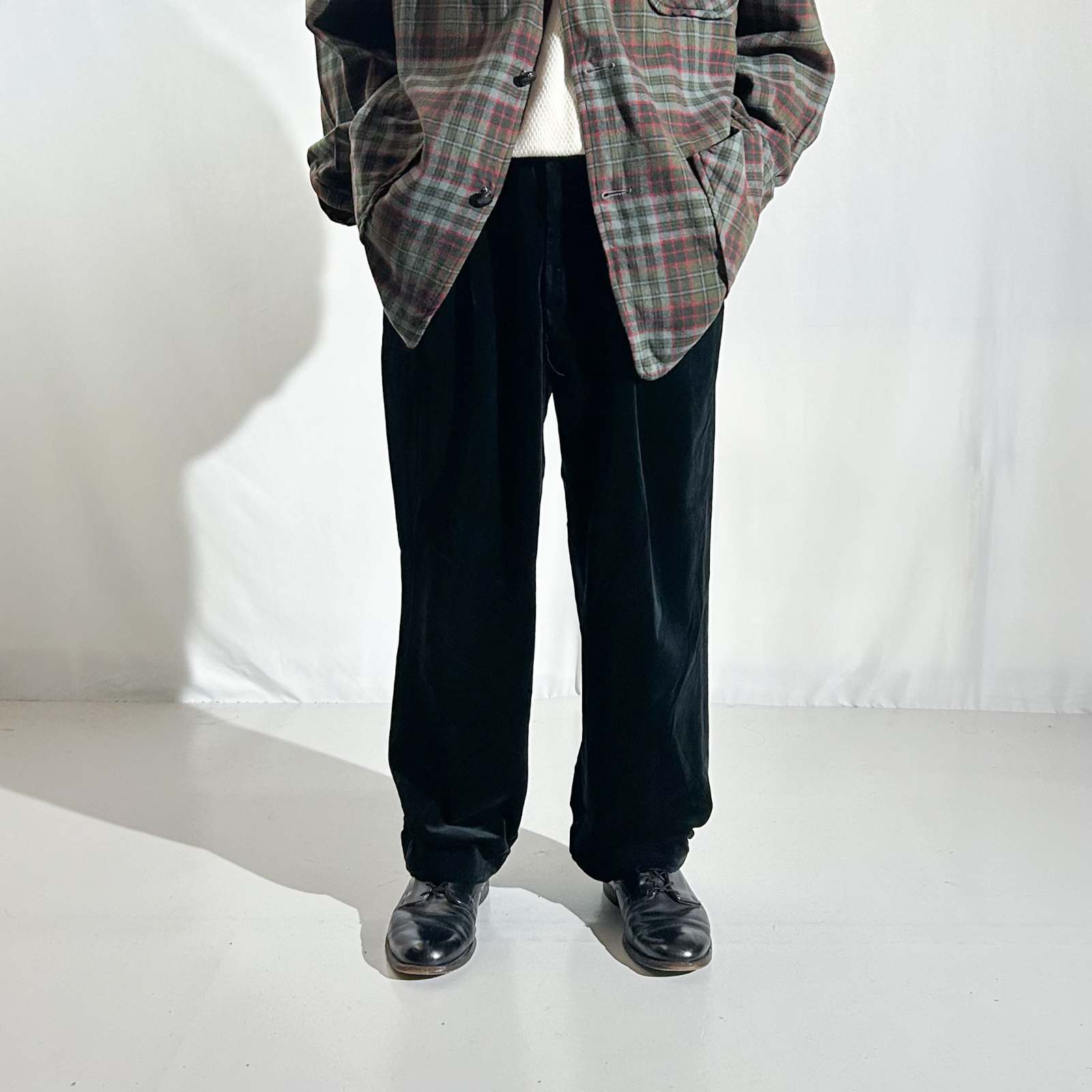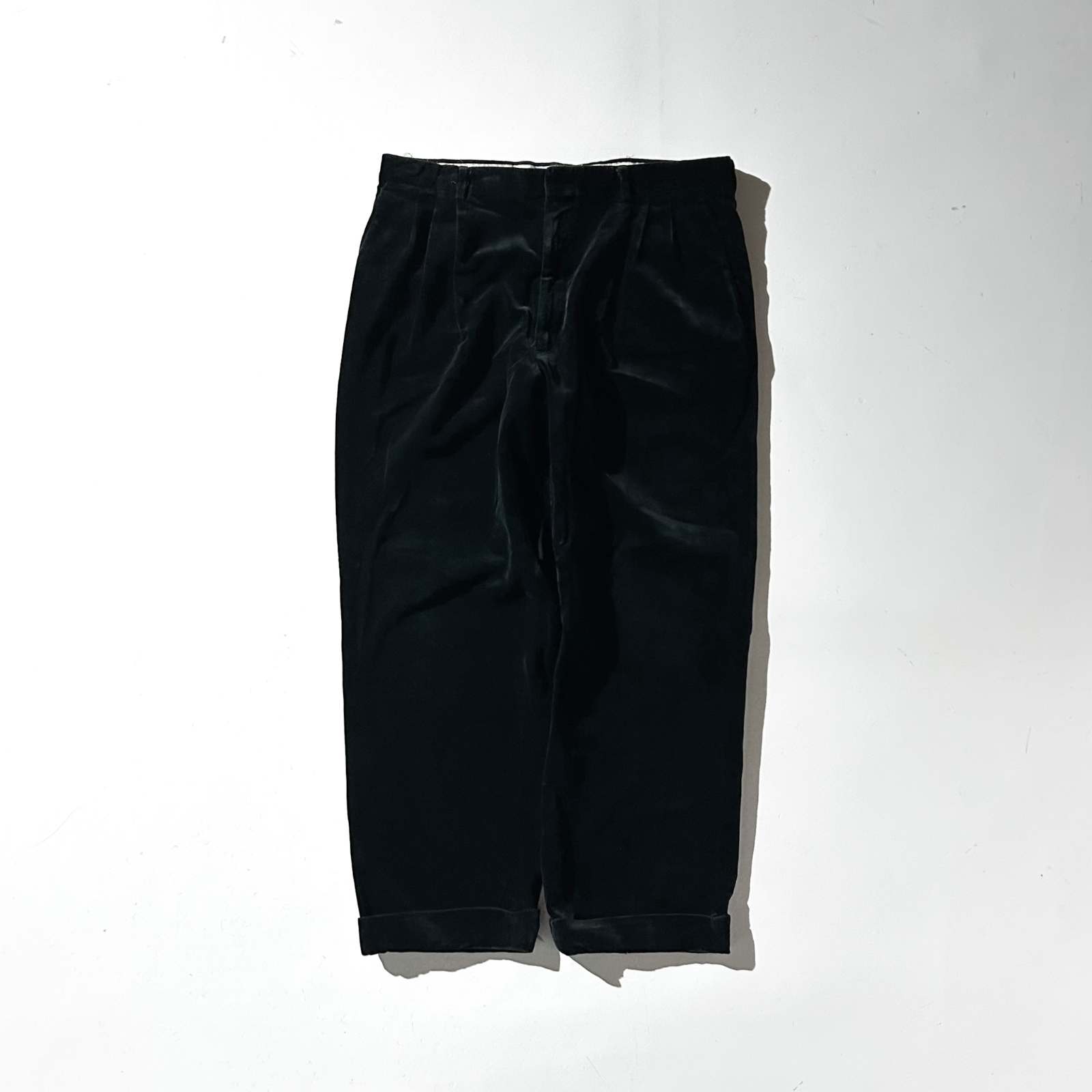 去年は開催しなかった周年イベントですが、 今年は「せっかくだしちょっとやってみようか」という軽いノリで企画してみました。 “グリーフルオンラインストアらしい” ——ちょっと気になる、ちょっと良いものたちを中心に。 派手ではないけれど、「これ出るの珍しいね」と思えるアイテムを少し仕込んでいます。 こちらはその中でも特に珍しい、ベロアの3タックスラックス。 古着市場でもなかなか出てこない「探すのが難しすぎる系」の一本。 程よい光沢とドレープ感があり、上品ながらもどこかヌケ感のある雰囲気に仕上がっています。 タックが入ることで腰回りに立体感が出て、シルエットも綺麗。 ニットやシャツ、レザーなど秋冬の素材感とも相性抜群です。
