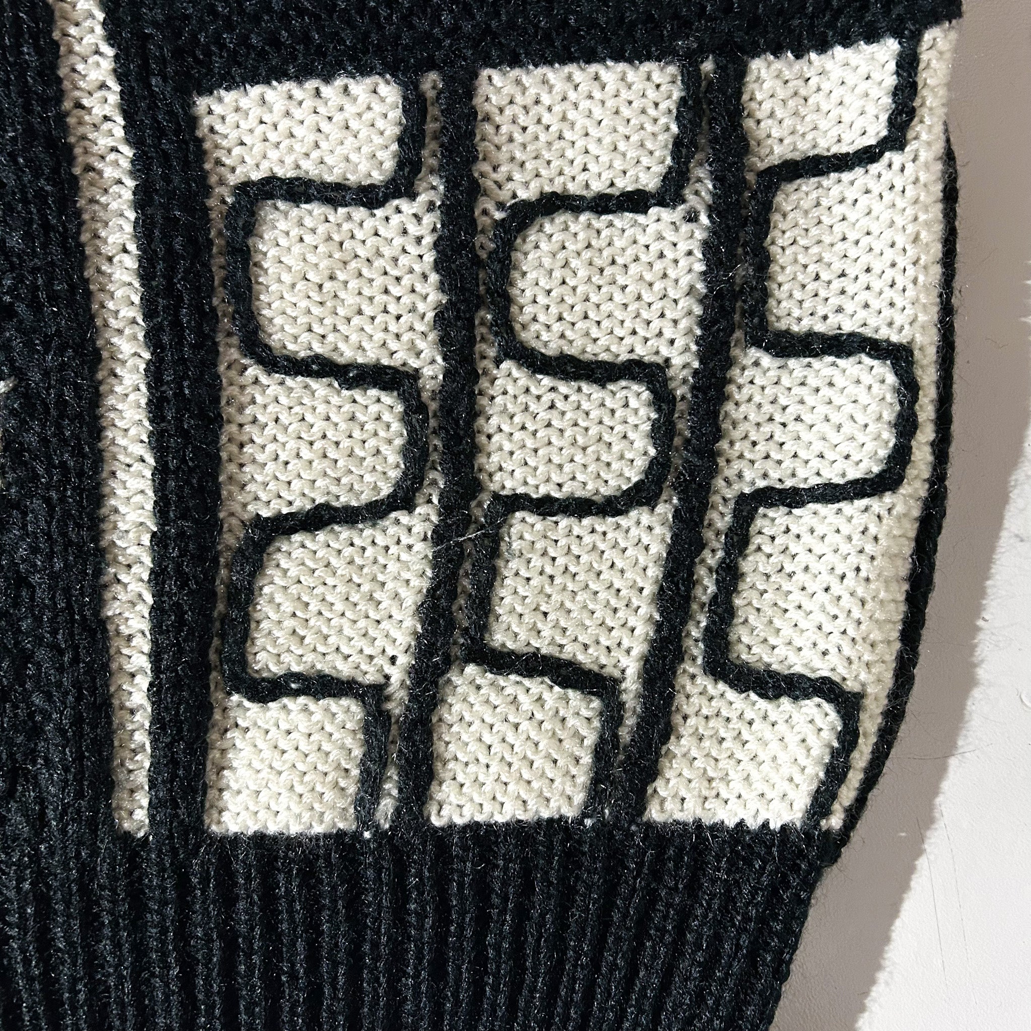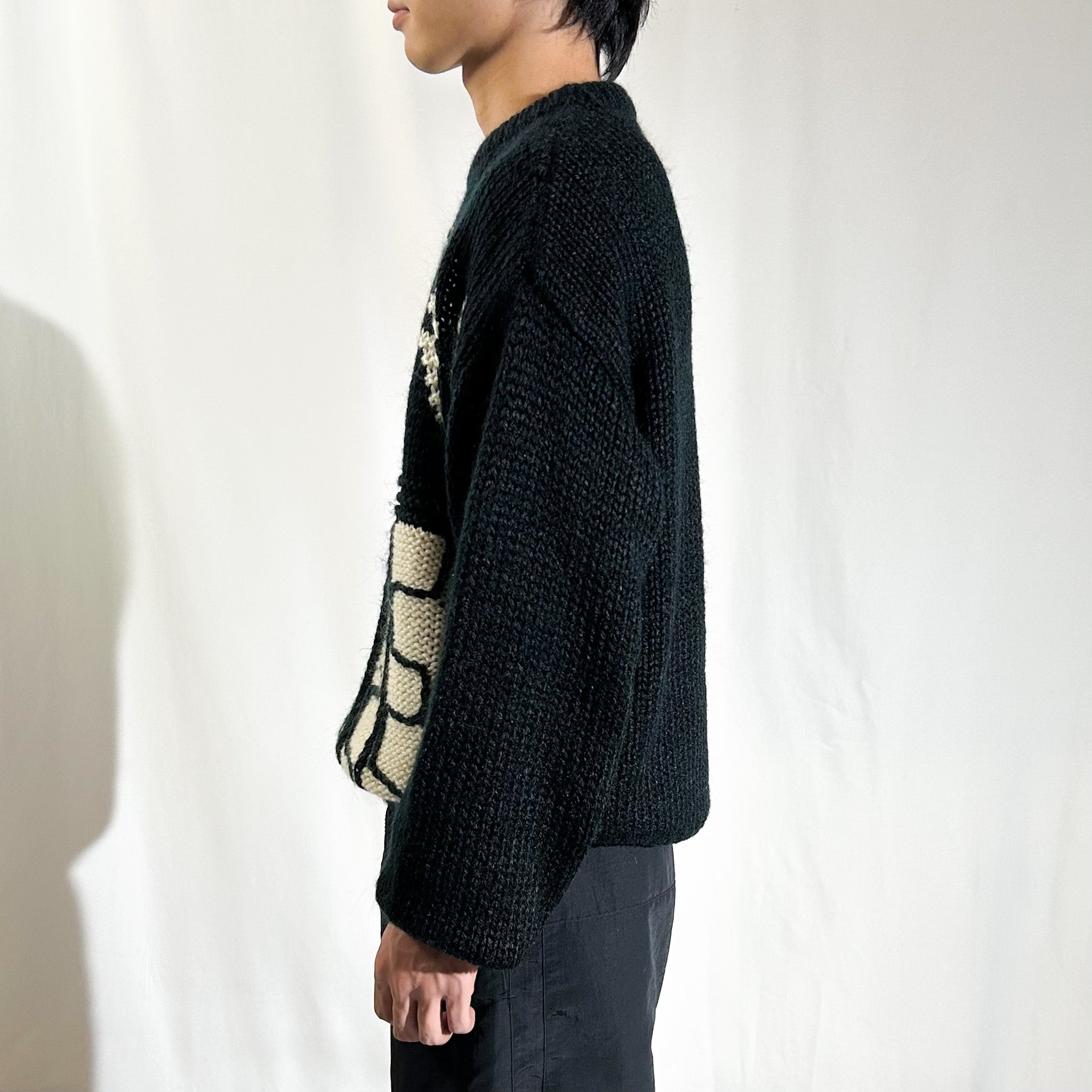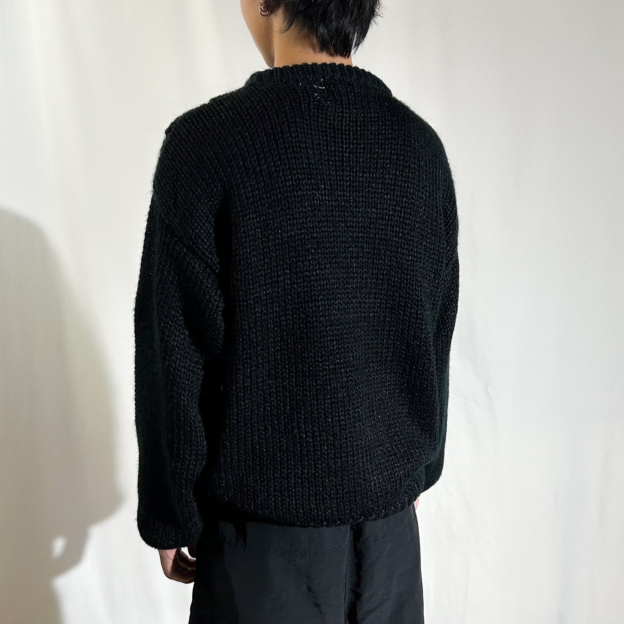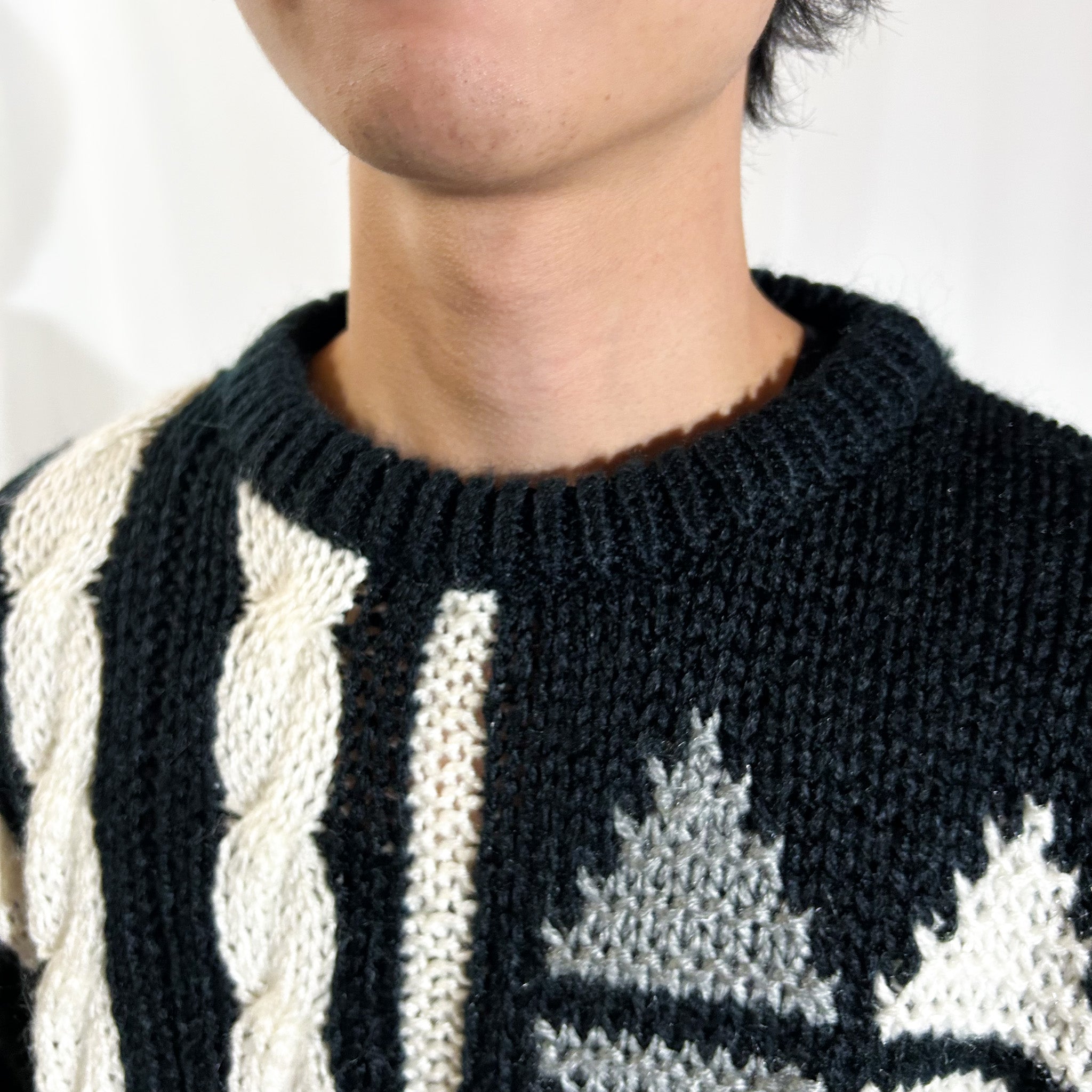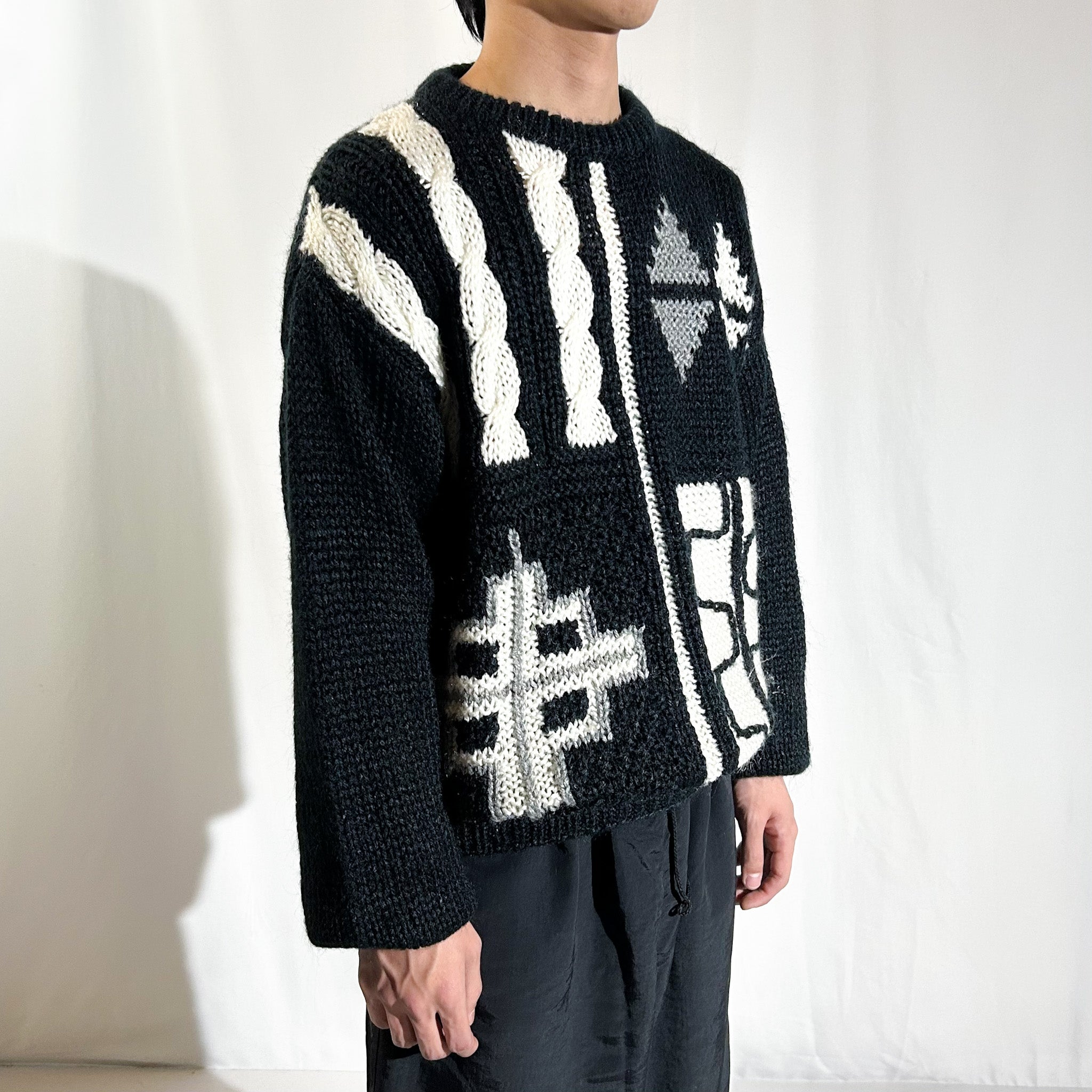 【Webスタッフ奥野おすすめ商品】ウールニットのように太めの毛糸で編まれたアクリル生地が特徴的なこの手のニット。ウールよりも軽い質感でボリュームのあるシルエットに幾何学のような柄がおすすめの1枚。太めのスラックスに合わせて、少し大きめに、インナーにスウェットフーディーでも。