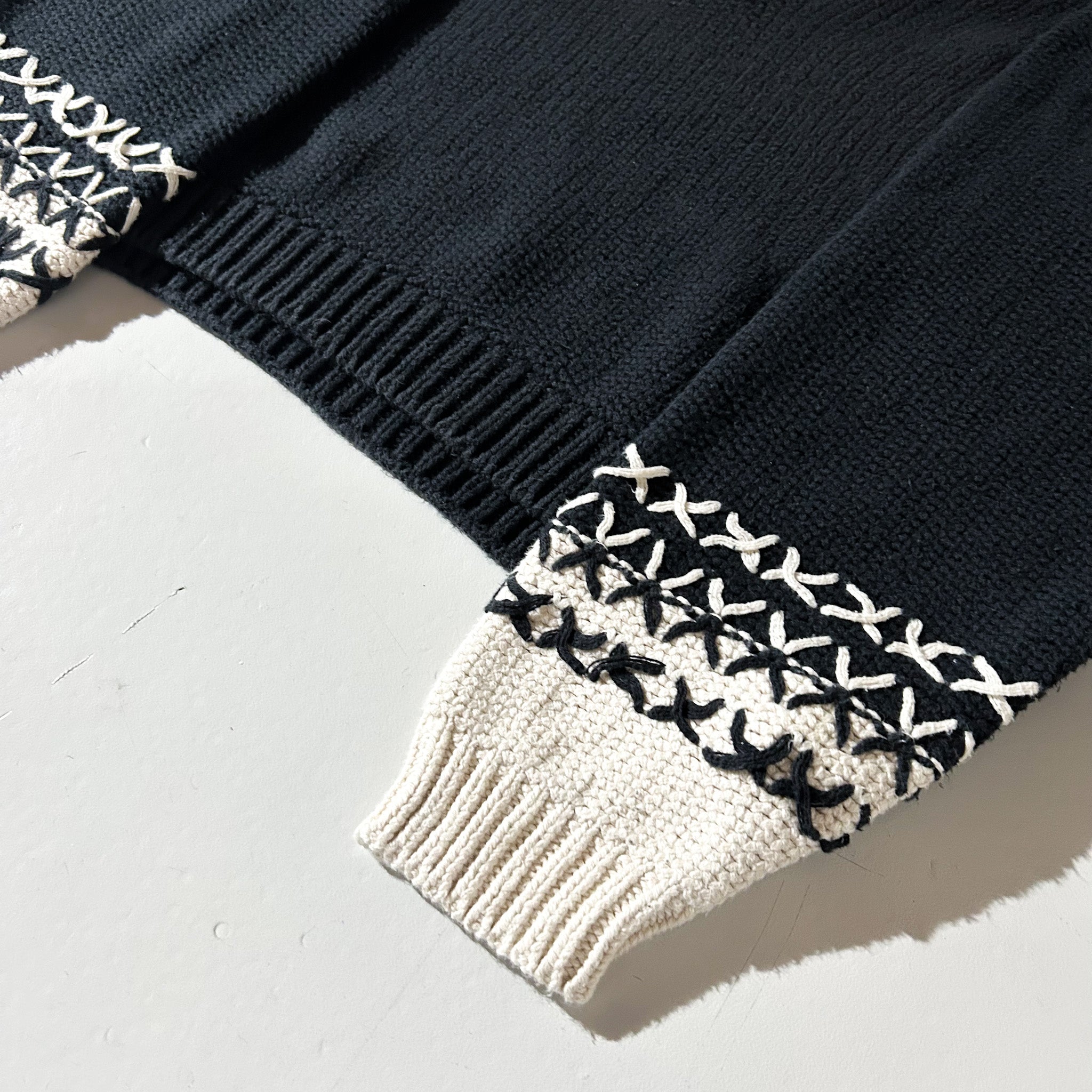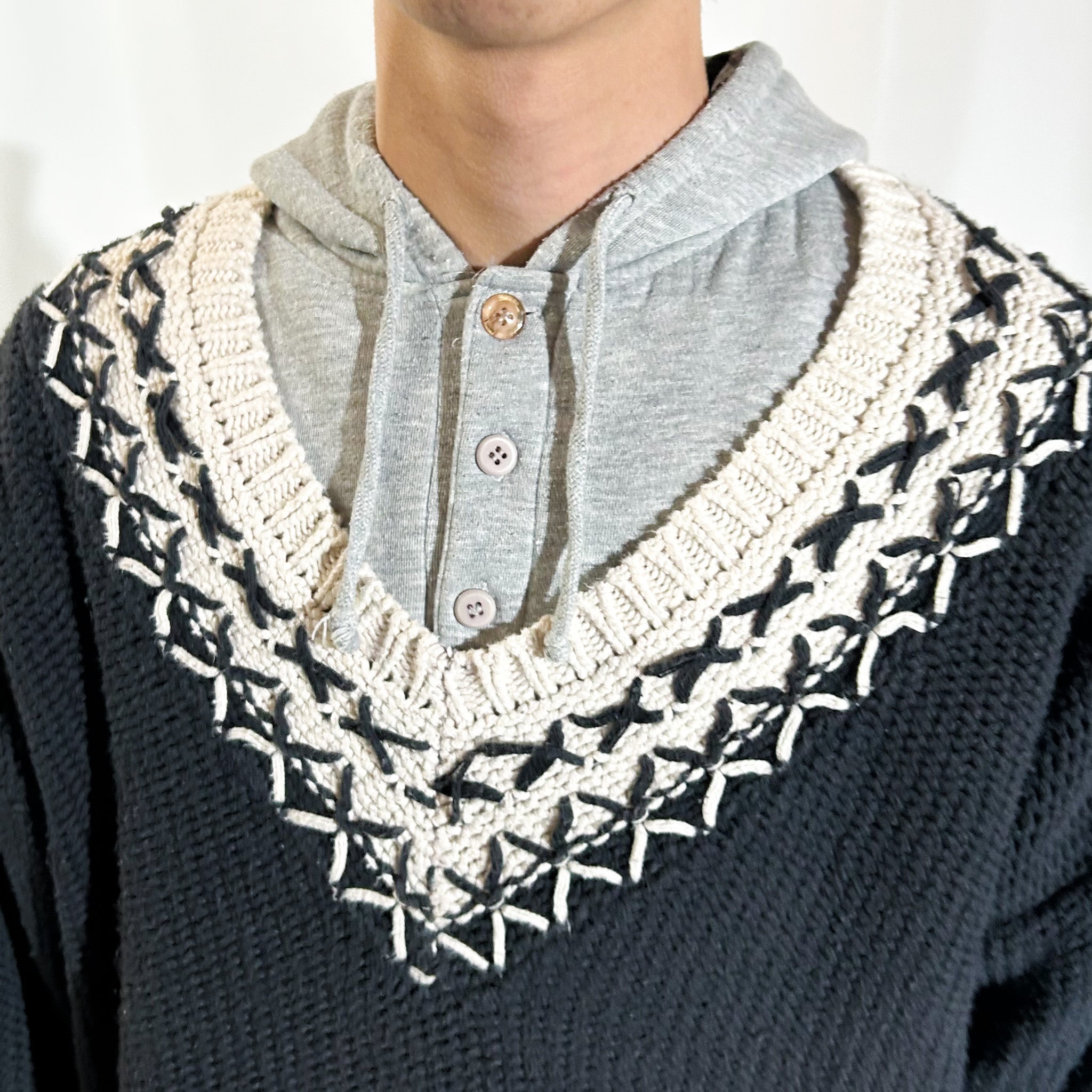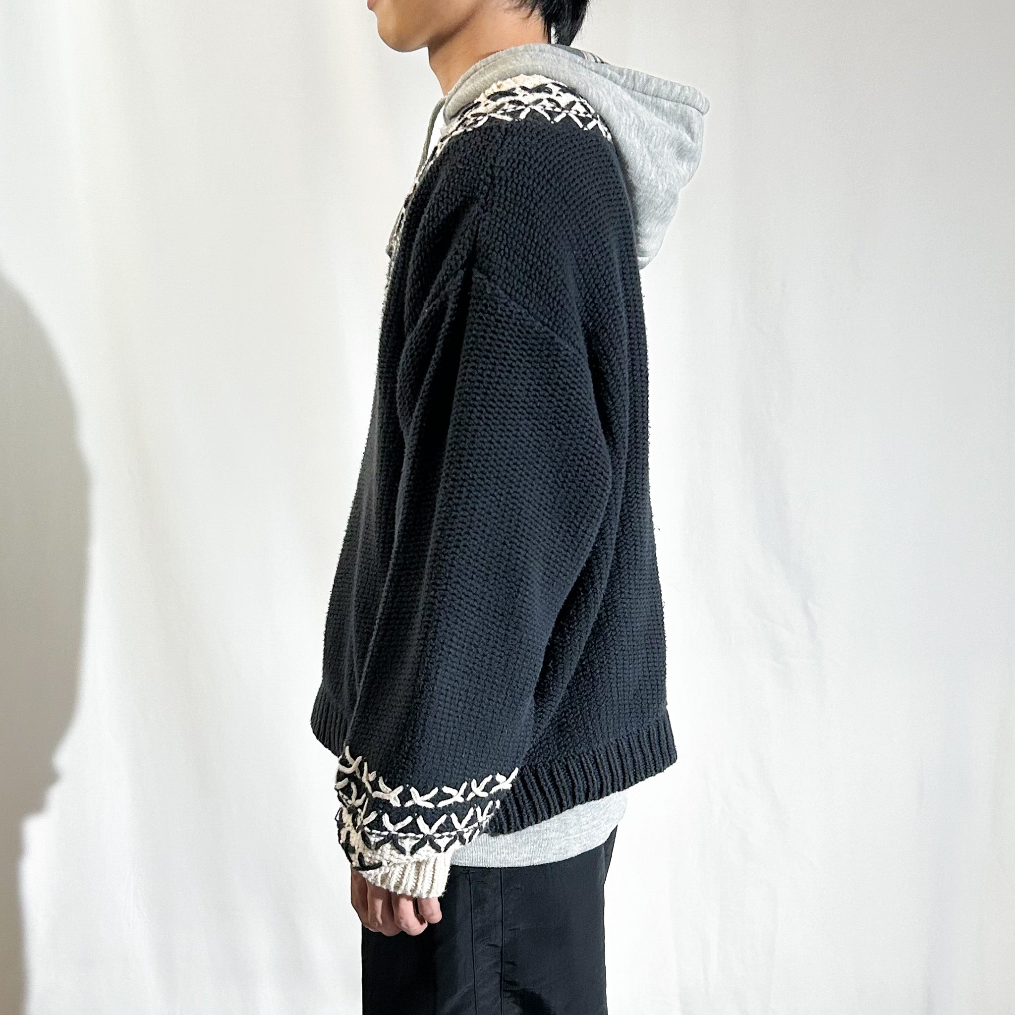 【Webスタッフ奥野おすすめ商品】個人的に好きなアイテムのチルデンニット。トラッドできちっと着る印象のアイテムだからこそ、少し緩めなサイズ感でアンバランスさを出すのがおすすめ。フーディーとのレイヤードでも、シャツではなくカットソーをインナーに肩を落として。