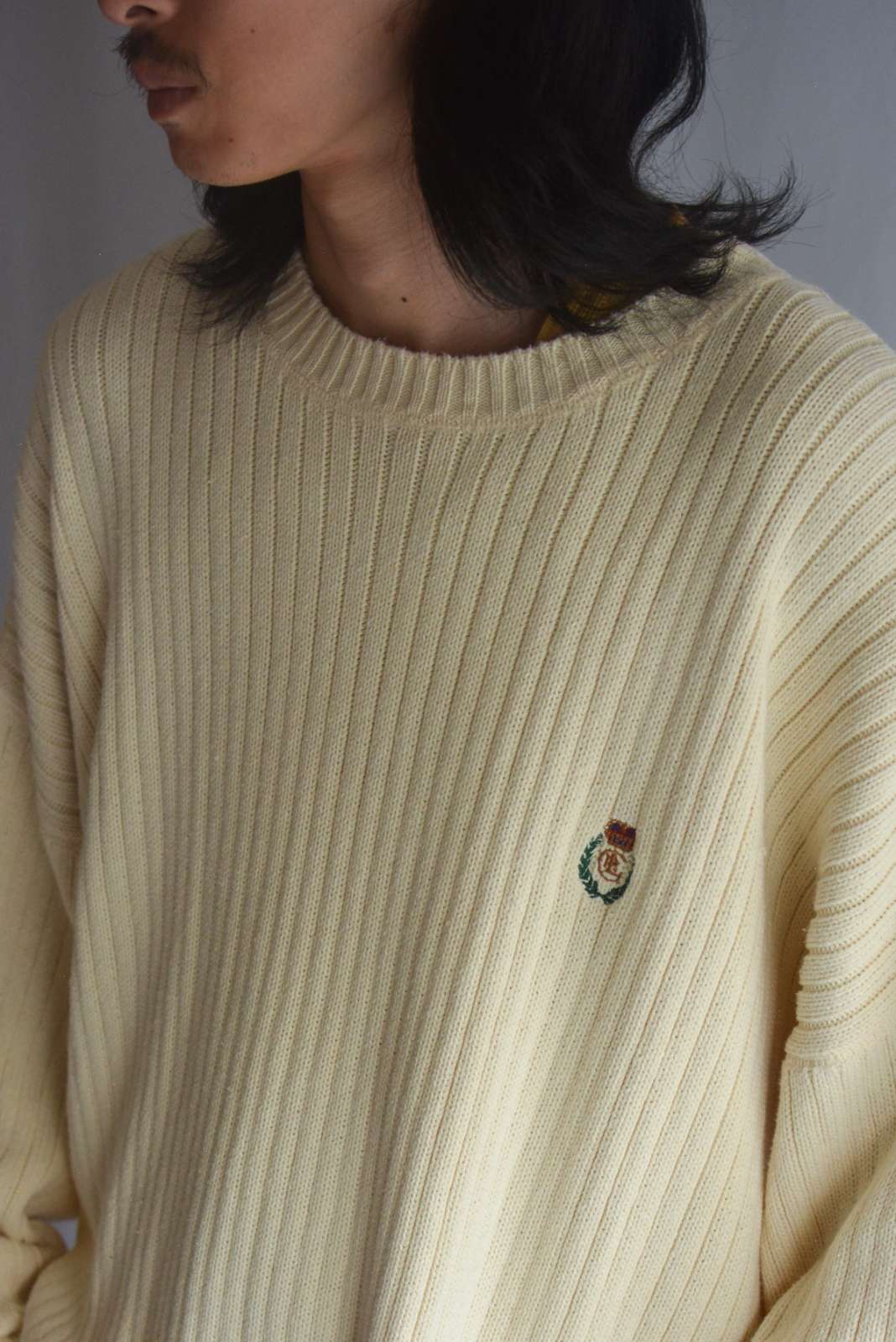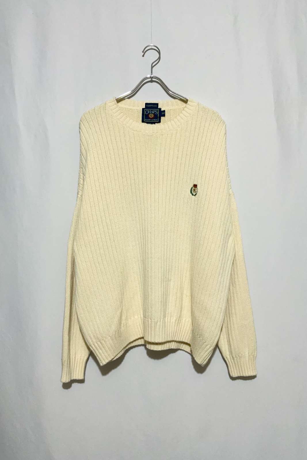 チャップスのワンポイントニットになります。 ドロップショルダーの為、肩に落ち感が生まれ、ラインに緩やかさや丸みのある綺麗なシルエットになります。抜け感のある印象を作りやすく、コーディネートの幅が広がりますね。 またコットンの為、ウールのようなチクチクさがないのが良い点ですね!