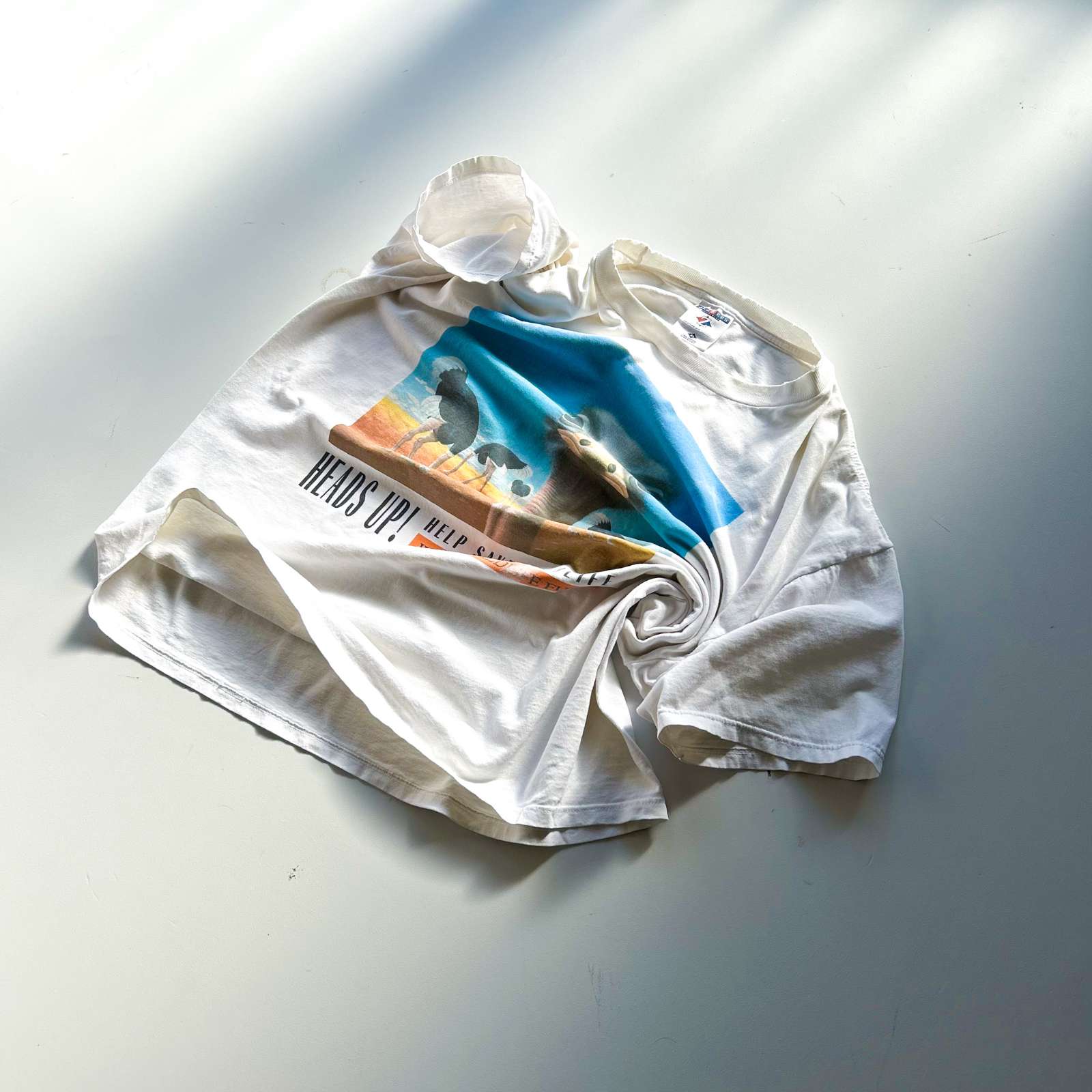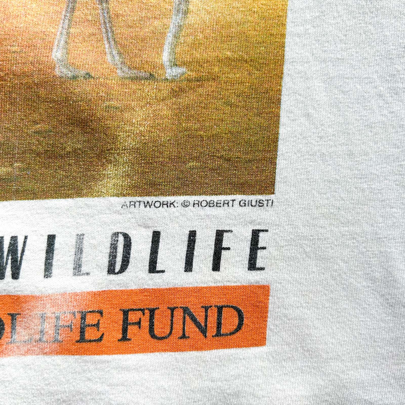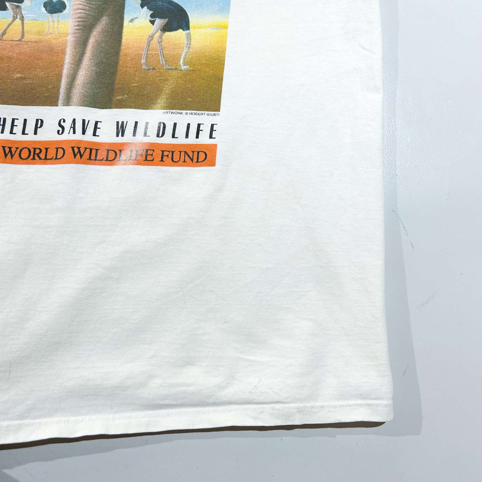 〈WWF(世界自然保護基金)〉による、環境・動物保護のメッセージが込められた啓発Tシャツ。 プリントには、地球温暖化や生態系の危機といった問題に対して「見て見ぬふりをせず、ちゃんと向き合おう」という意思が感じられる、静かなメッセージ性があります。 とはいえその重さを感じさせず、グラフィックのノリが良くてファッション使いしやすいのがこのTシャツの魅力。 そしてなにより珍しいのが「ダチョウ単体」の主役プリント。動物Tシャツは数あれど、ダチョウがメインというのはなかなか見かけません。これも啓発系Tならではのセレクトと言えるでしょう。