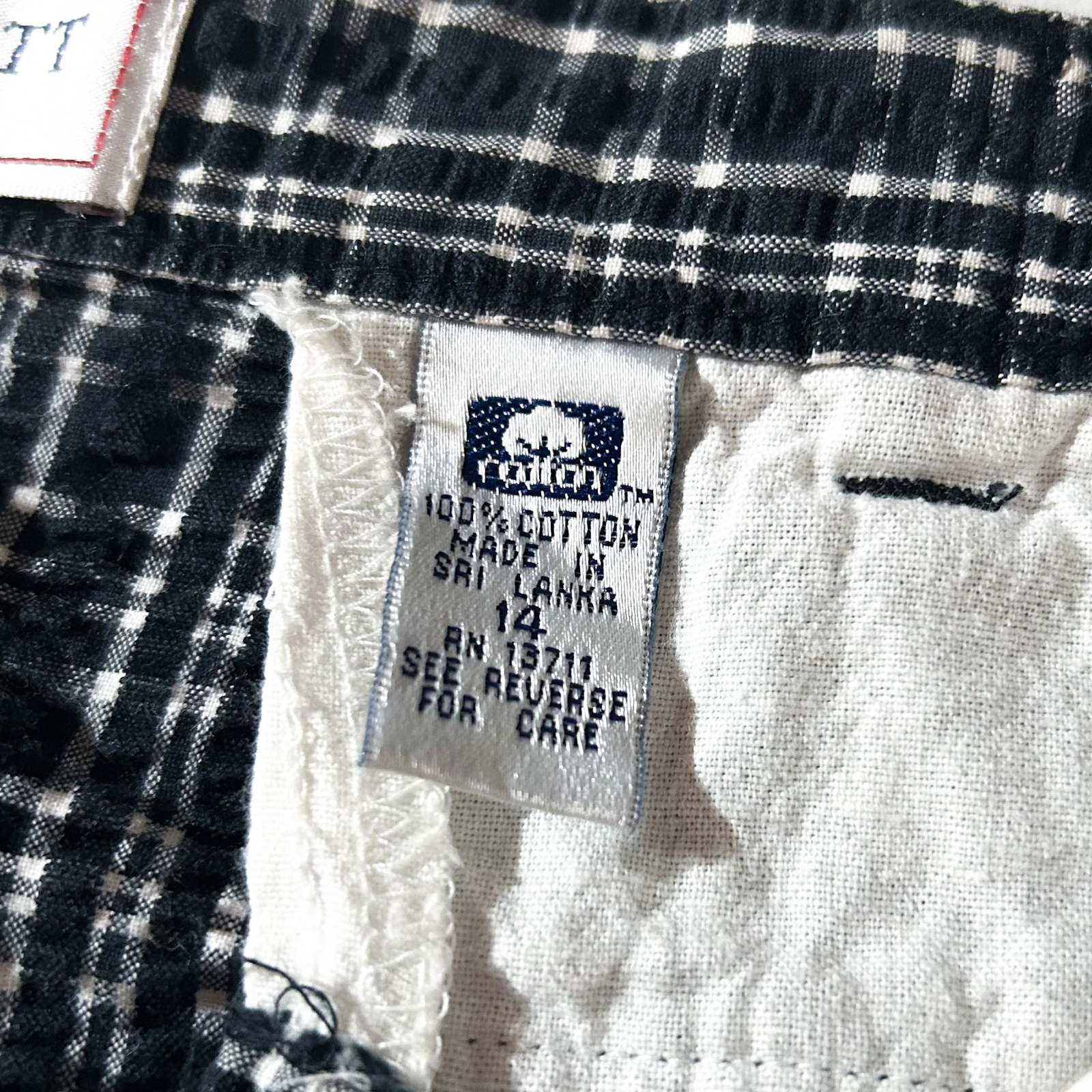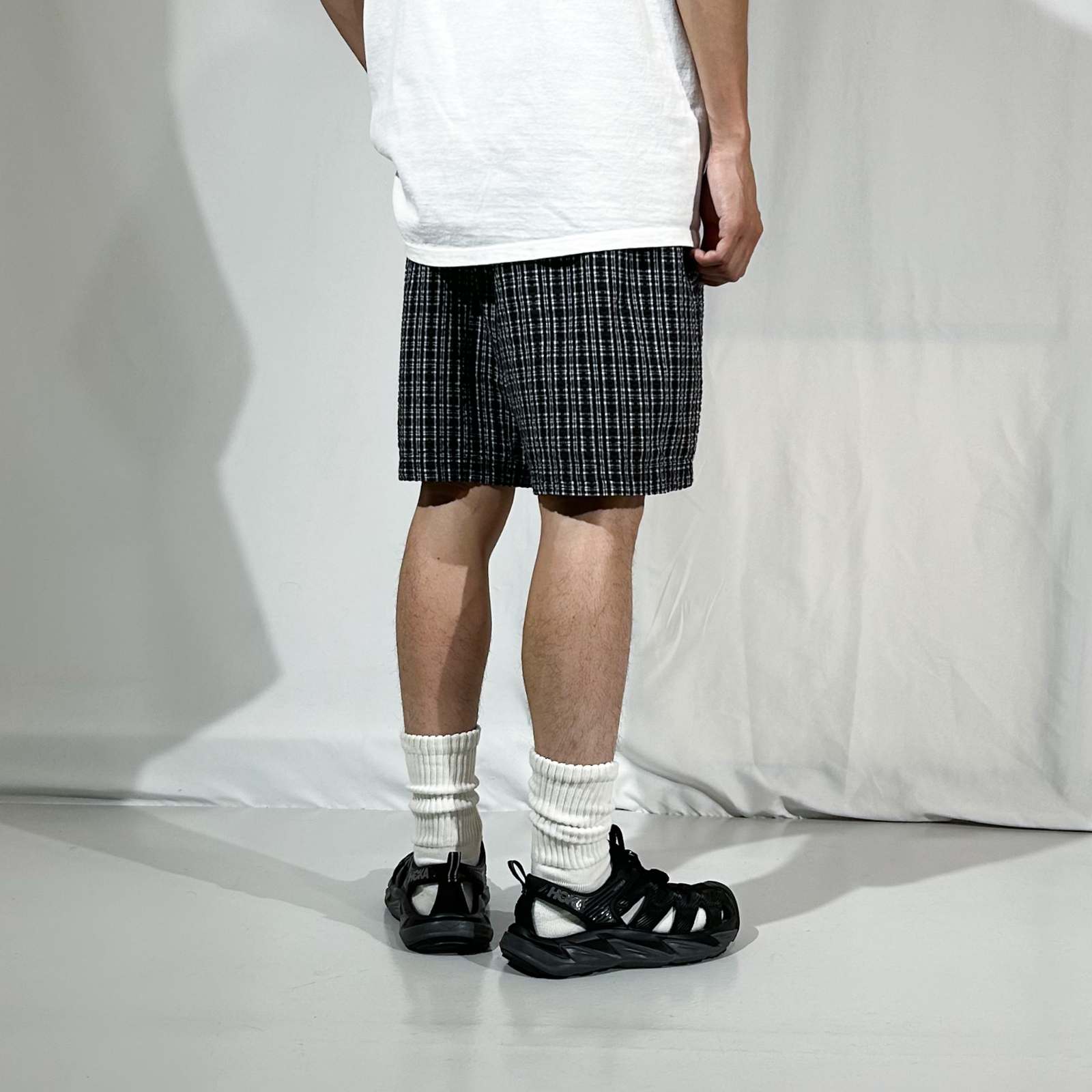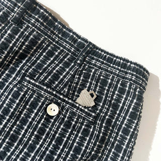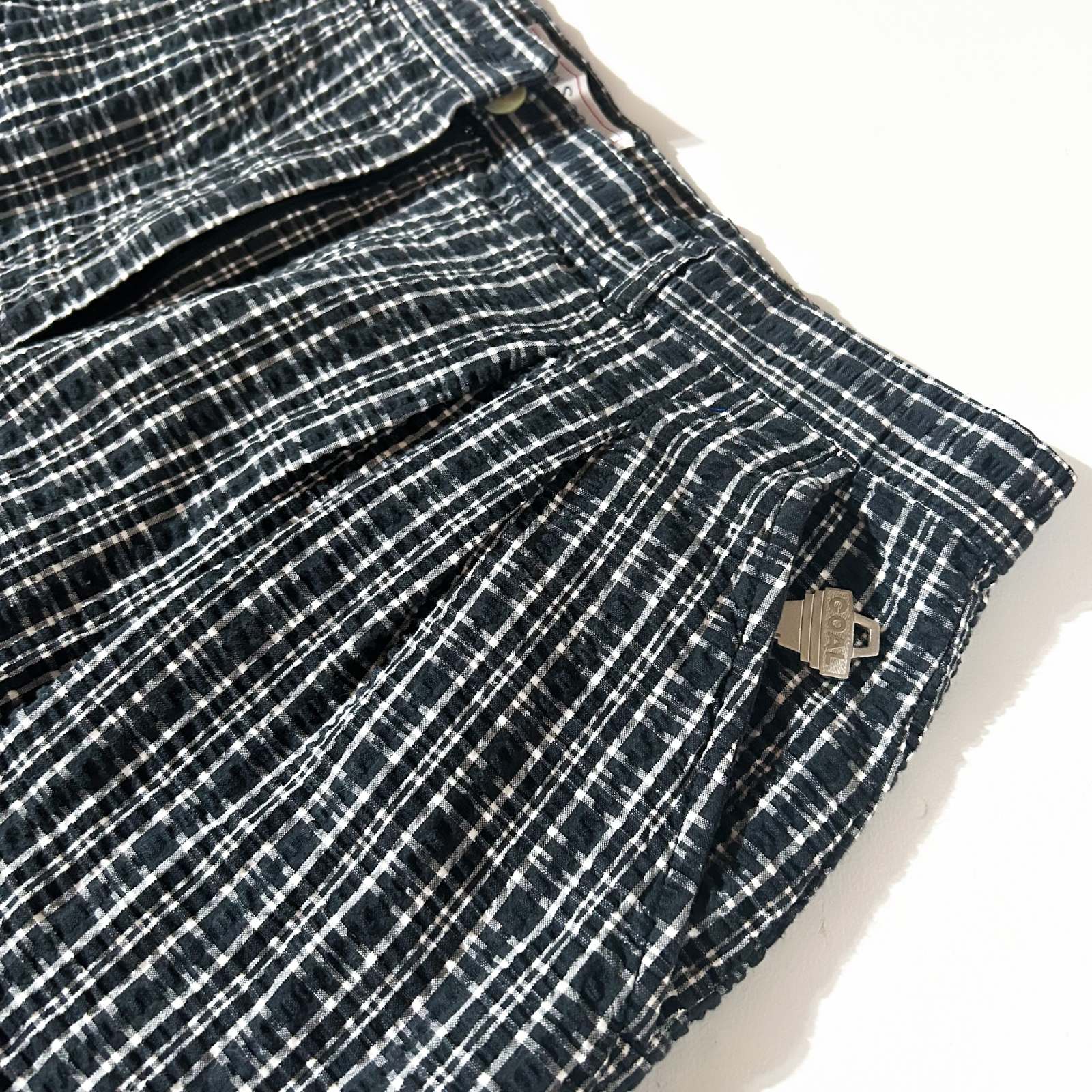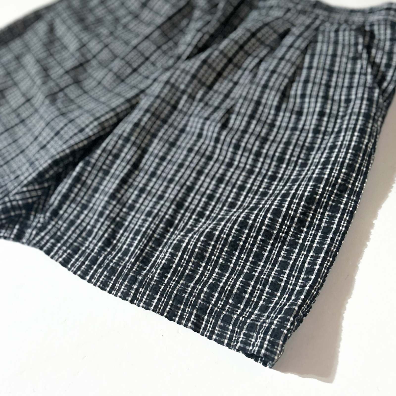 シアサッカー生地のチェックショーツ。カラーはブラックをベースに白の格子が入っています。シアサッカー生地で軽いのコットン100%でサラッとした肌触りが夏にぴったり。ちょっと腰パンして膝隠れるくらいに履きたい。個人的にはローファーと夏のシャツで合わせるのが好きですが、Tシャツだけでもしっかりおしゃれに見えるのが柄ショーツのいいところですね。90年代のこれくらいのチェックショーツ探そうと思っても意外とないんですよね。