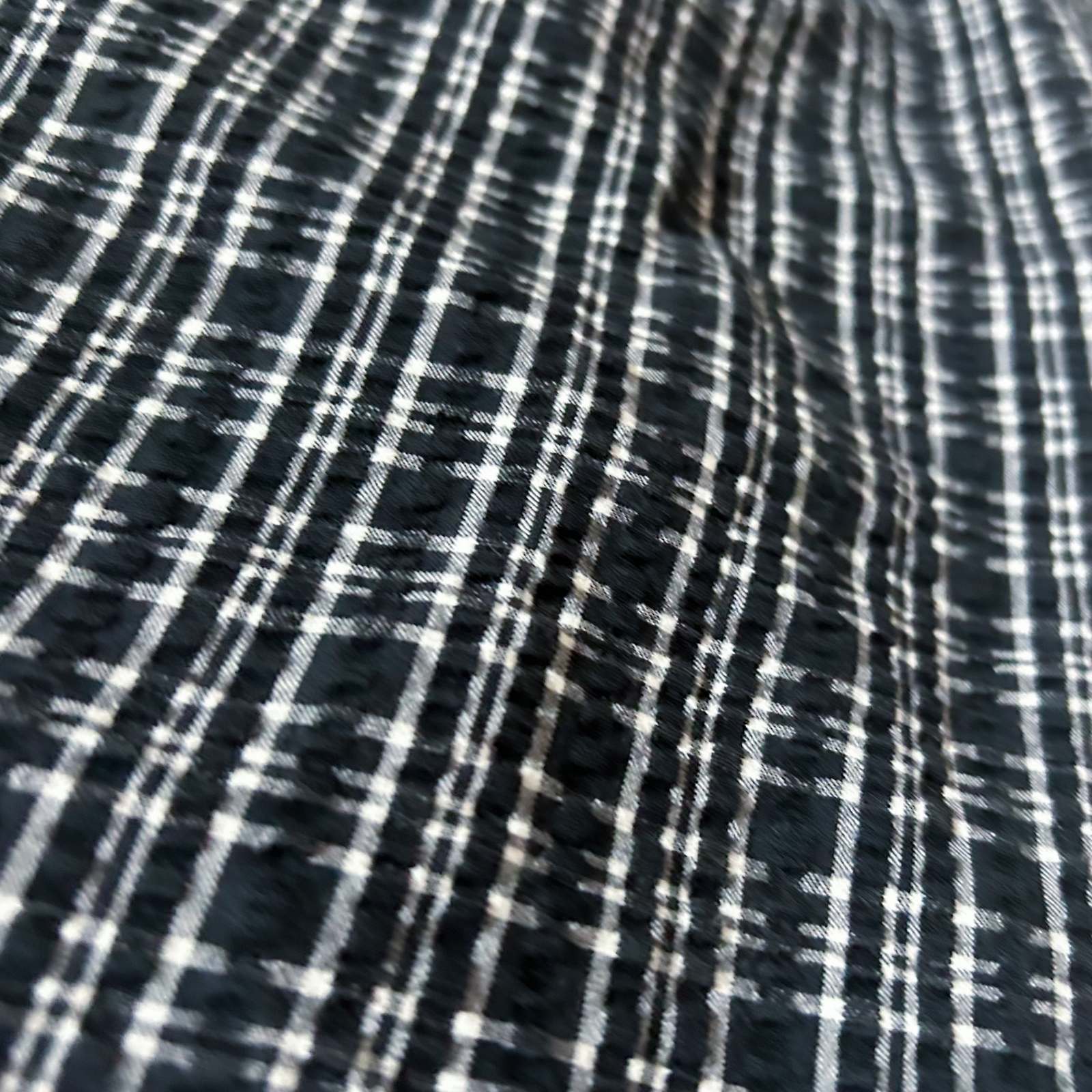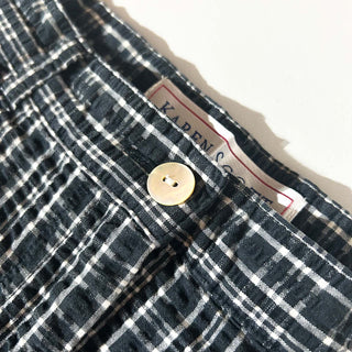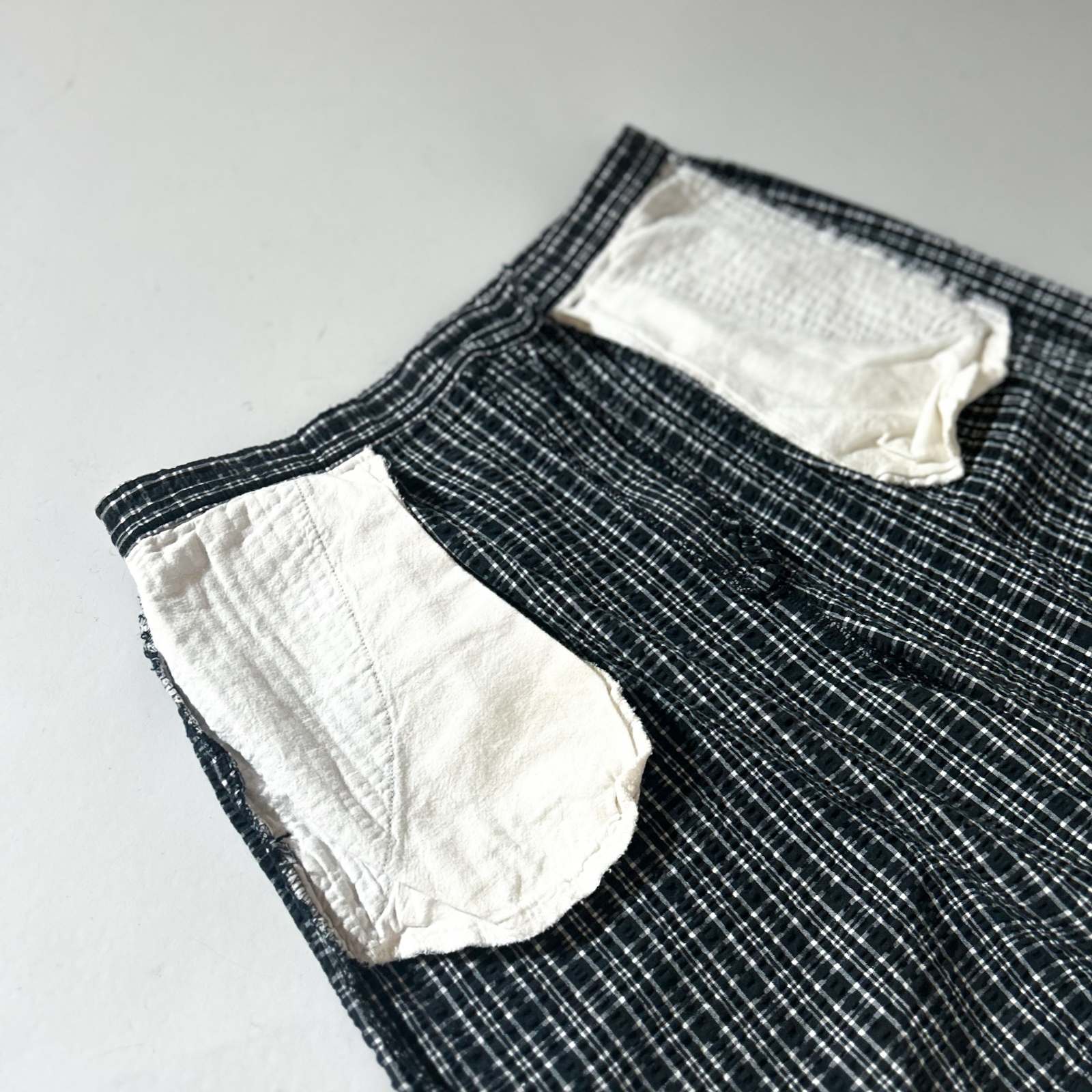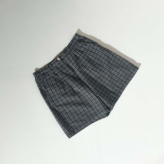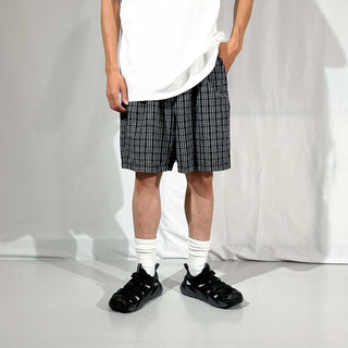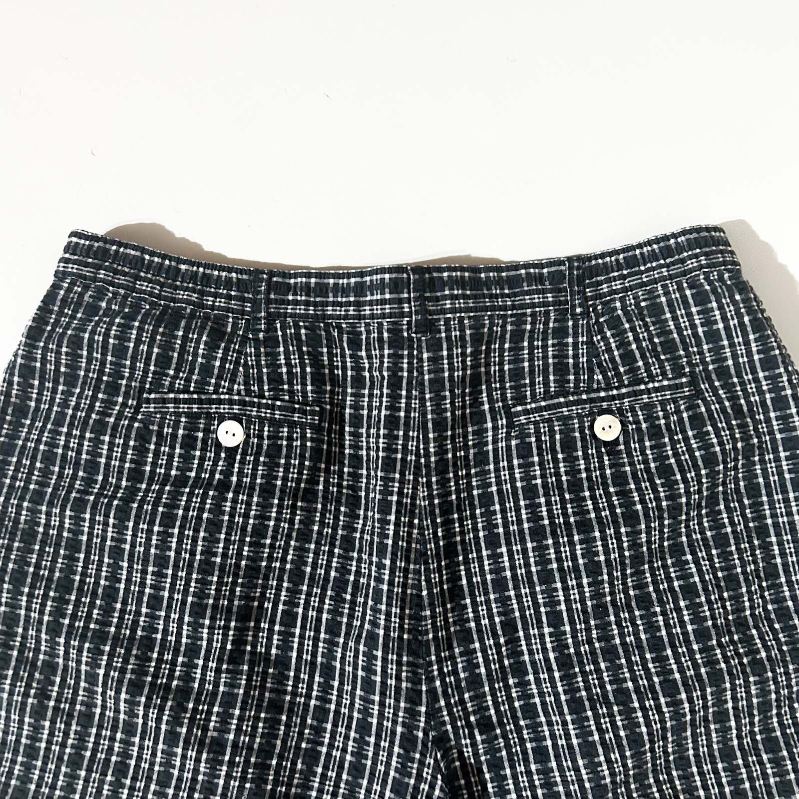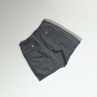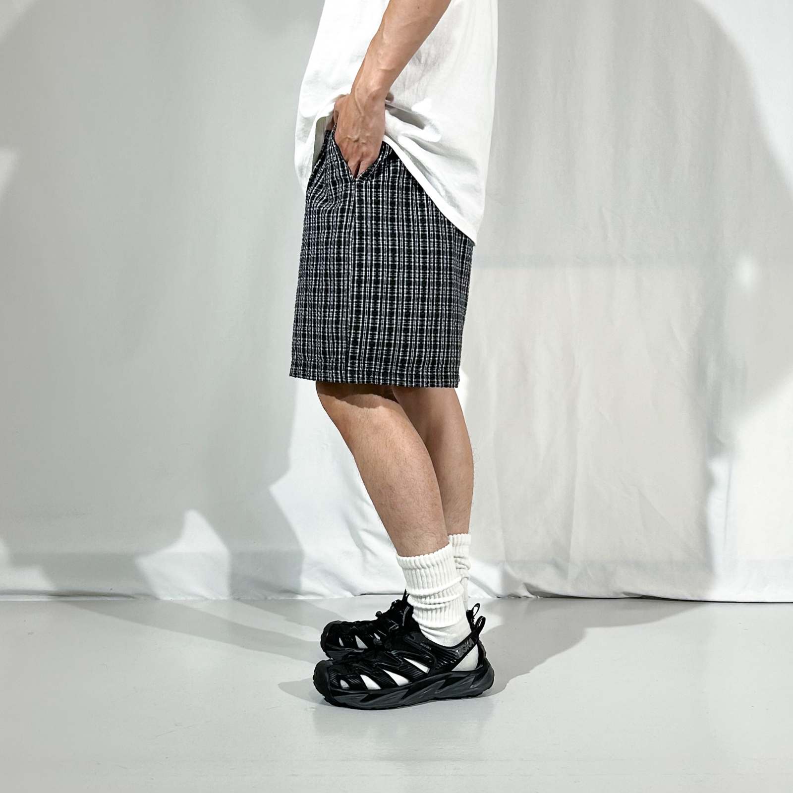 シアサッカー生地のチェックショーツ。カラーはブラックをベースに白の格子が入っています。シアサッカー生地で軽いのコットン100%でサラッとした肌触りが夏にぴったり。ちょっと腰パンして膝隠れるくらいに履きたい。個人的にはローファーと夏のシャツで合わせるのが好きですが、Tシャツだけでもしっかりおしゃれに見えるのが柄ショーツのいいところですね。90年代のこれくらいのチェックショーツ探そうと思っても意外とないんですよね。