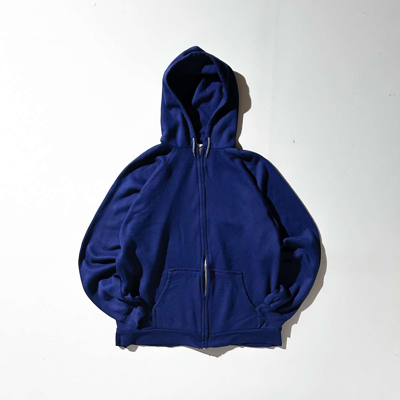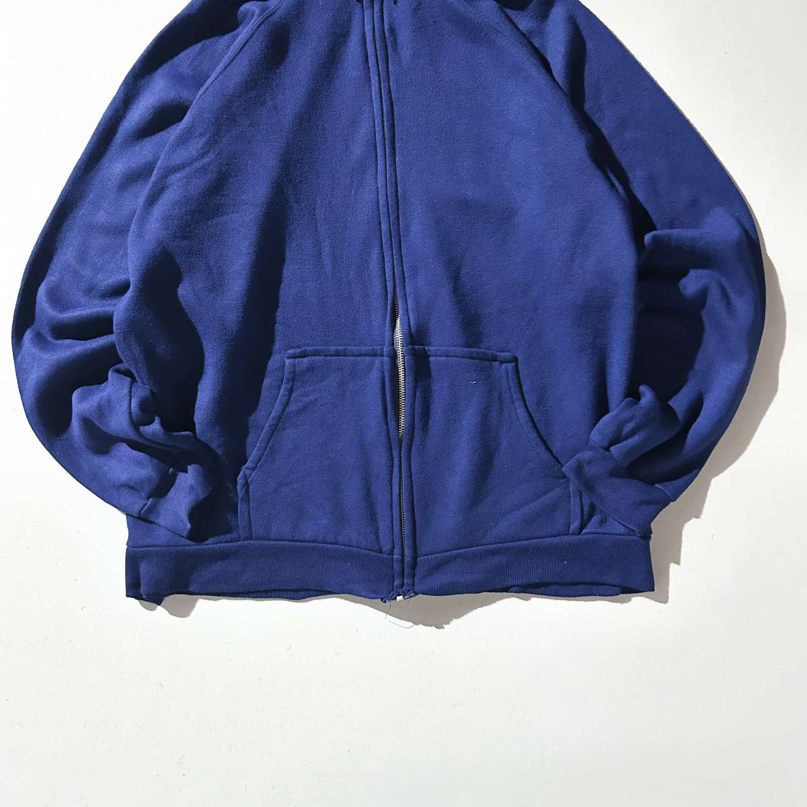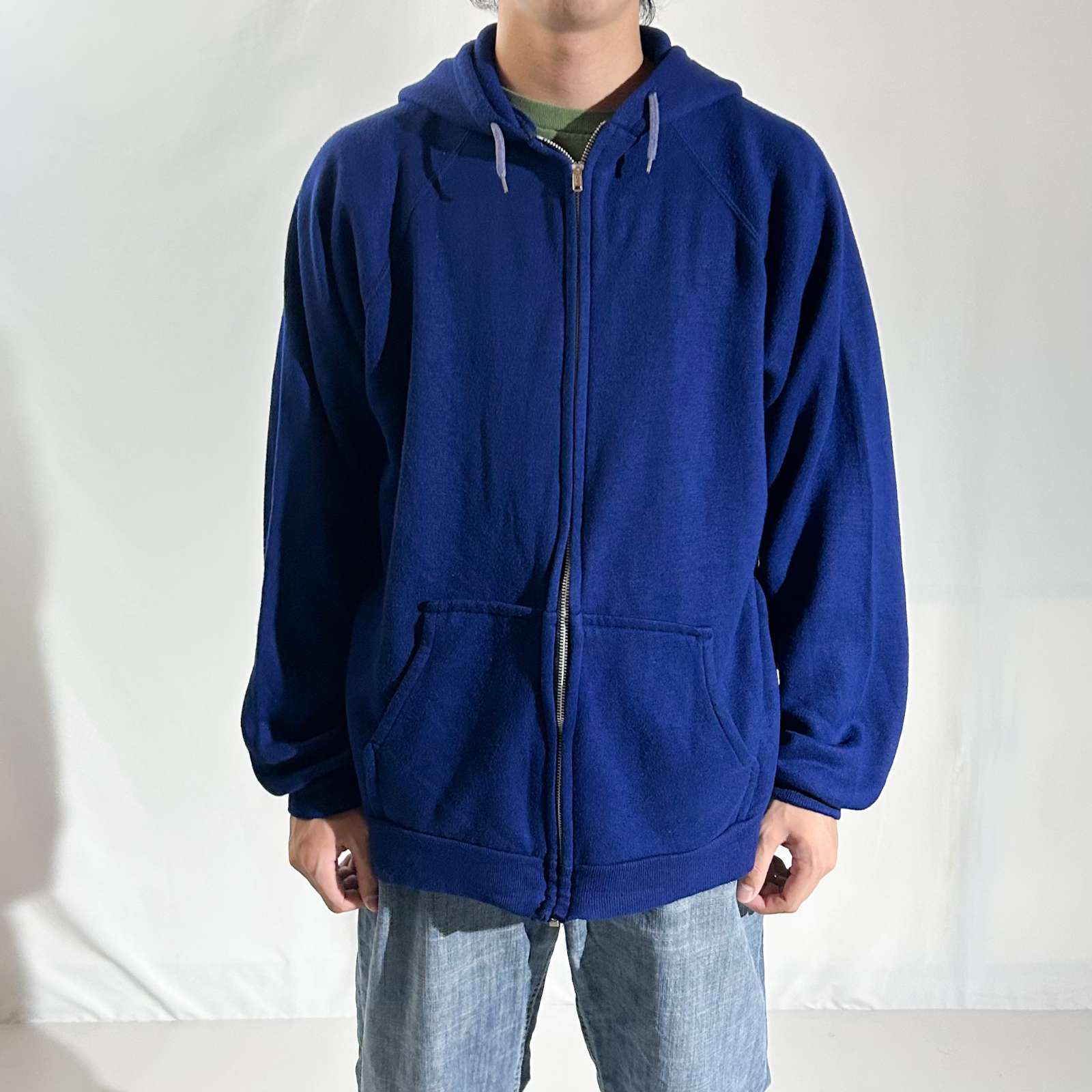 90年代頃の〈アルミジップ フルジップスウェットパーカ〉。 特徴はなんといってもこのYKK製アルミジップ(片爪仕様)。古着好きなら思わず反応してしまうヴィンテージライクなディテールが光ります。 原色のパキッとしたブルーが目を引く一枚で、差し色としても◎。 アルミジップのパーカは小さめサイズが多い印象ですが、今回は希少な実寸・表記ともにXL相当。 身幅約60cmのゆったりシルエットで、着丈は短めという絶妙なバランス感。 素材はアクリル100%で軽く柔らかな着心地。スウェット特有のゴワつきがなく、ストレスフリーに羽織れるのも魅力です。