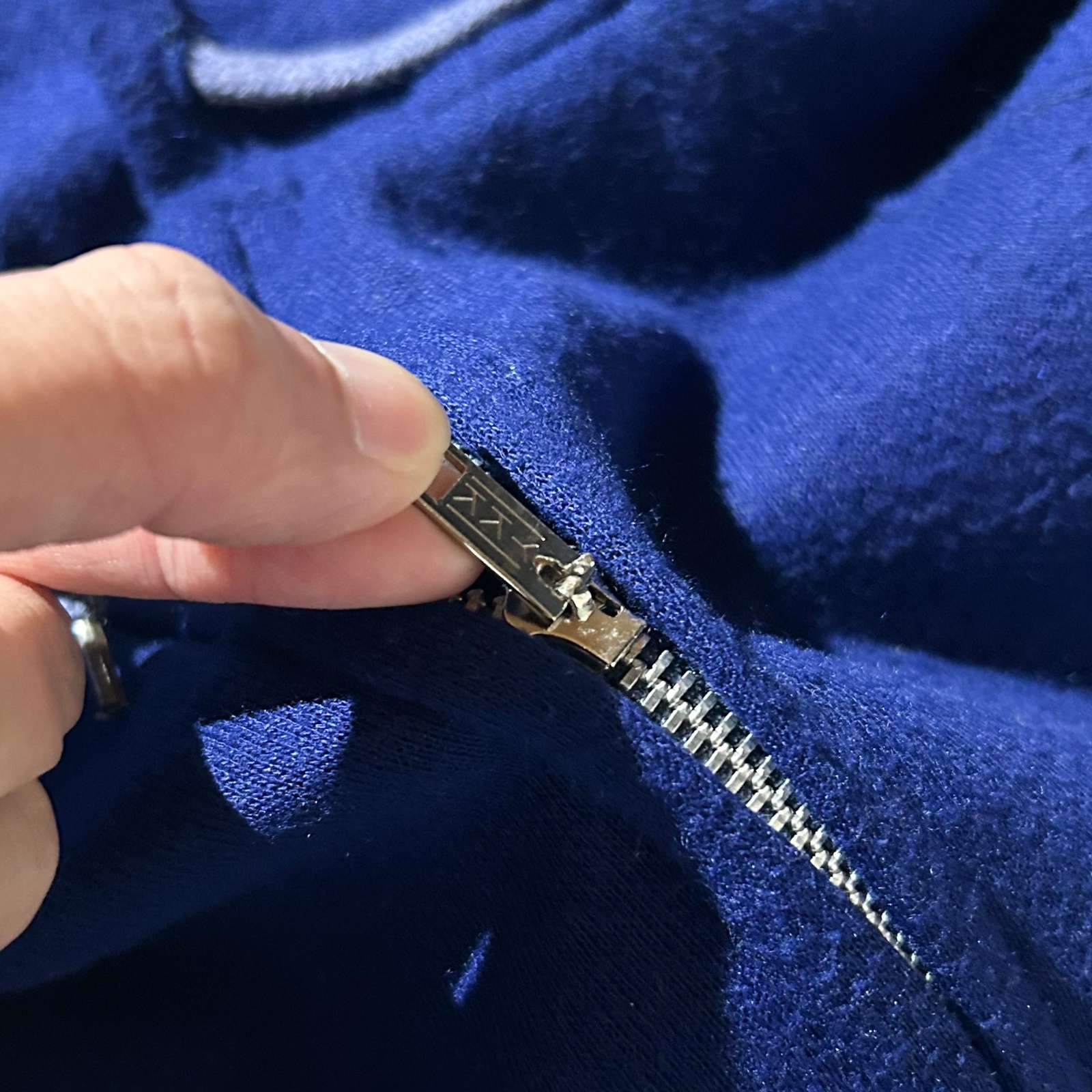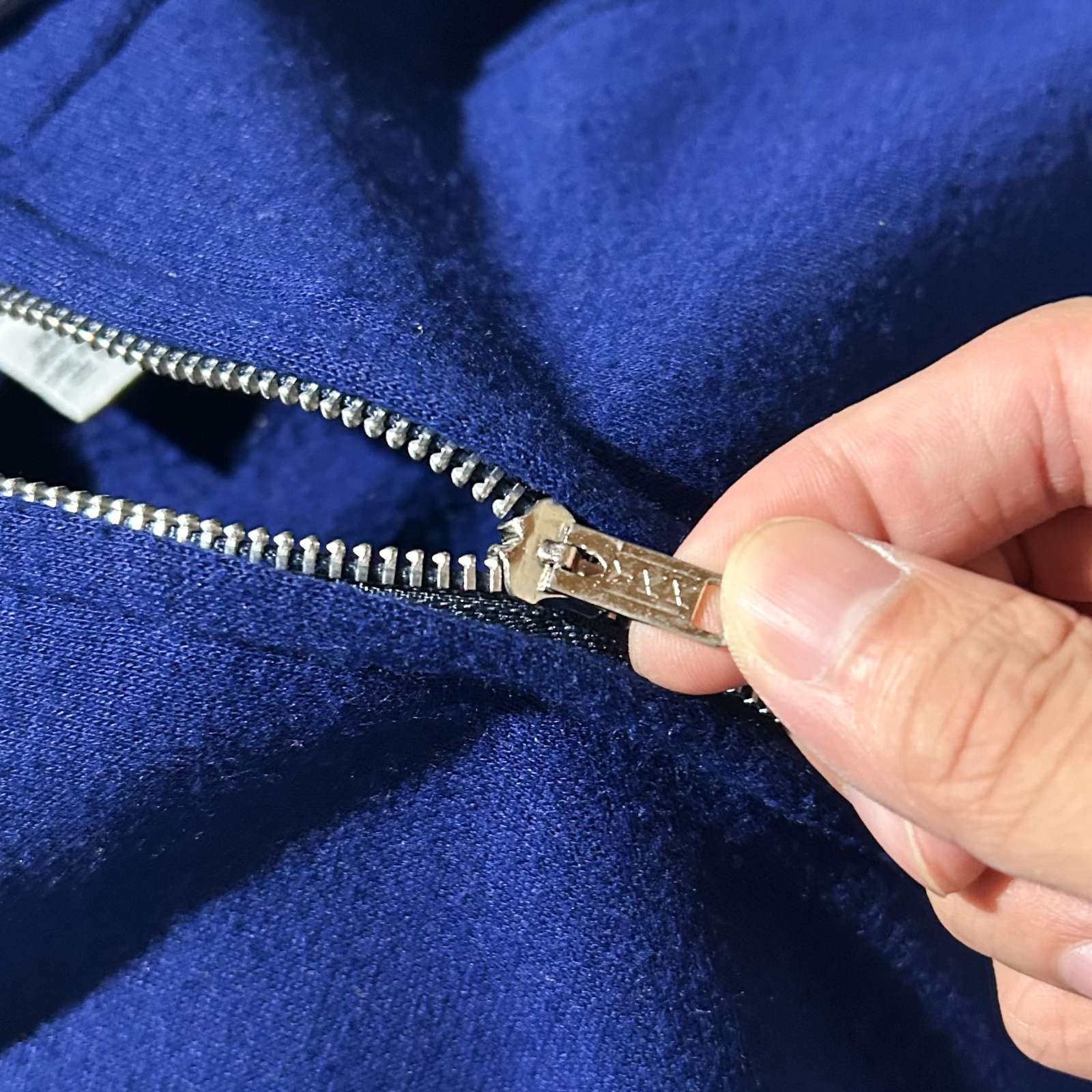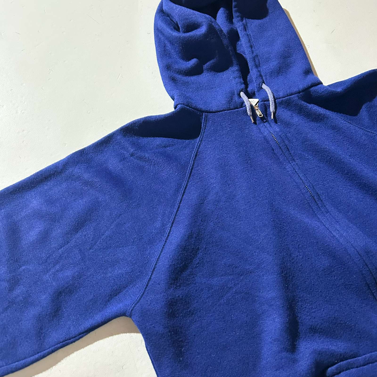 90年代頃の〈アルミジップ フルジップスウェットパーカ〉。 特徴はなんといってもこのYKK製アルミジップ(片爪仕様)。古着好きなら思わず反応してしまうヴィンテージライクなディテールが光ります。 原色のパキッとしたブルーが目を引く一枚で、差し色としても◎。 アルミジップのパーカは小さめサイズが多い印象ですが、今回は希少な実寸・表記ともにXL相当。 身幅約60cmのゆったりシルエットで、着丈は短めという絶妙なバランス感。 素材はアクリル100%で軽く柔らかな着心地。スウェット特有のゴワつきがなく、ストレスフリーに羽織れるのも魅力です。
