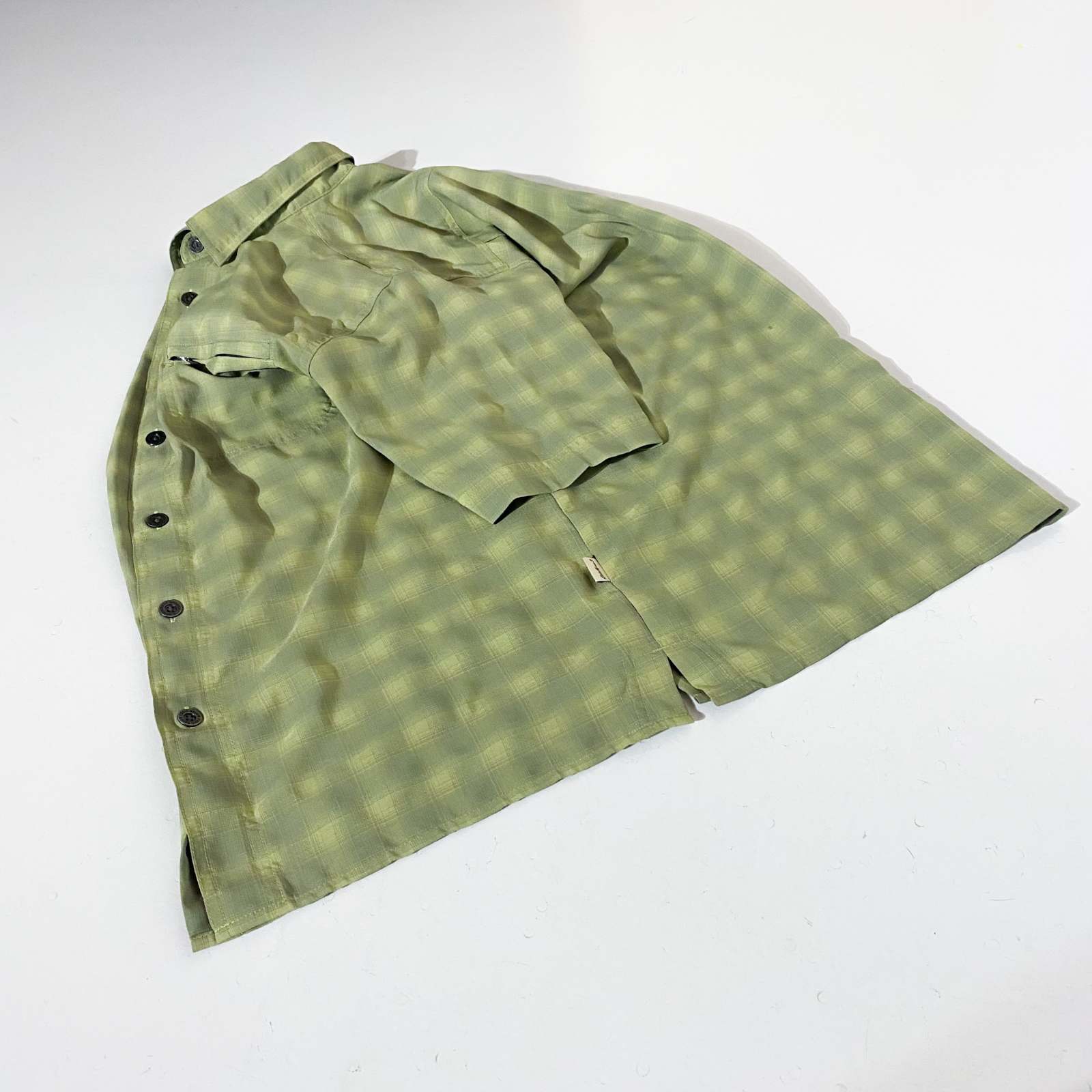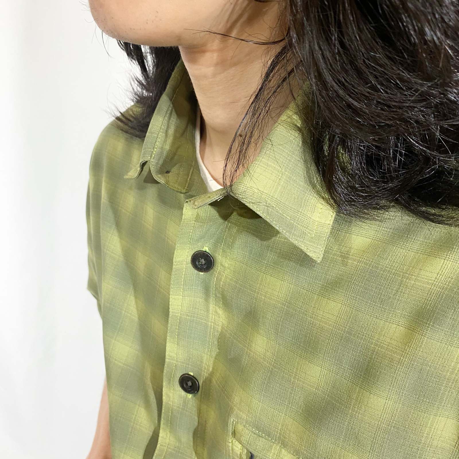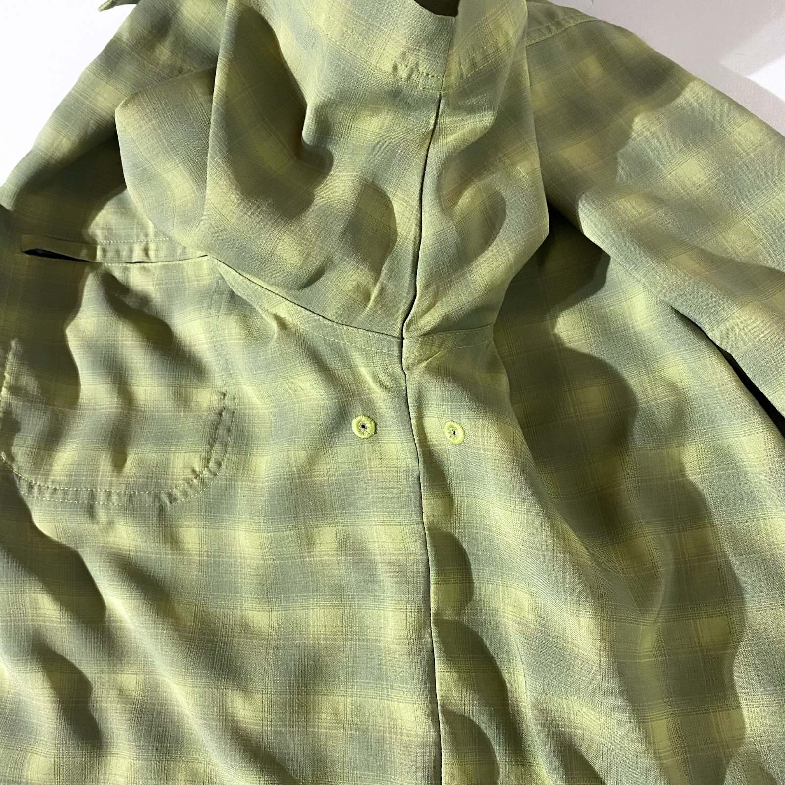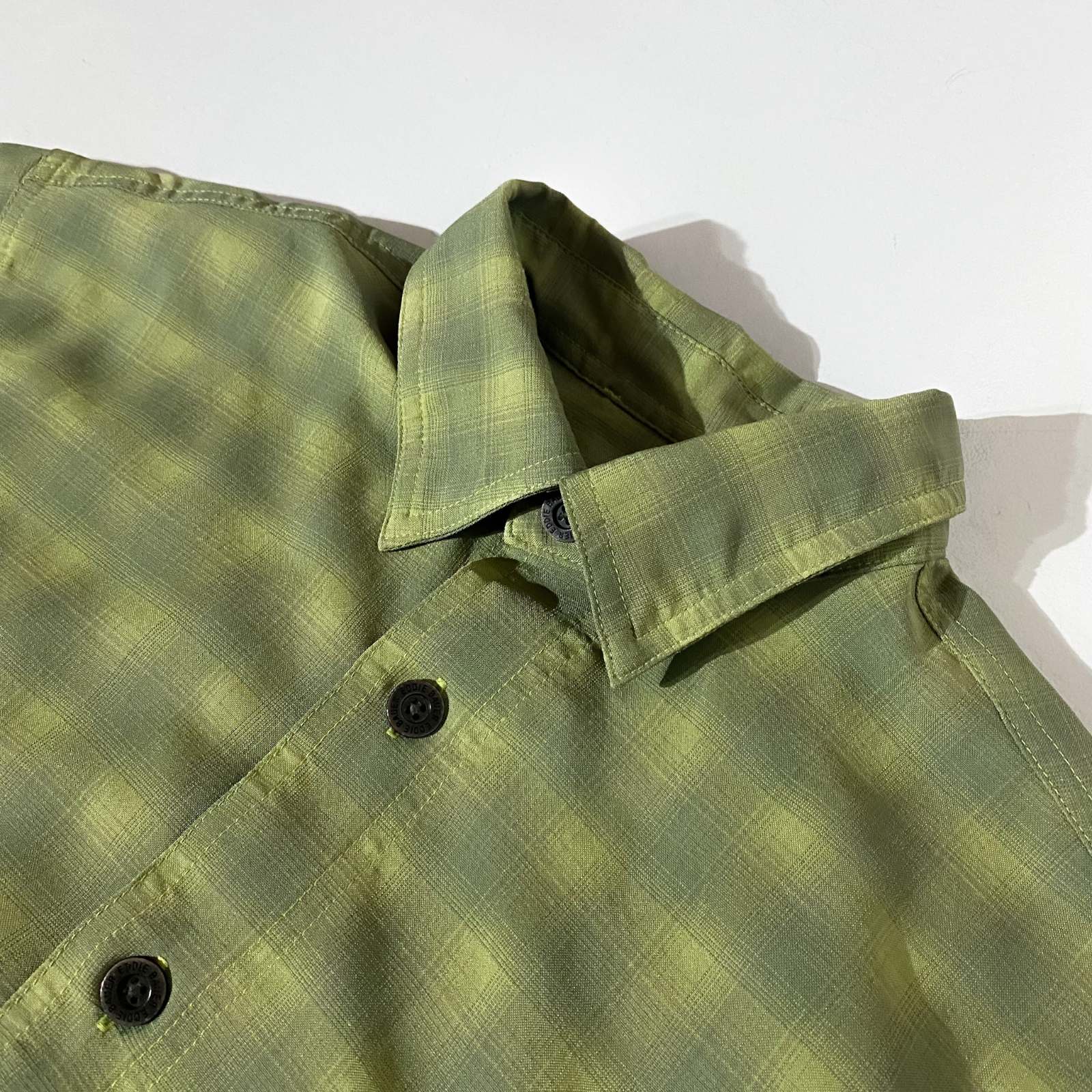 Eddie Bauerのオンブレチェックシャツになります。ナイロンとポリエステルの混紡素材。アウトドアなポリ感ある質感に濃淡あるチェックの上品さが溶け込むGoodレギュラー。見つけた時テンション上がりました!ちゃんと白タグ90年代…最高です。