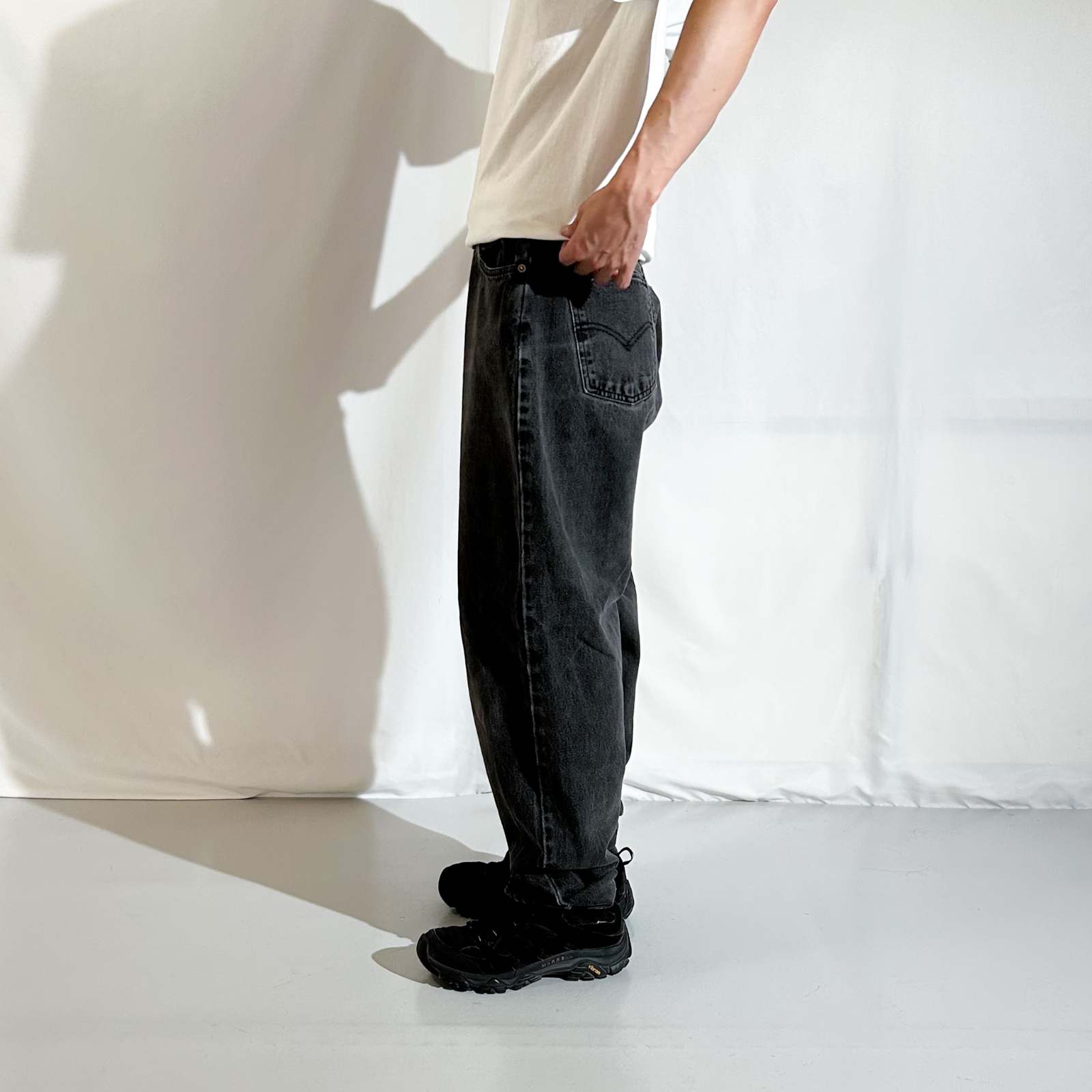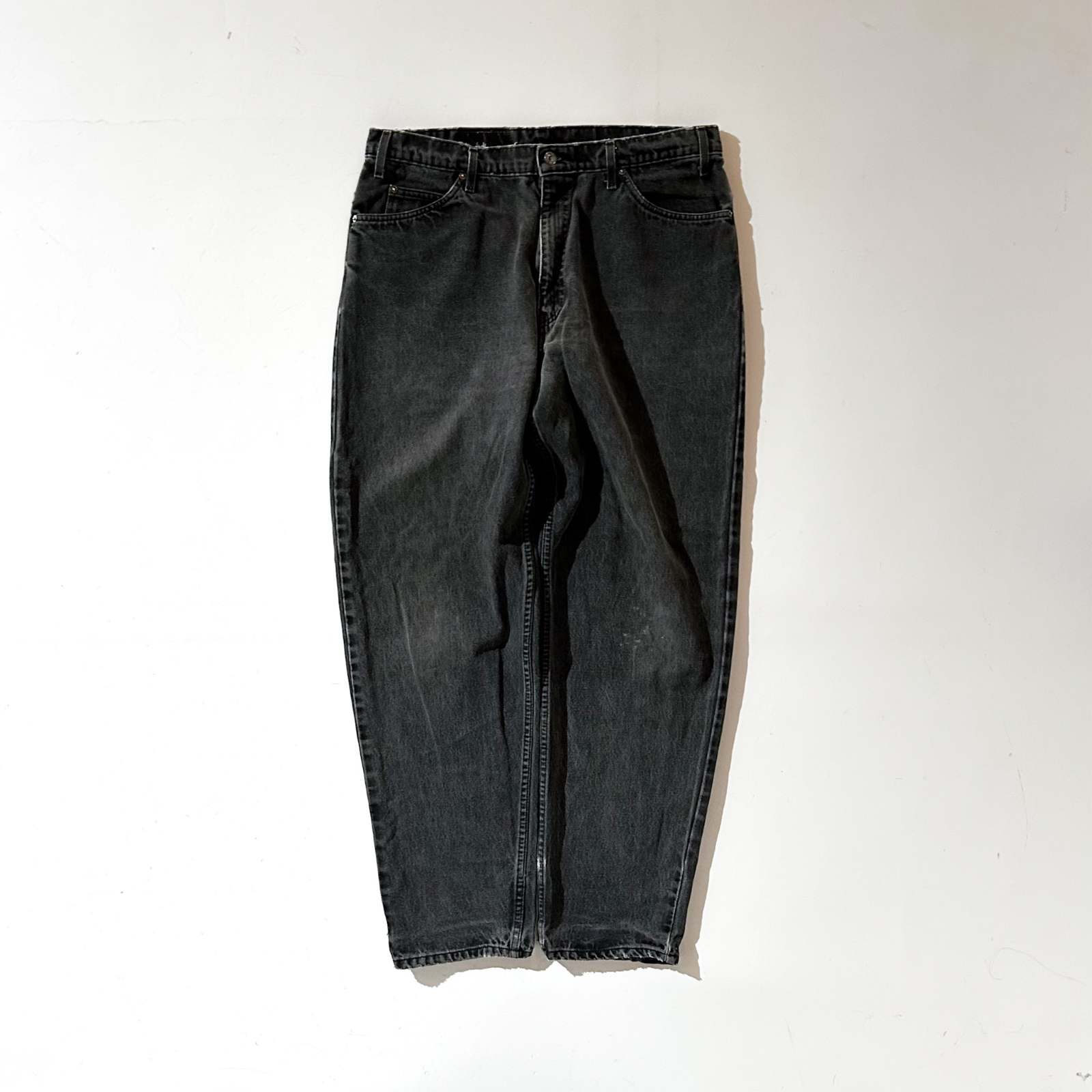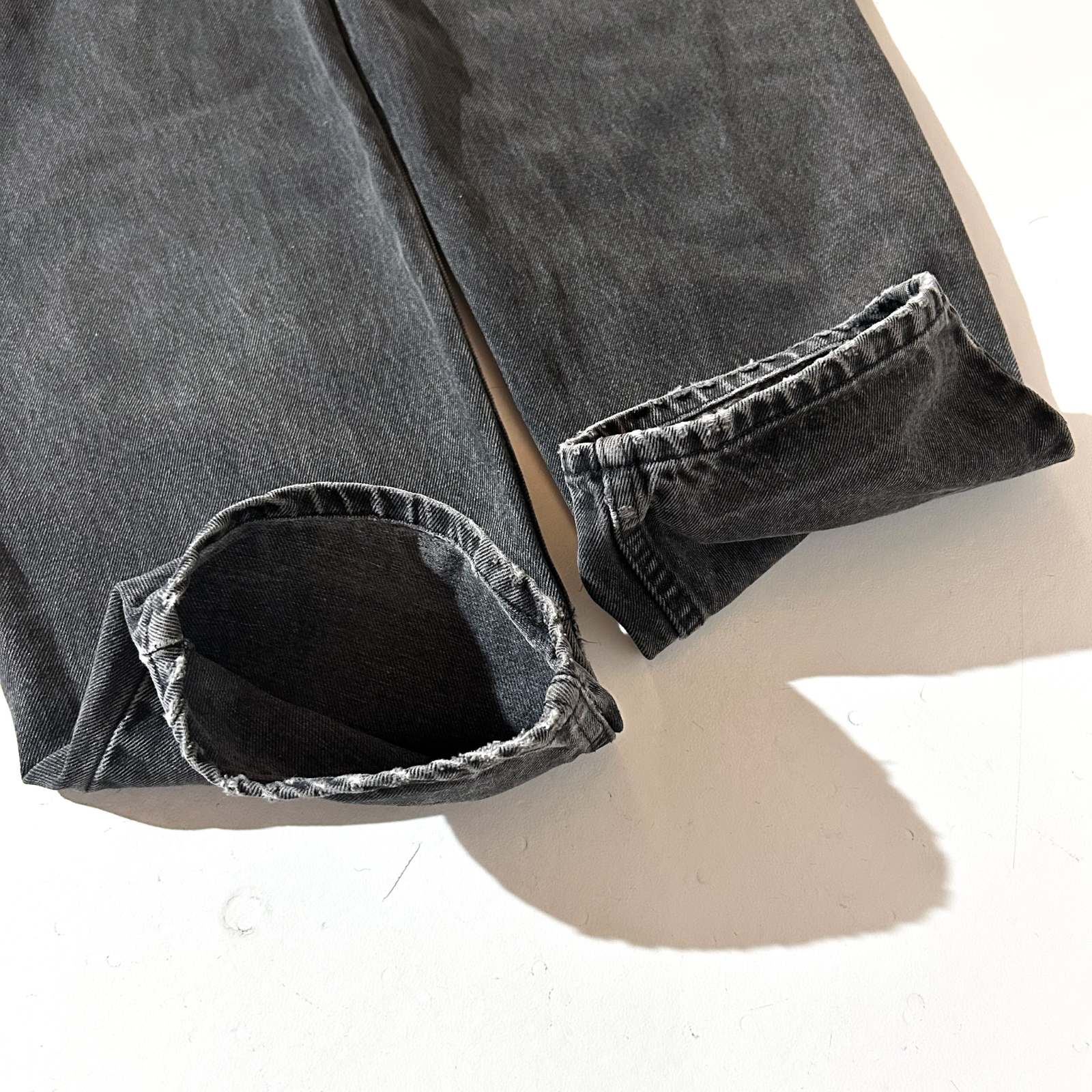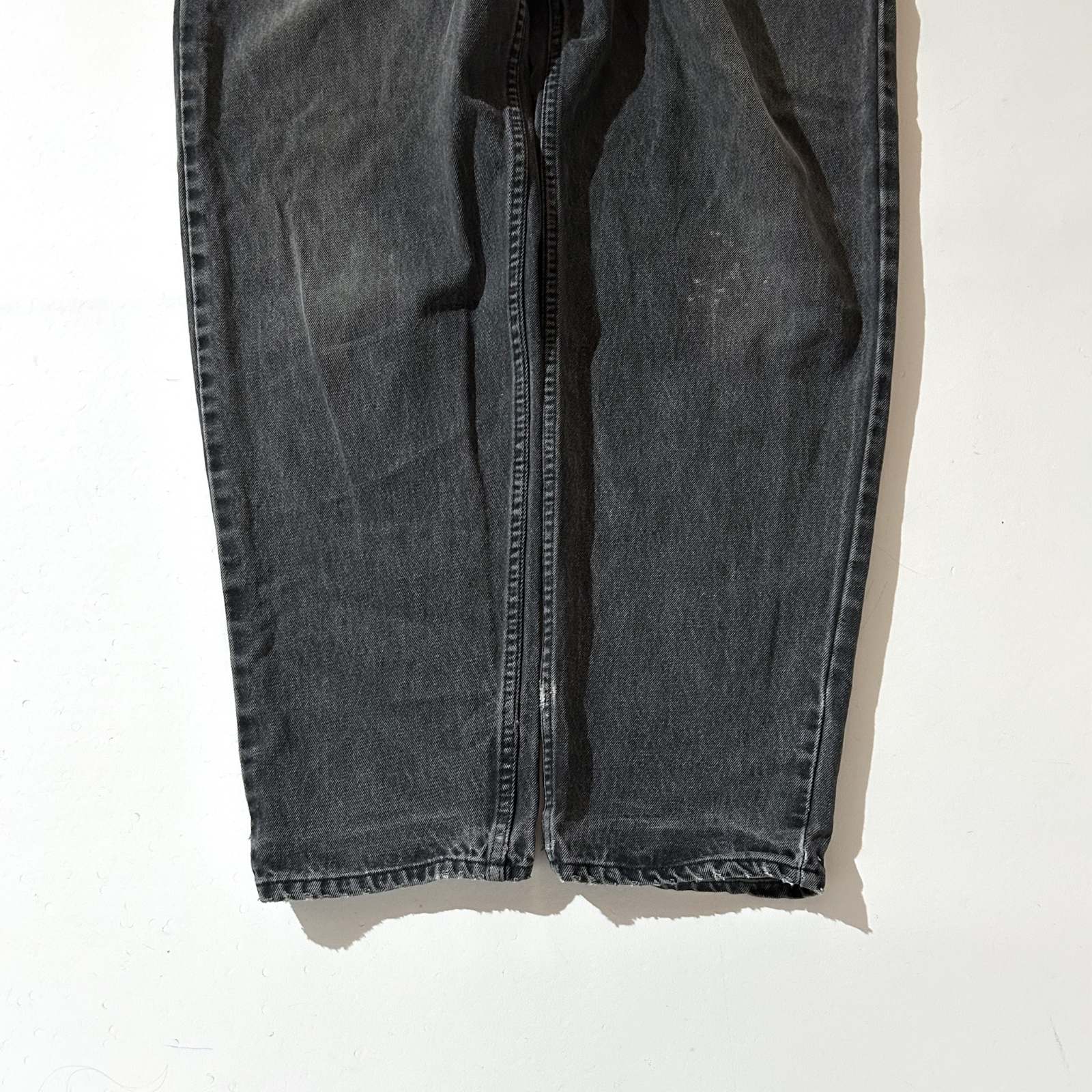 なかなか探すのが難しくなってきた90年代頃のLEVI’S 560 ブラックデニム。 今では枯渇が進み、玉数も少なくなってきた中で、この一本はサイズ感も◎。 太めに履けて、程よく溜めて履けるおすすめサイズ感です。 よく「90年代の560は裾幅がキツくて履きづらい」と言われることもありますが、 この個体はレングスが長めなので、逆にクッションを活かして綺麗に履けるのがポイント。 また、裾やシームに表れたダメージも良い雰囲気を演出しており、 新品では出せない“古着らしさ”を存分に感じられる仕上がりに。