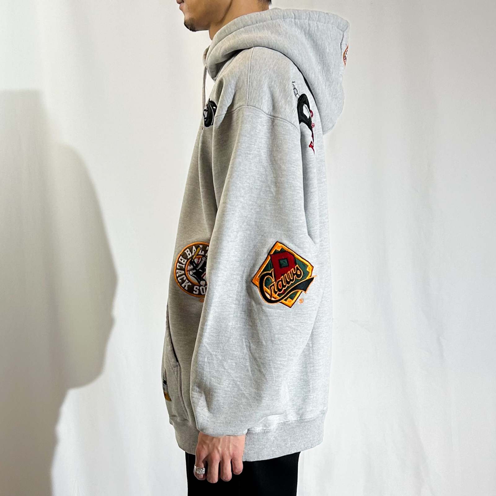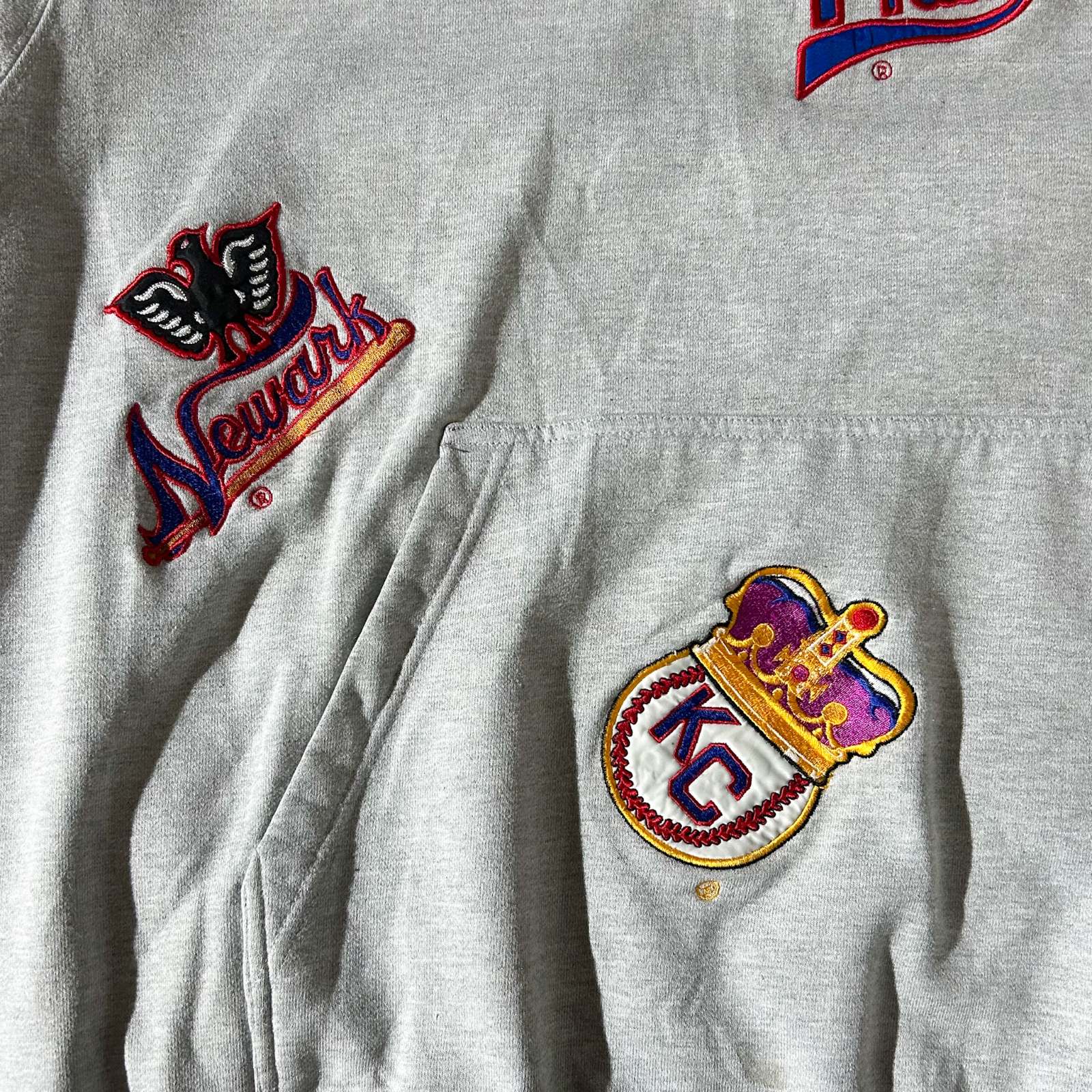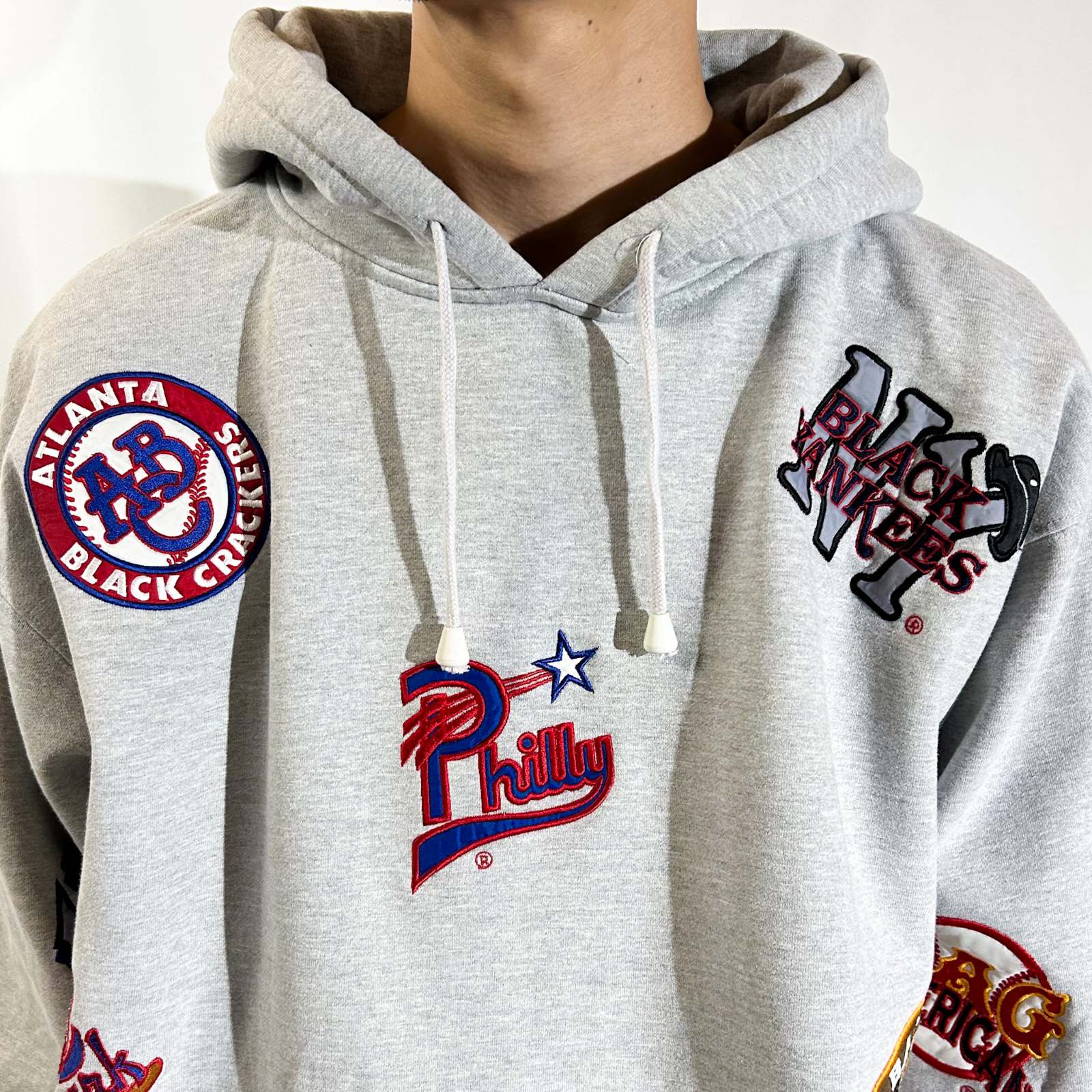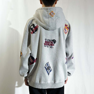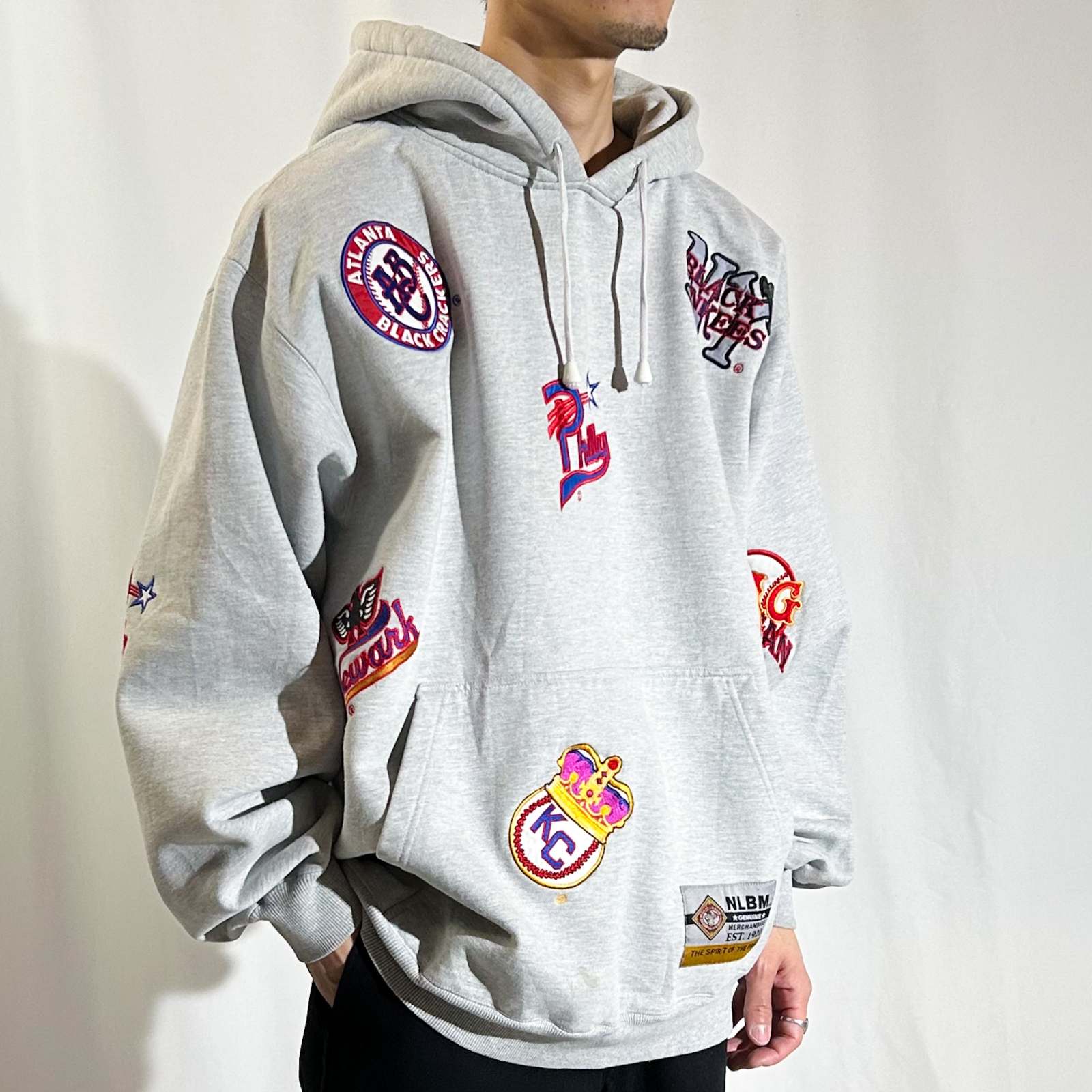 NLBのスウェットパーカ。チームロゴがパターンデザインされたファッショナブルなアイテム。持ったら分かる''ヘビーウェイト''なタフな生地感。フードはダブルフェイス。フード上の刺繍がクロスカラーズっぽくて好きですね。
