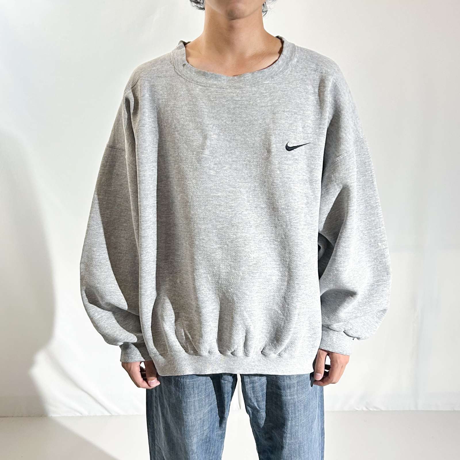 90年代〈NIKE〉のサイドスウッシュスウェット。 身幅の半分はあるんじゃないかってほどの極太アームに、着丈短めの“いい意味でバカシルエット”。 このバランス感で作ってるのがNIKEってところがまた最高。 サイズ表記は2XLですが、着丈がスッキリしているので、実寸はXLくらいの感覚で着ていただけます。 90’sらしいゆるシルエットを探していた方にぜひ。