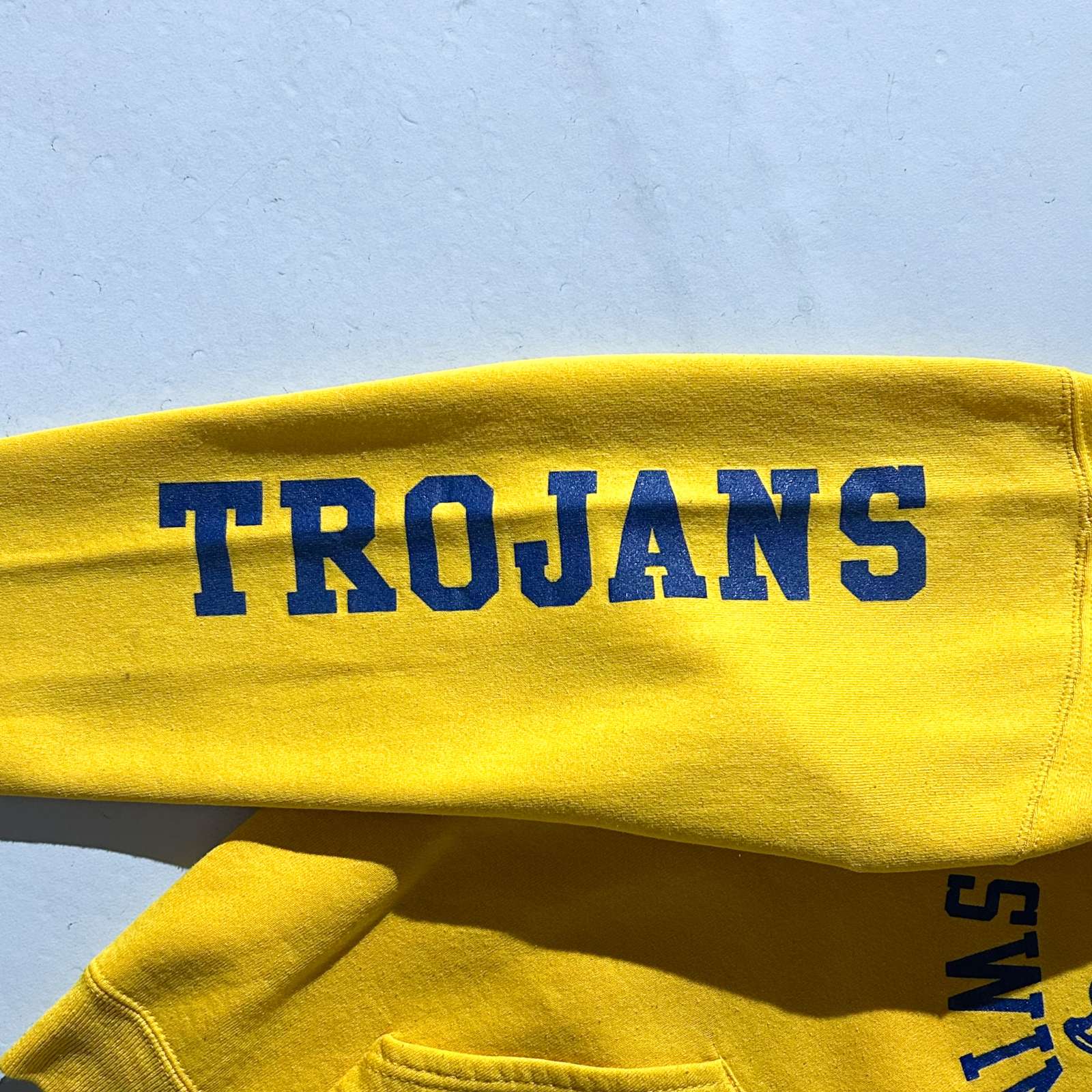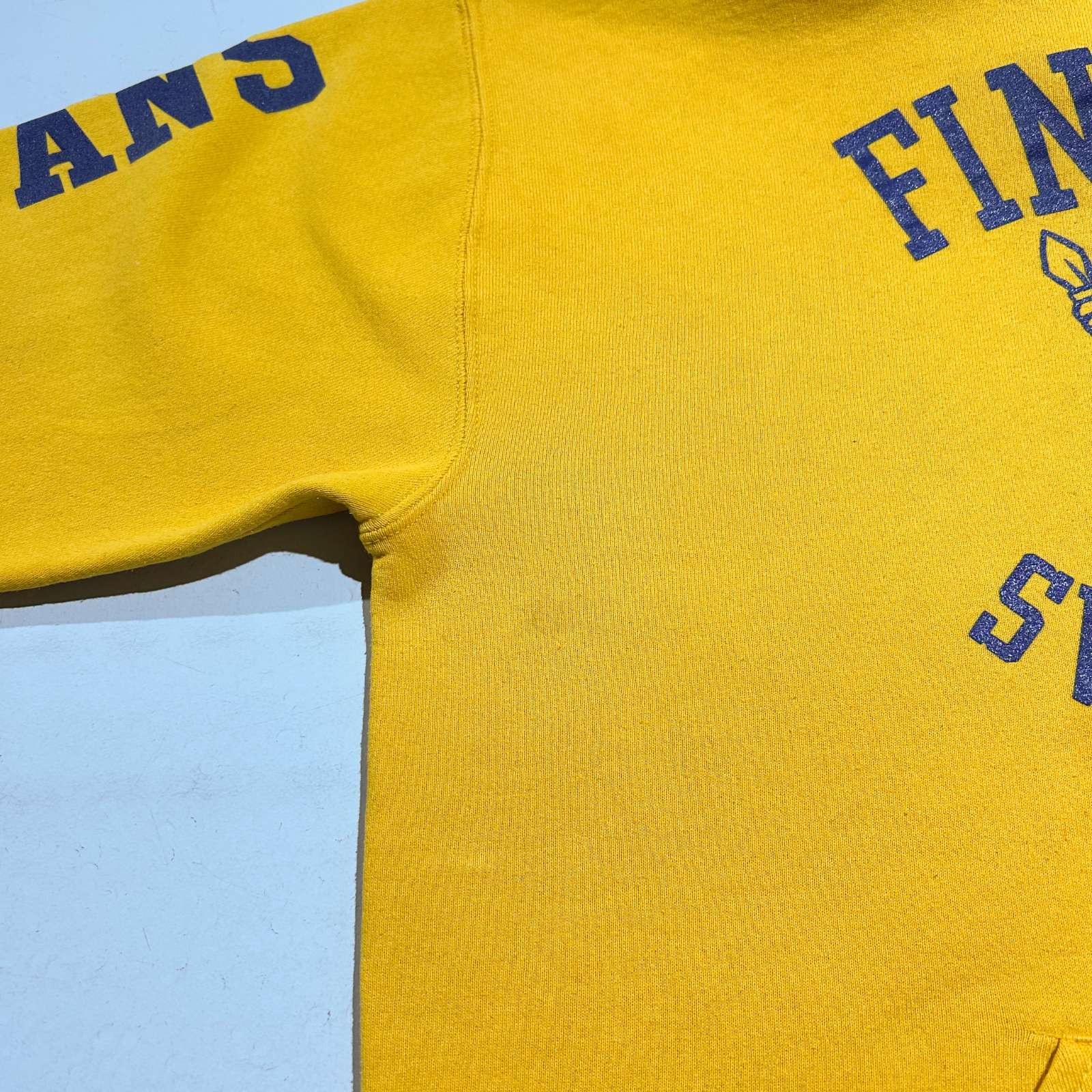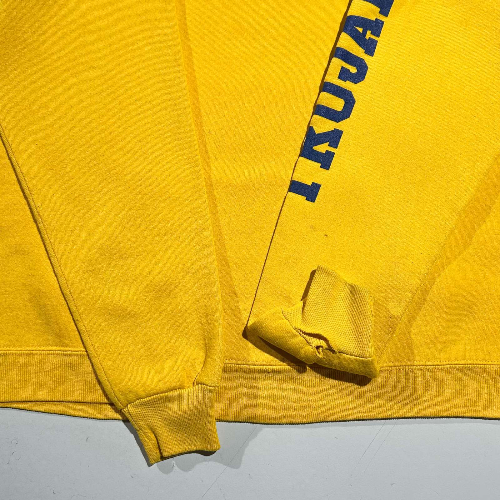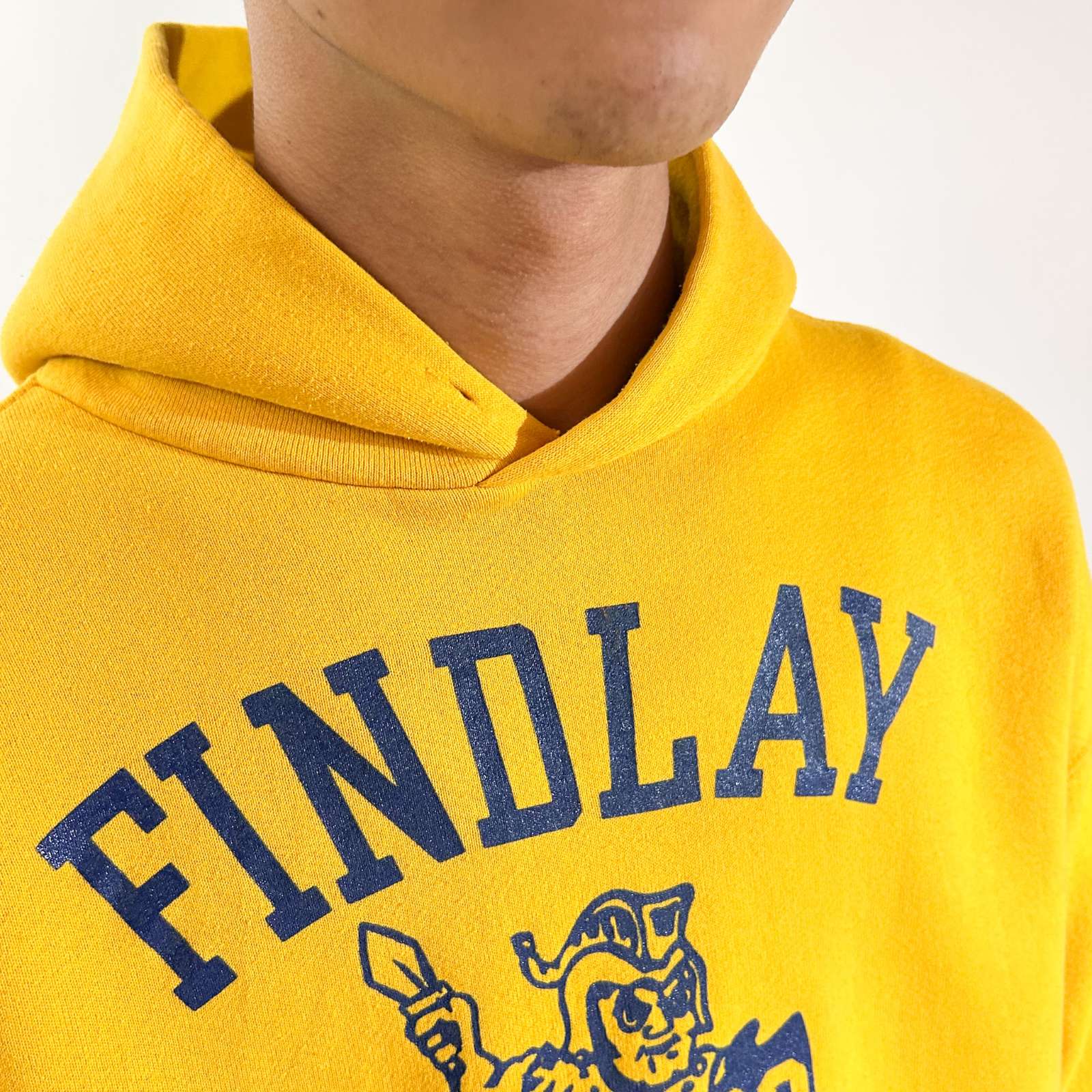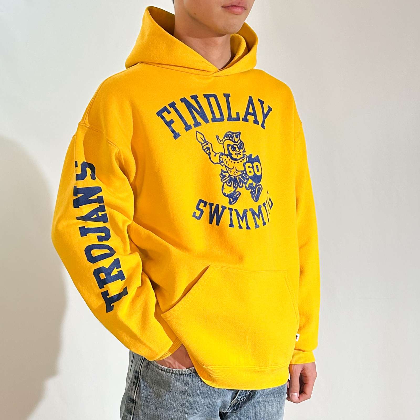 オハイオ州にあるFindlay High Schoolなどが有名で、そのスポーツチームの名称が「Trojans(トロージャンズ)」です。 高校レベルではありますが、特にアメリカンフットボールをはじめとして複数のスポーツで州大会出場経験があるなど、比較的強豪校として知られています。 実際、NFLの名クォーターバックとして活躍したベン・ロスリスバーガー(Ben Roethlisberger)はFindlay High School出身で、彼の在学当時からフットボールの強さが注目されていました。そうした背景からも、スポーツが盛んな学校みたいです! そんなことは置いといて…黄色ボディに青プリントの配色って可愛いよね。170cm細身のモデルで肩に落ち感、身幅にゆとり、着丈短め、袖丈やや溜まるサイズ感。