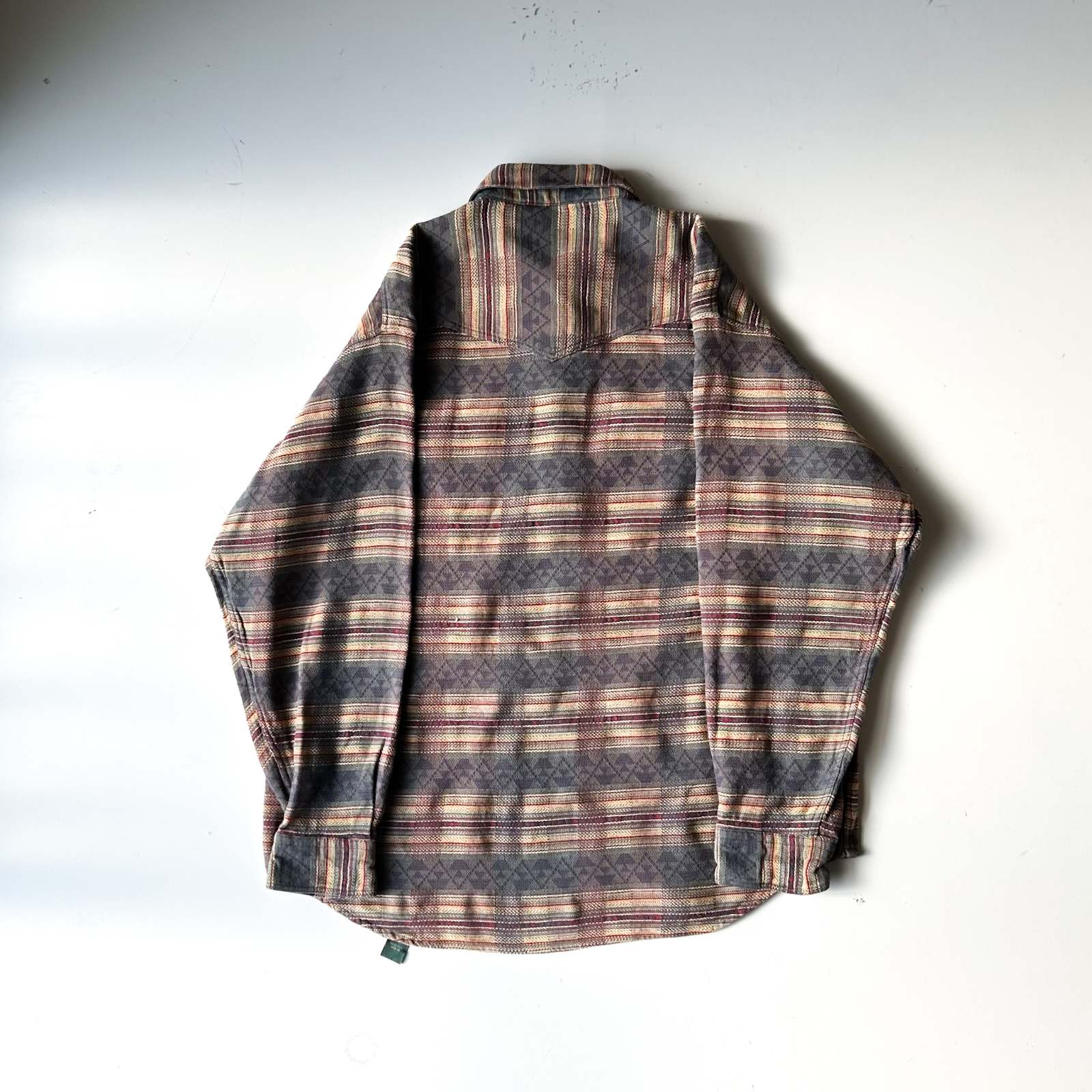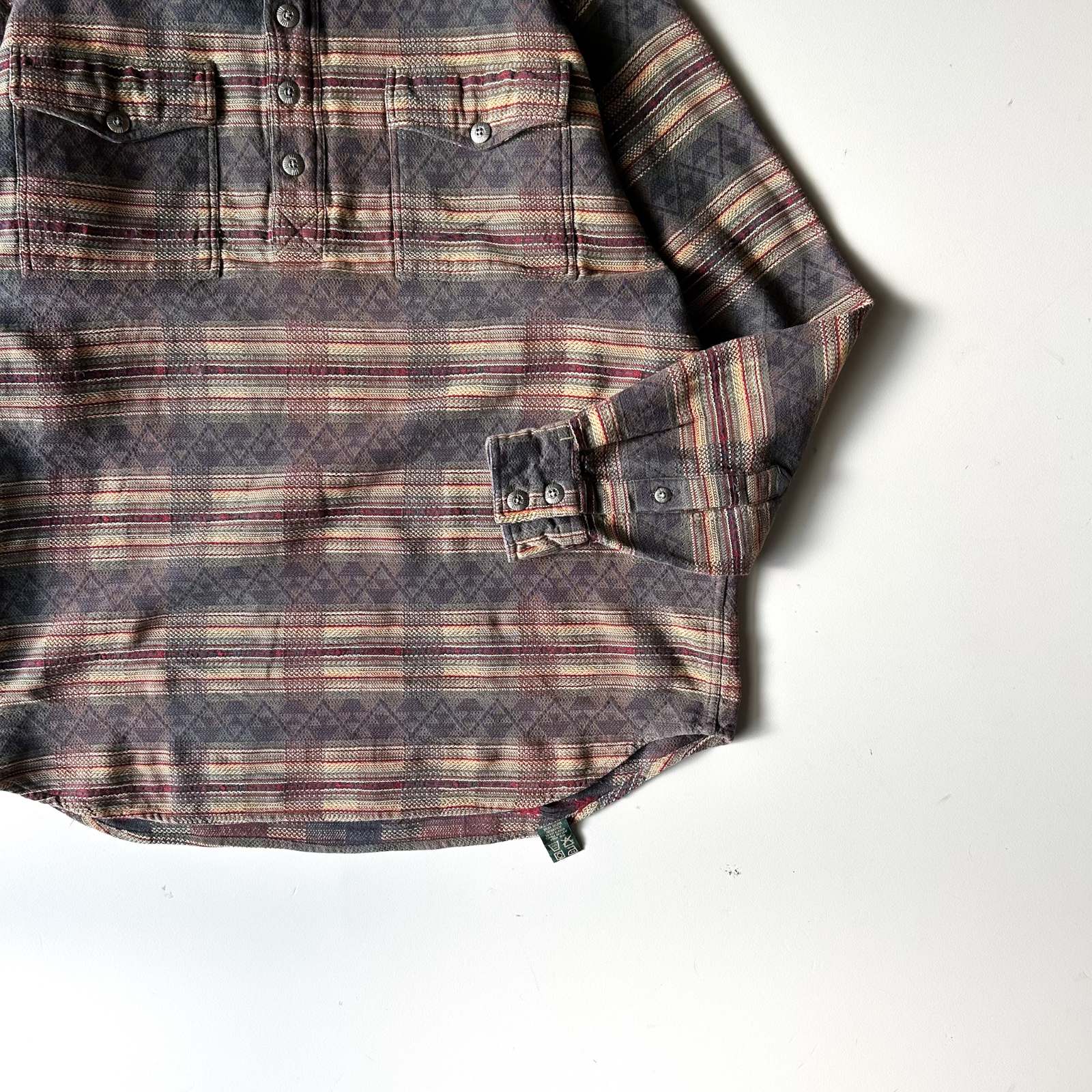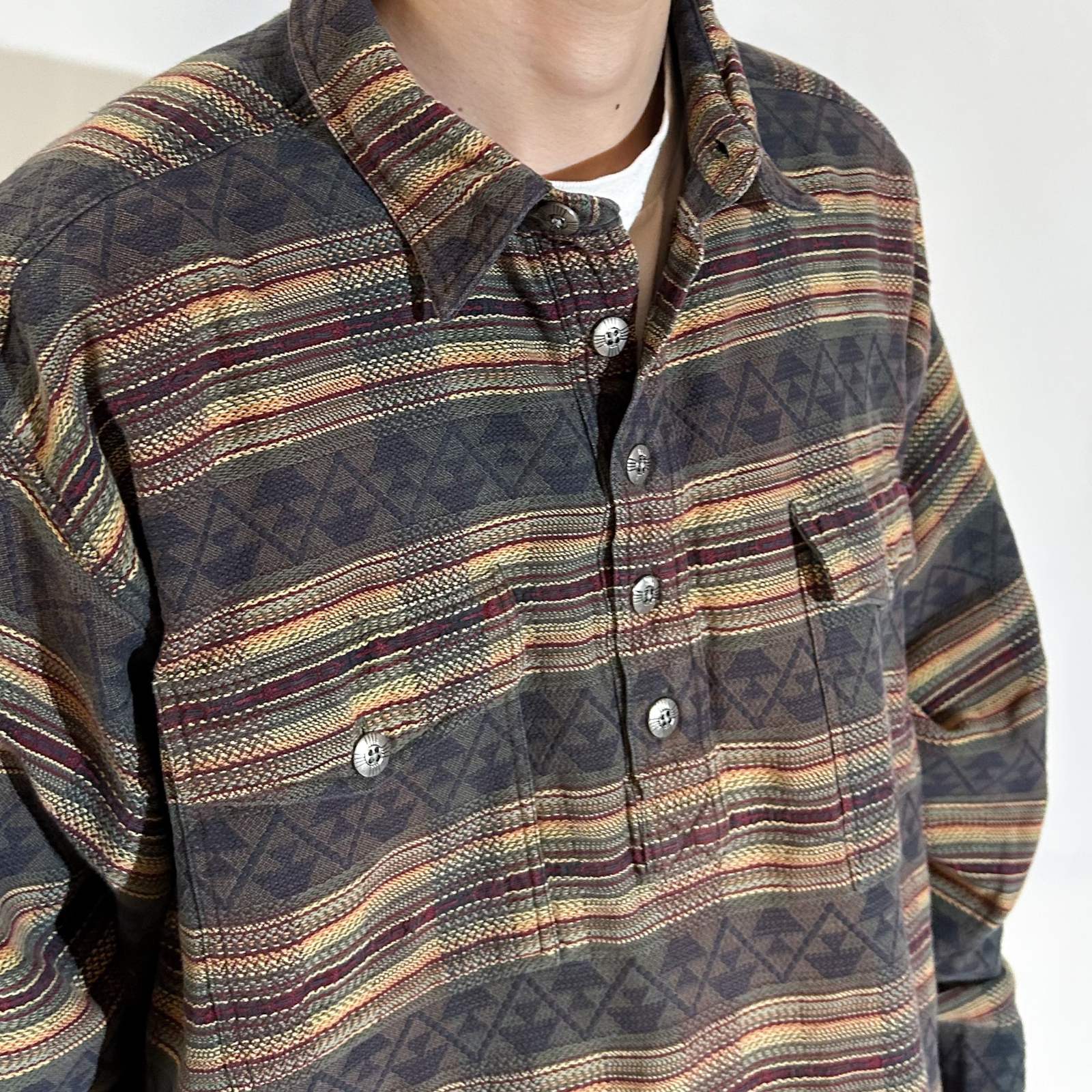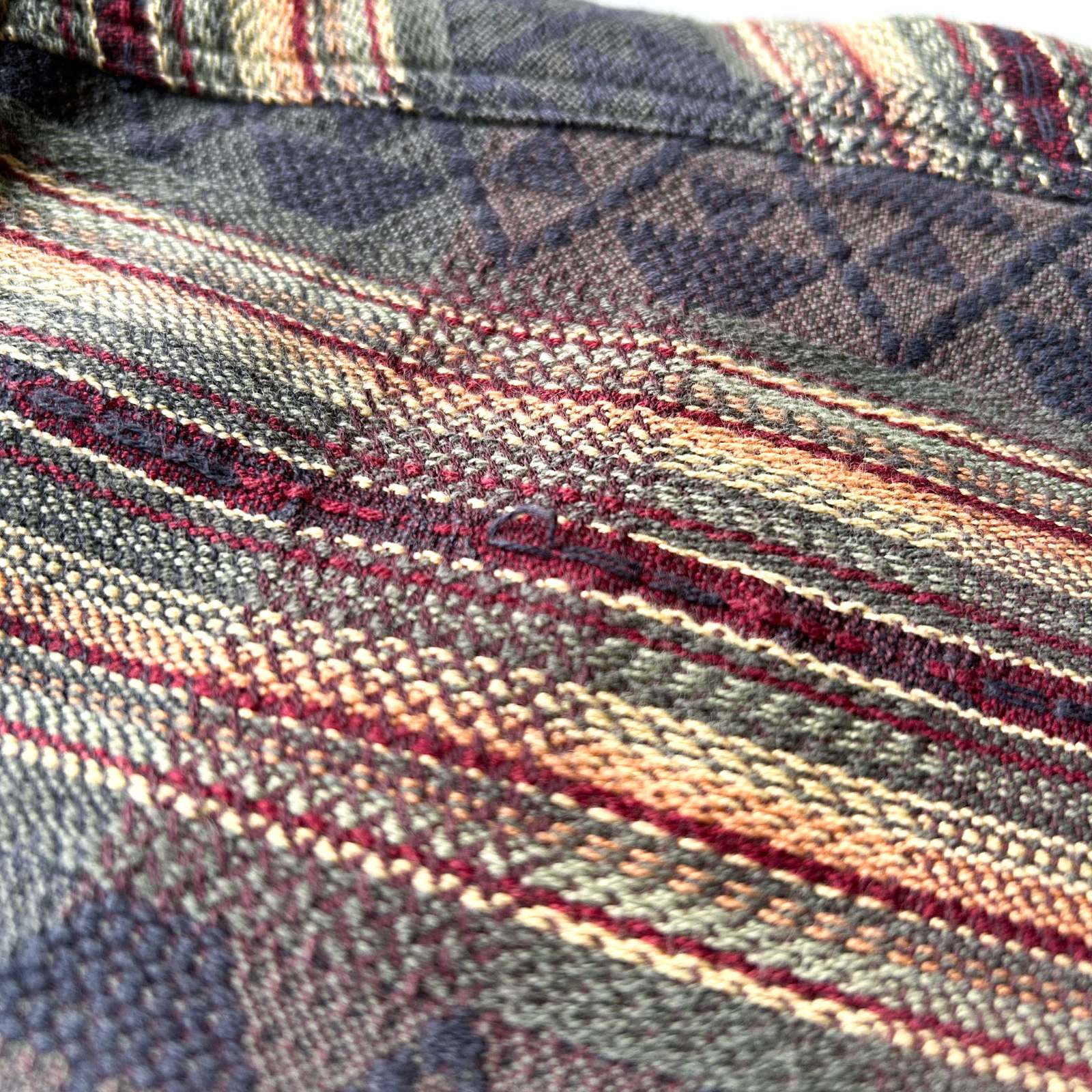 ORVIS ネイティブ柄シャツ。 ネイティブ柄が印象的なORVIS(オービス)のシャツ。ジャガード織のような独特の織り方が特徴で、柄に立体感があります。 身幅がゆったりとしたシルエットなので、リラックス感のある着こなしが楽しめます。ラフに羽織るだけで存在感があり、コーディネートにアクセントを加えてくれる一着。アメカジやカジュアルスタイルにピッタリで、使い勝手の良さも魅力です。
