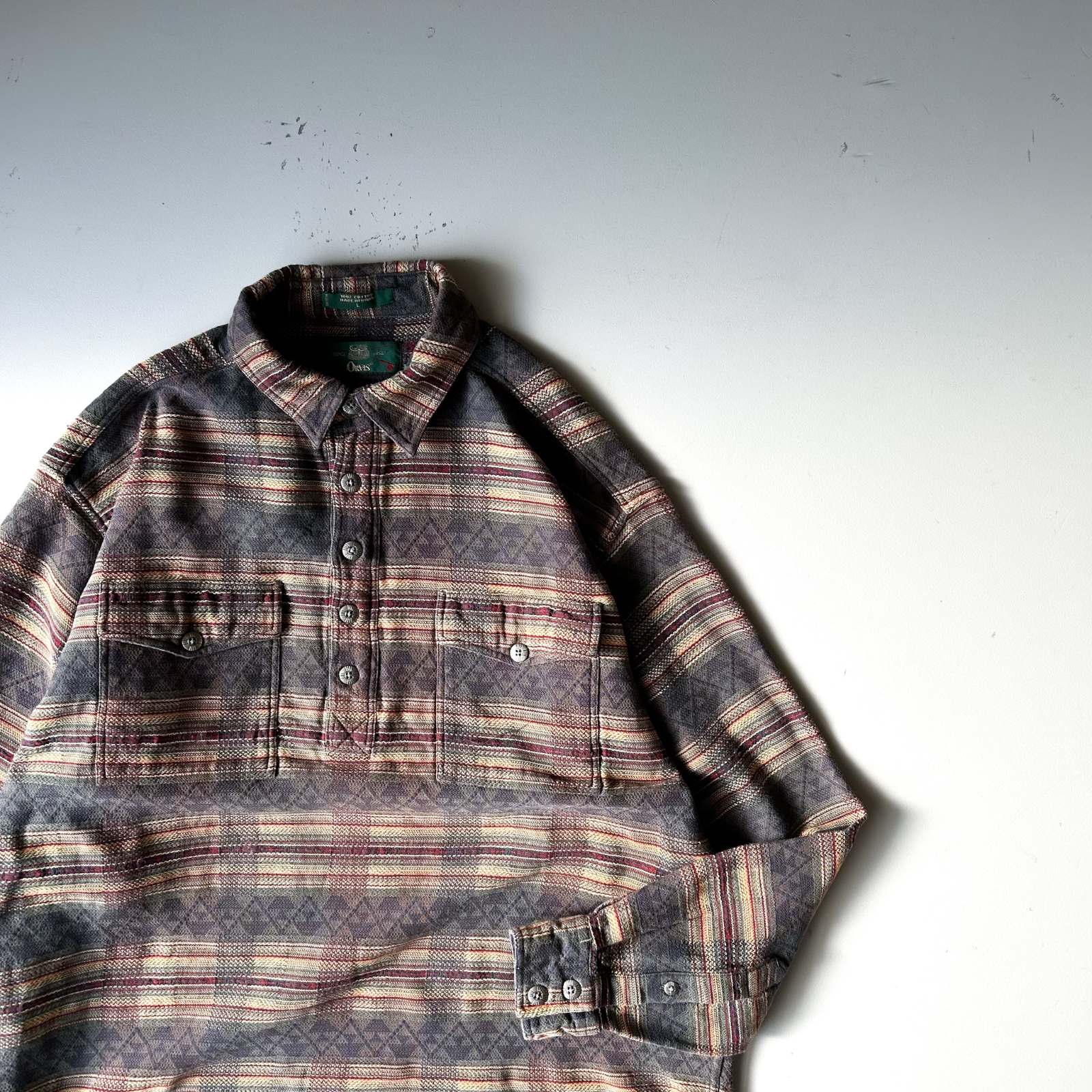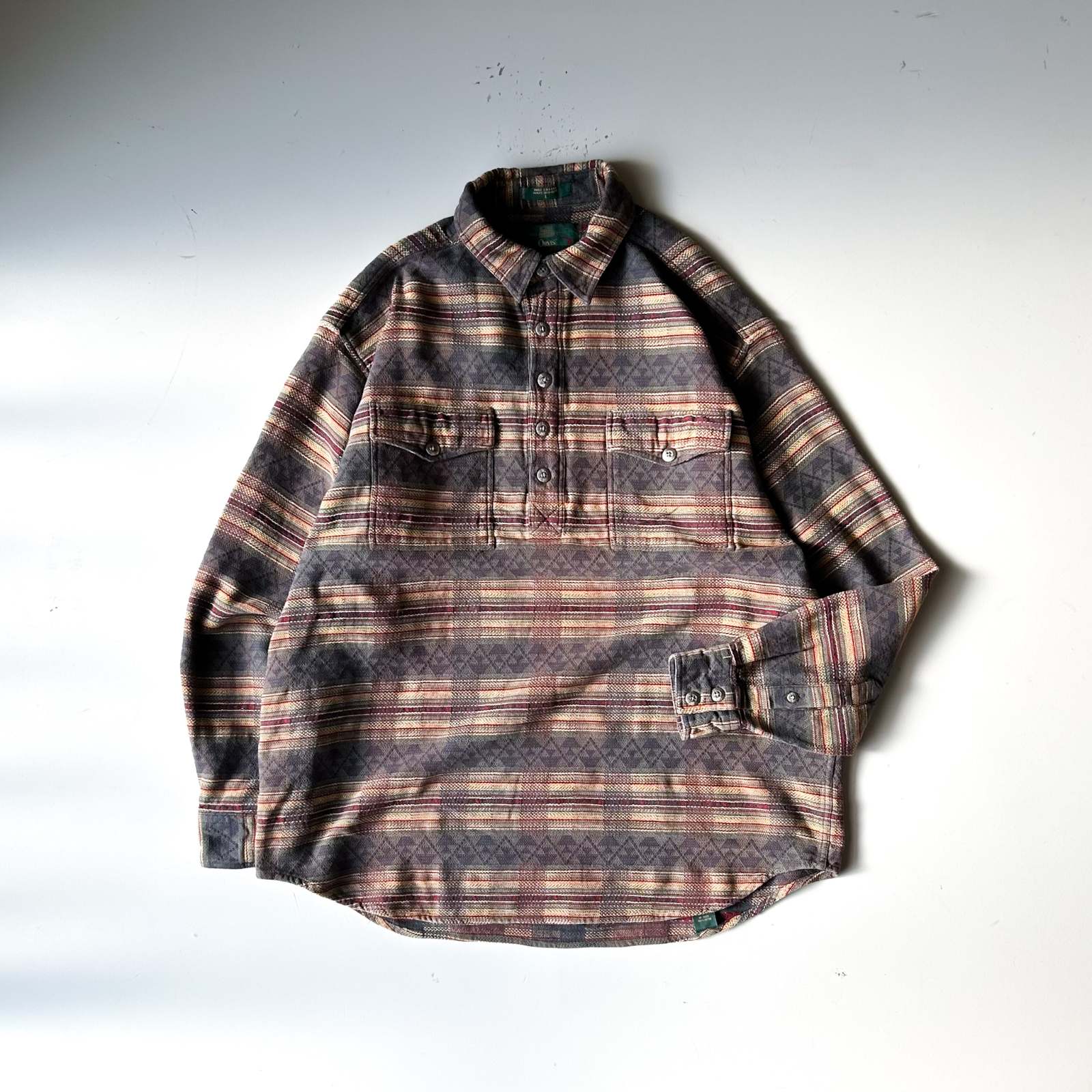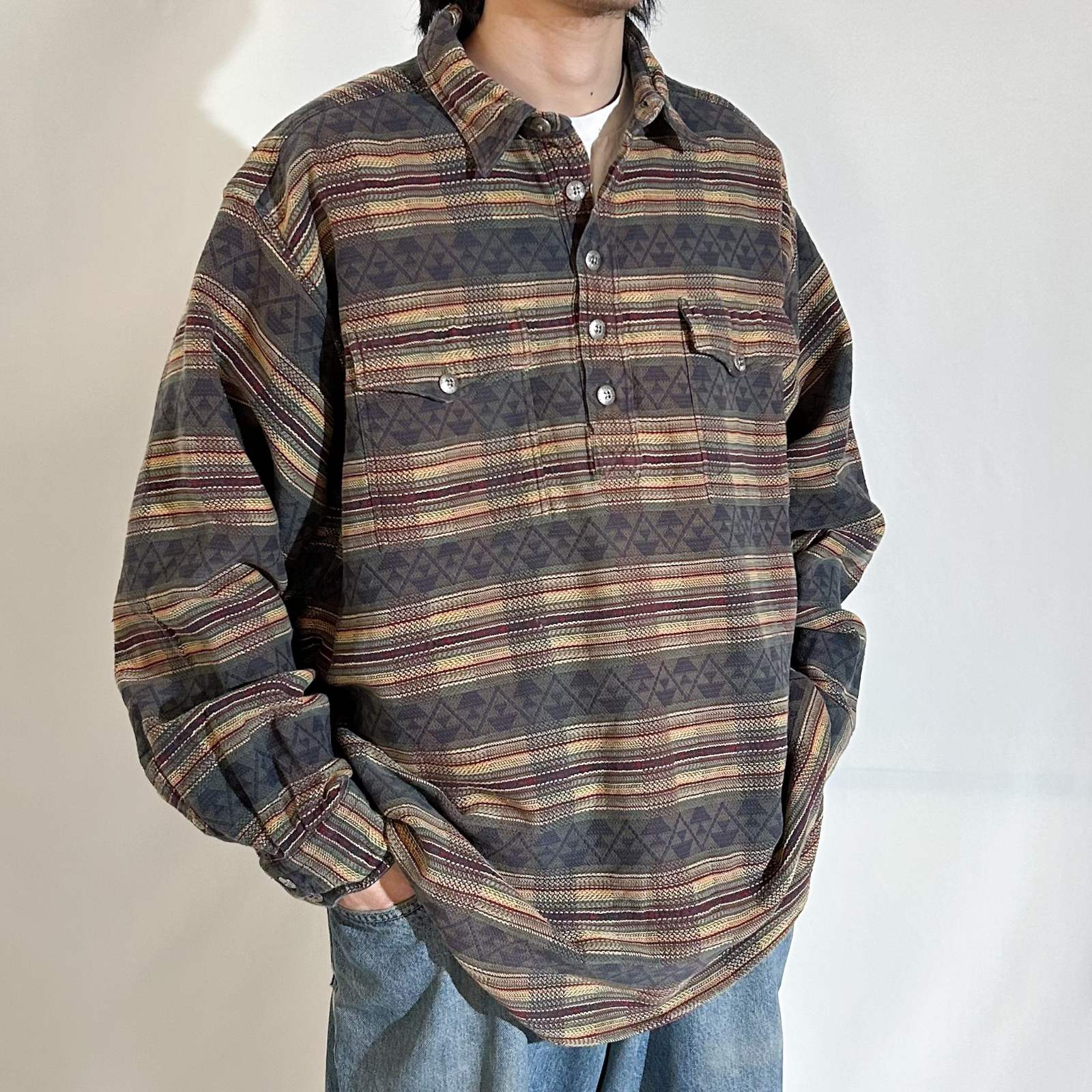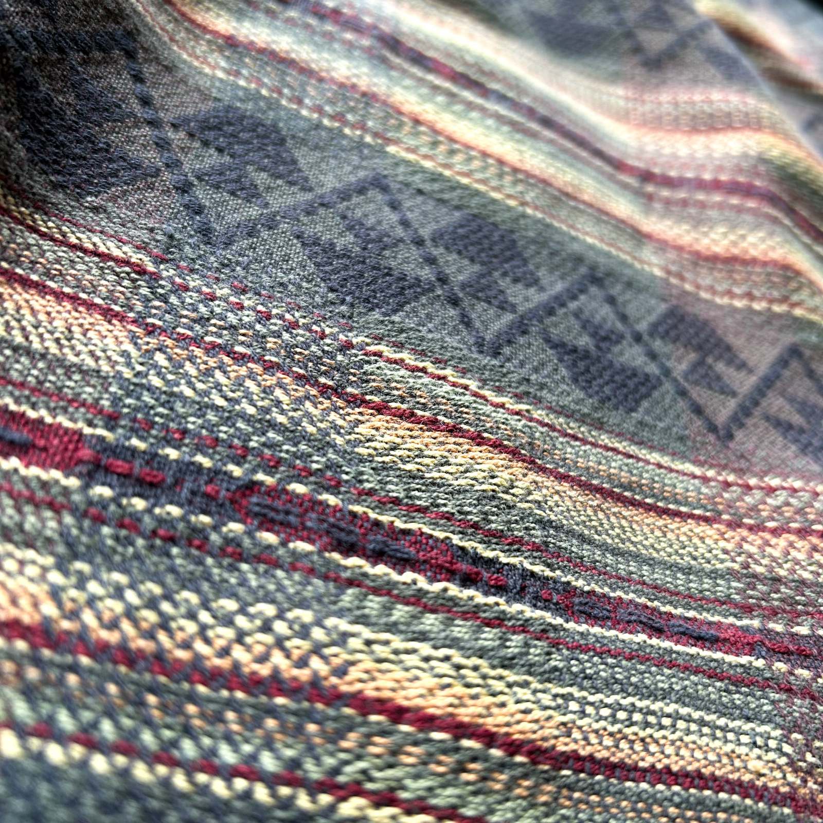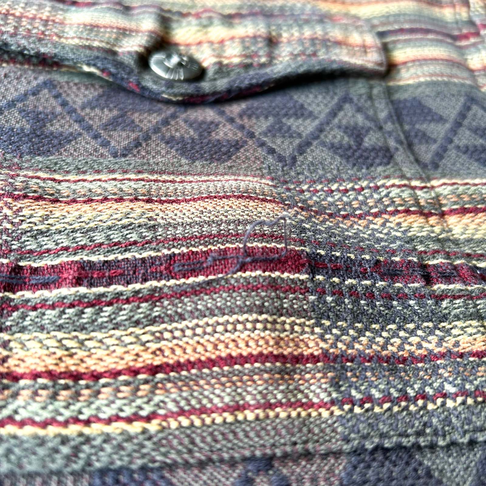 ORVIS ネイティブ柄シャツ。 ネイティブ柄が印象的なORVIS(オービス)のシャツ。ジャガード織のような独特の織り方が特徴で、柄に立体感があります。 身幅がゆったりとしたシルエットなので、リラックス感のある着こなしが楽しめます。ラフに羽織るだけで存在感があり、コーディネートにアクセントを加えてくれる一着。アメカジやカジュアルスタイルにピッタリで、使い勝手の良さも魅力です。