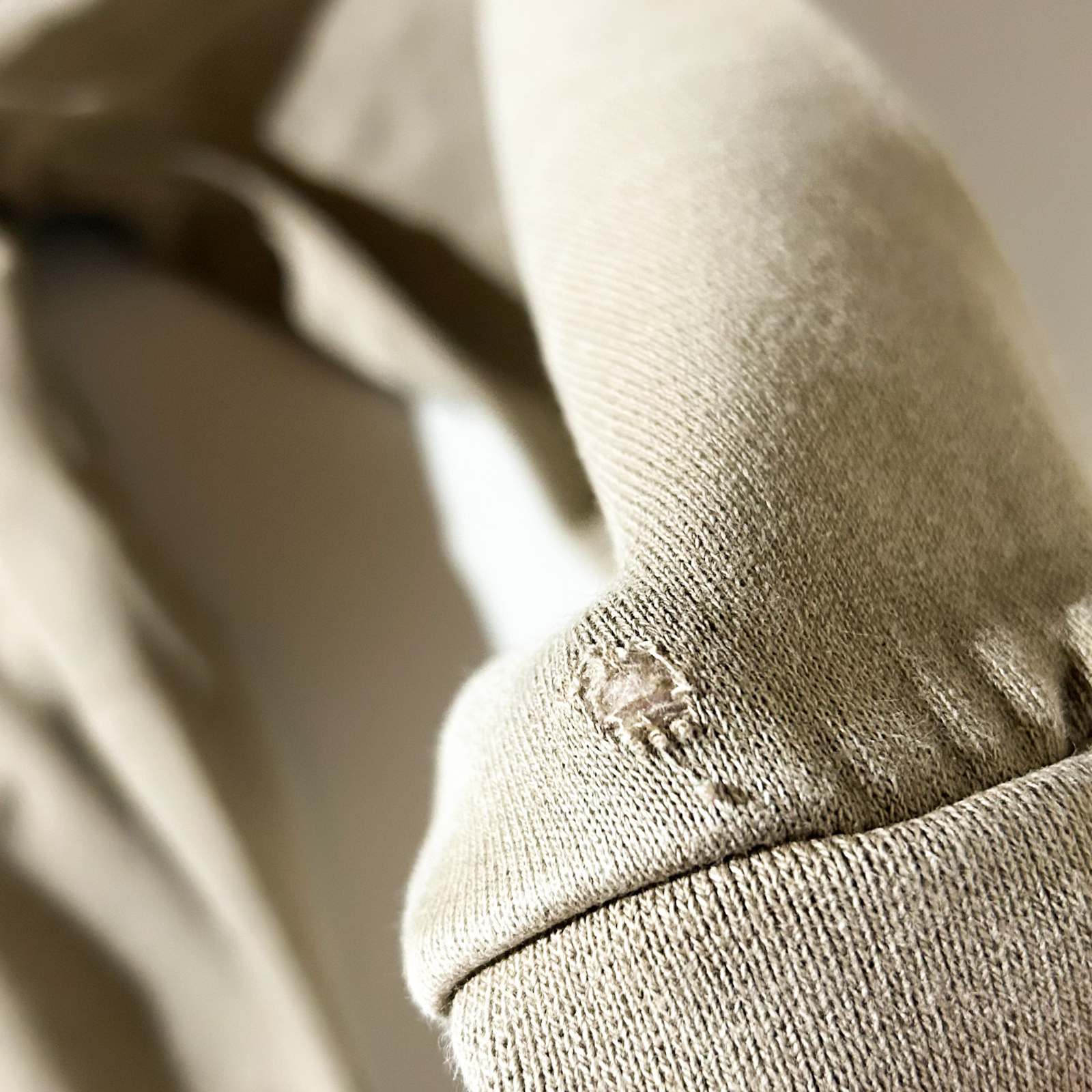 Bランク 前身頃の真ん中より下付近に一部使用感、右アームホール付近と左袖口付近にダメージが見られます