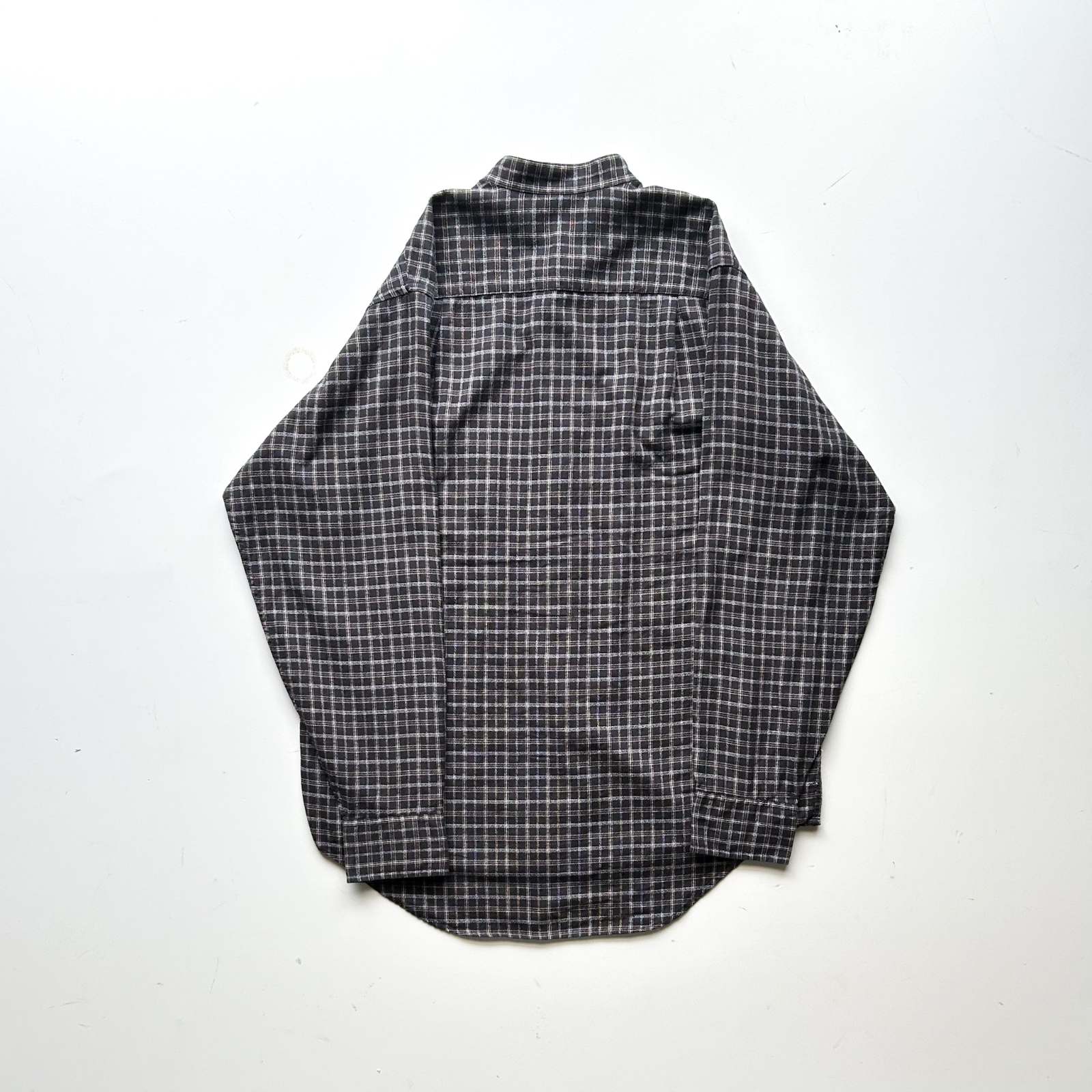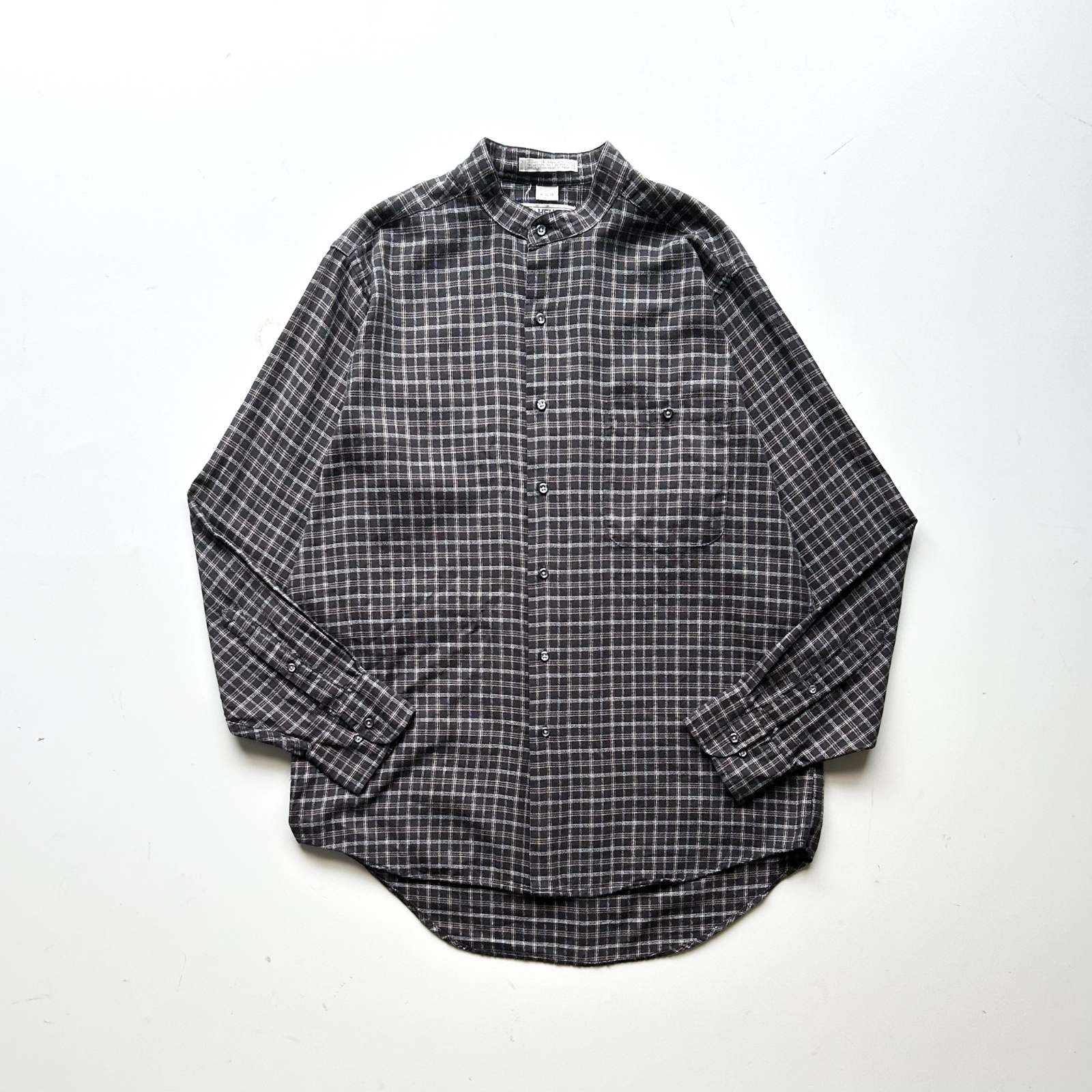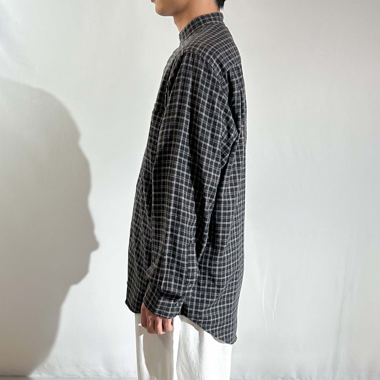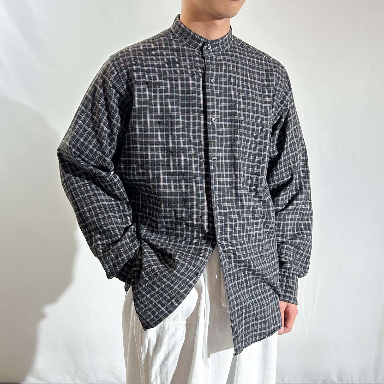 Van Heusen スタンドカラーチェックシャツ。 アメリカの老舗シャツメーカーVan Heusen(バンヒューゼン)。ドレスシャツの印象が強いブランドですが、こんなカジュアルなスタンドカラーシャツも手がけていたとは驚きです。さすがは老舗、注目したいのは生地の織り。綾織でも平織りでもない、どこか独特な織り方で、コットン100%にもかかわらずリネンやレーヨンのような柔らかく落ちるドレープ感を感じさせます。シルエットは身幅ゆったり・袖も溜まりが出るルーズさがあって、肩の力を抜いたカジュアルな着こなしにぴったり。デニムパンツとラフに合わせて着るだけで、雰囲気のあるスタイルが完成します。 シンプルながらもどこか品のある、Van Heusenならではの仕立ての良さが感じられる一枚です。