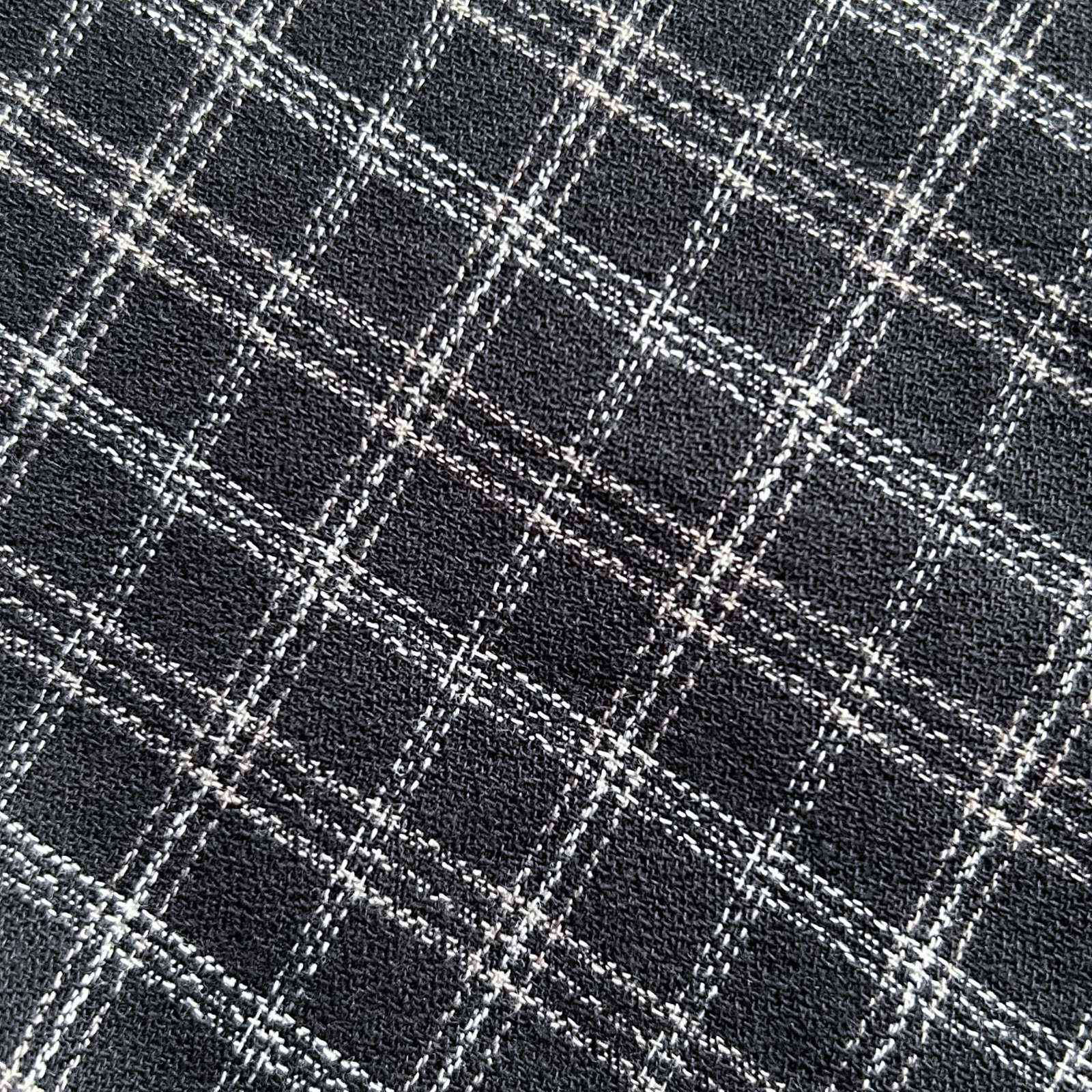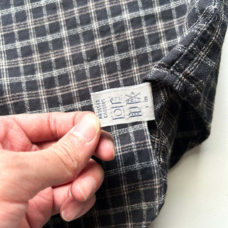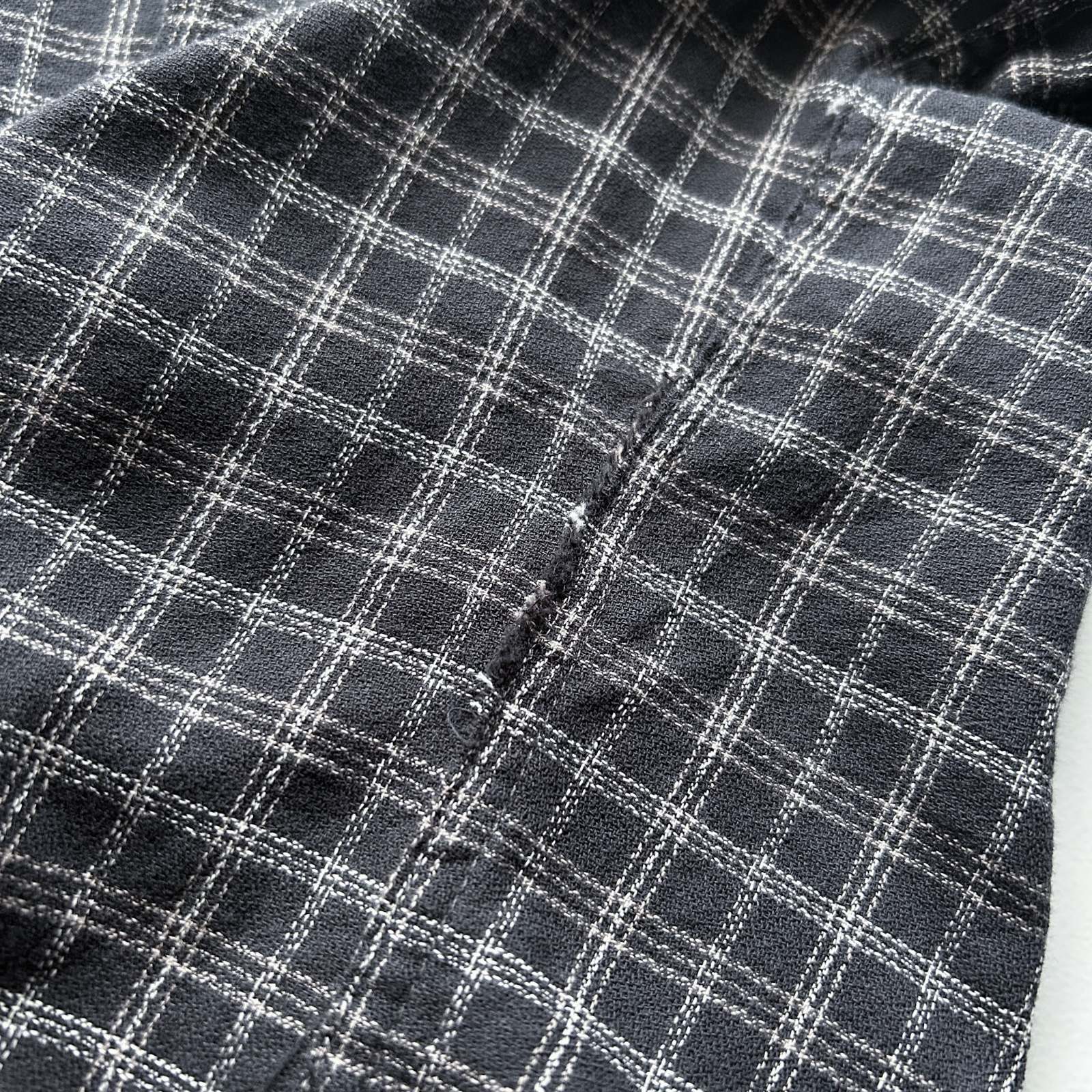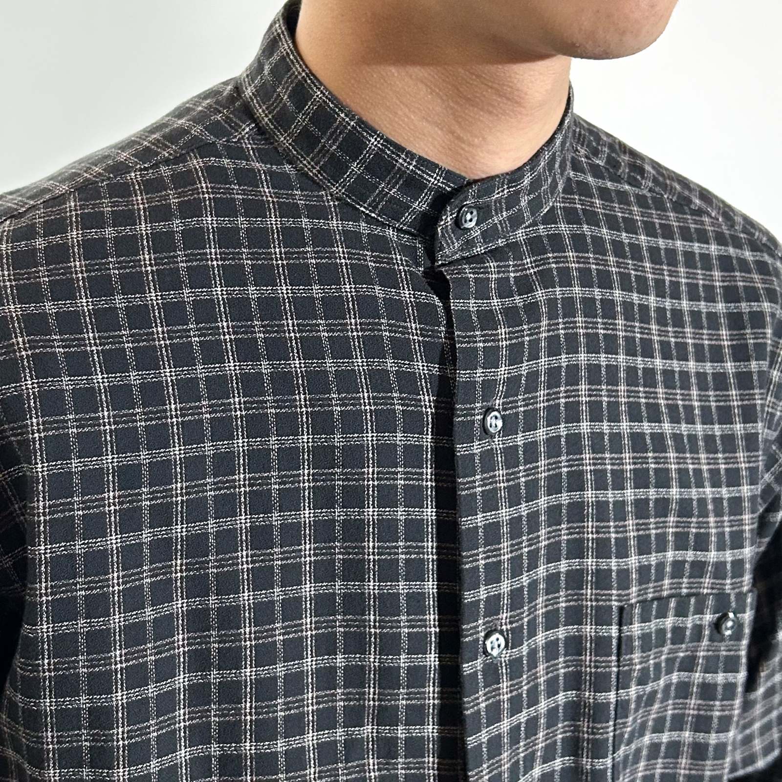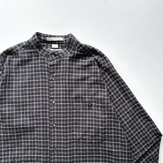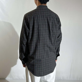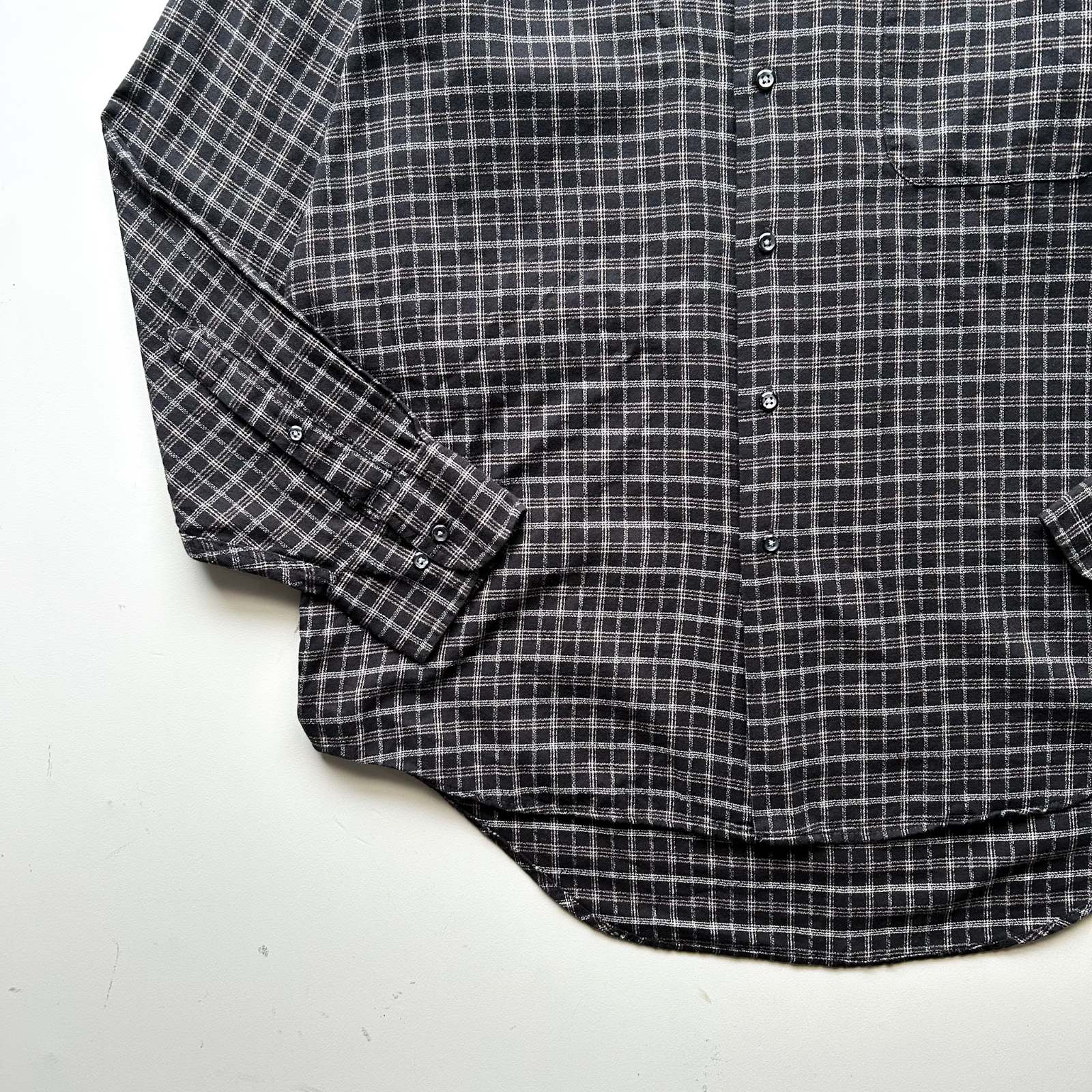 Van Heusen スタンドカラーチェックシャツ。 アメリカの老舗シャツメーカーVan Heusen(バンヒューゼン)。ドレスシャツの印象が強いブランドですが、こんなカジュアルなスタンドカラーシャツも手がけていたとは驚きです。さすがは老舗、注目したいのは生地の織り。綾織でも平織りでもない、どこか独特な織り方で、コットン100%にもかかわらずリネンやレーヨンのような柔らかく落ちるドレープ感を感じさせます。シルエットは身幅ゆったり・袖も溜まりが出るルーズさがあって、肩の力を抜いたカジュアルな着こなしにぴったり。デニムパンツとラフに合わせて着るだけで、雰囲気のあるスタイルが完成します。 シンプルながらもどこか品のある、Van Heusenならではの仕立ての良さが感じられる一枚です。