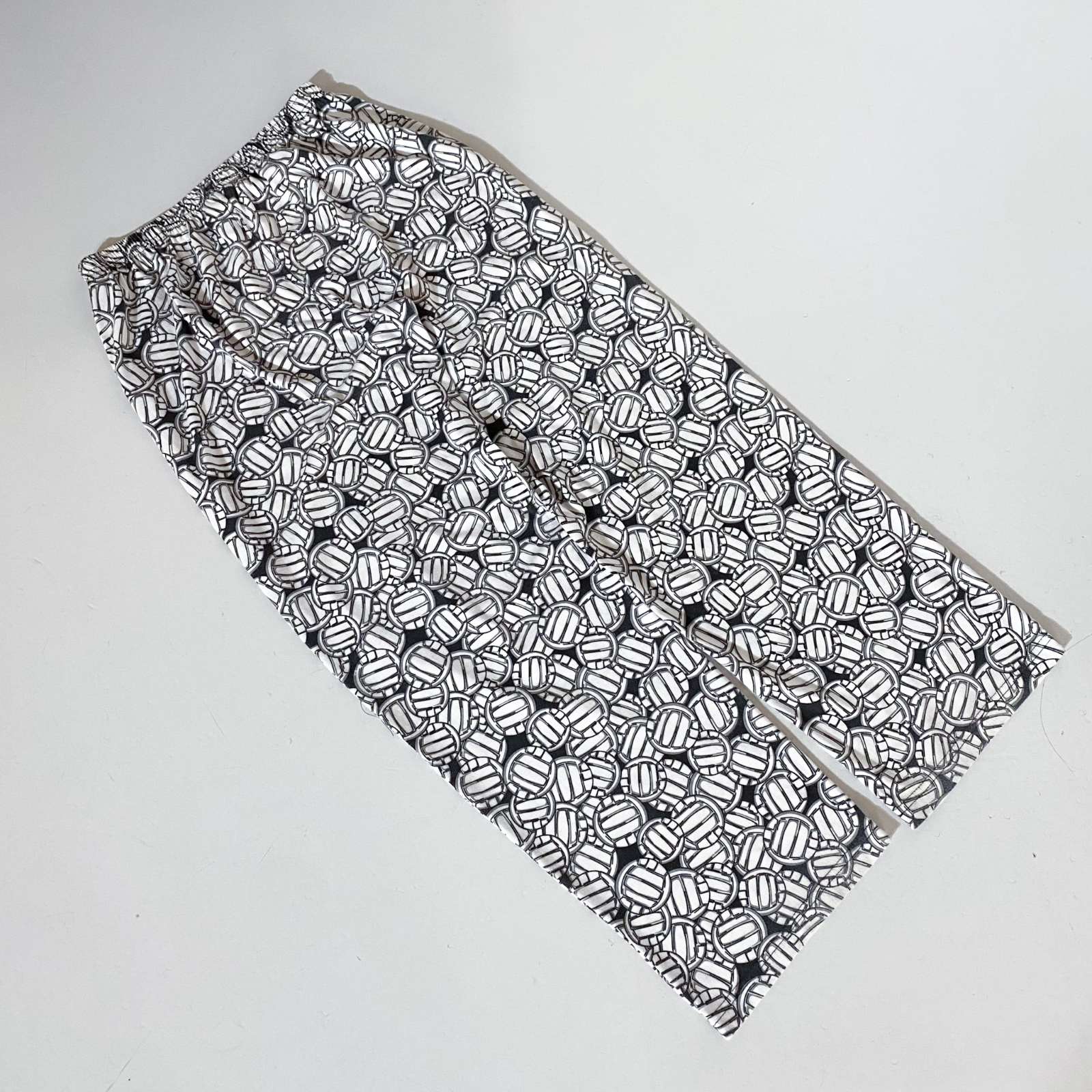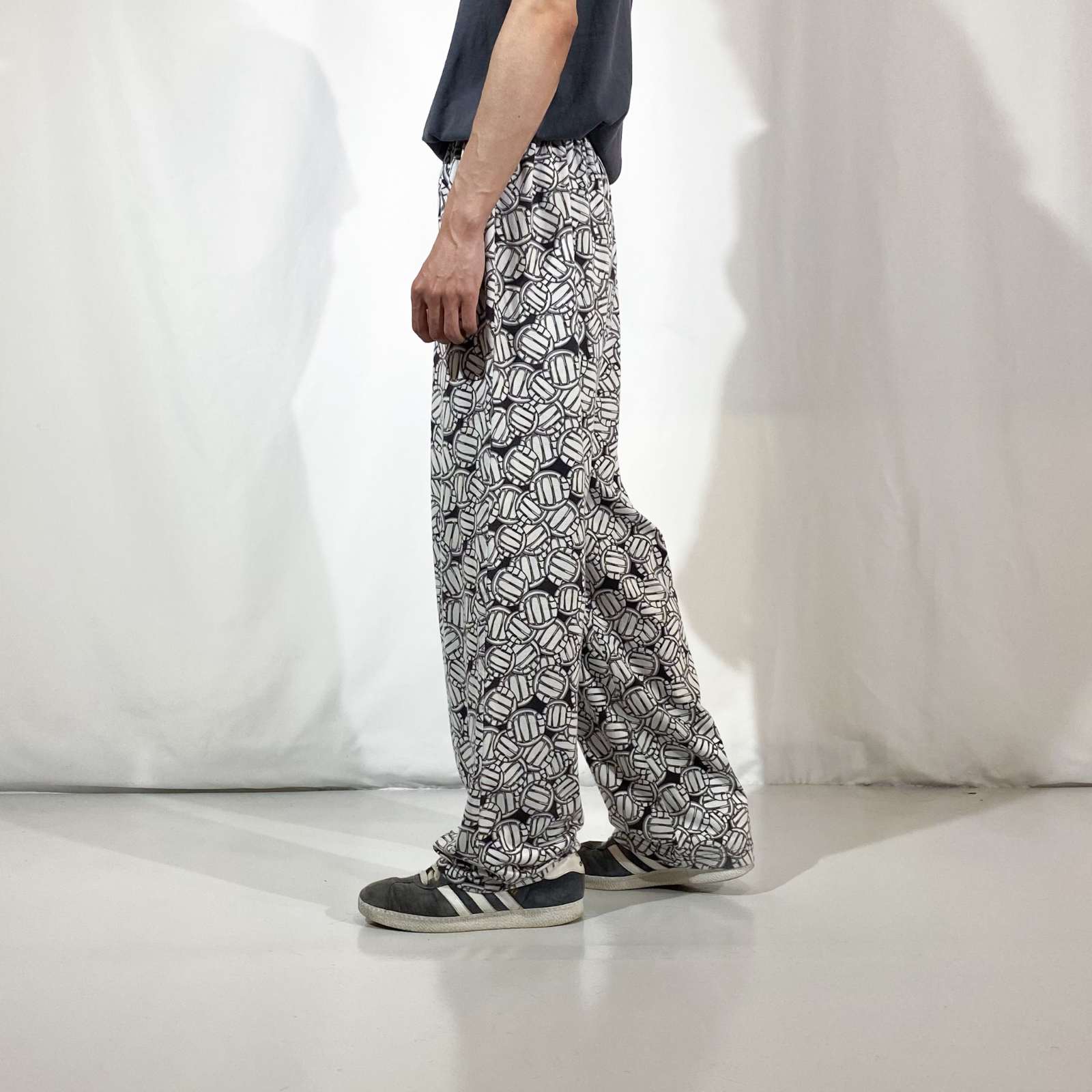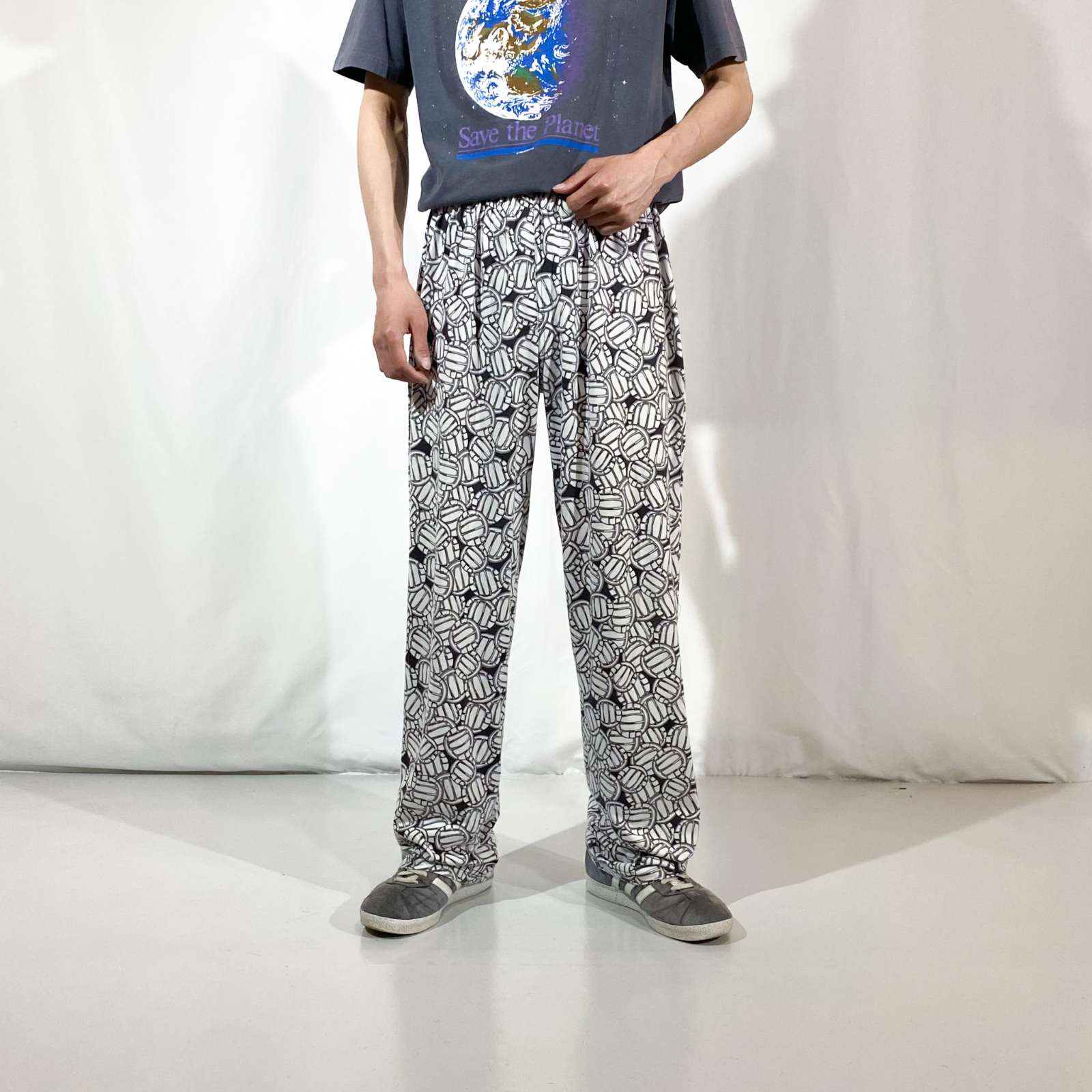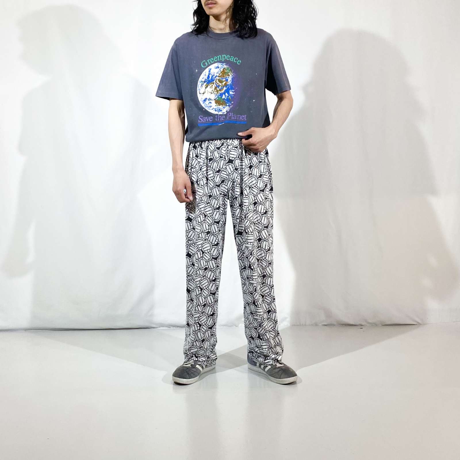 パジャマパンツの総柄といえば派手なカラーリングが多いですが、こちらはモノトーンで落ち着いた雰囲気の一枚。夏場は特にシンプルになりやすい時期なので1枚柄のパンツがあると重宝します。サイズ感もパジャマの為、ゆとりあるシルエットでコーディネートに落とし込みやすいです。コットン100%に比べて毛羽立ちにくく洗濯しても変形しにくいので末永くご着用いただけます。生地は薄いですが、透けないので一枚で着用いただけます。