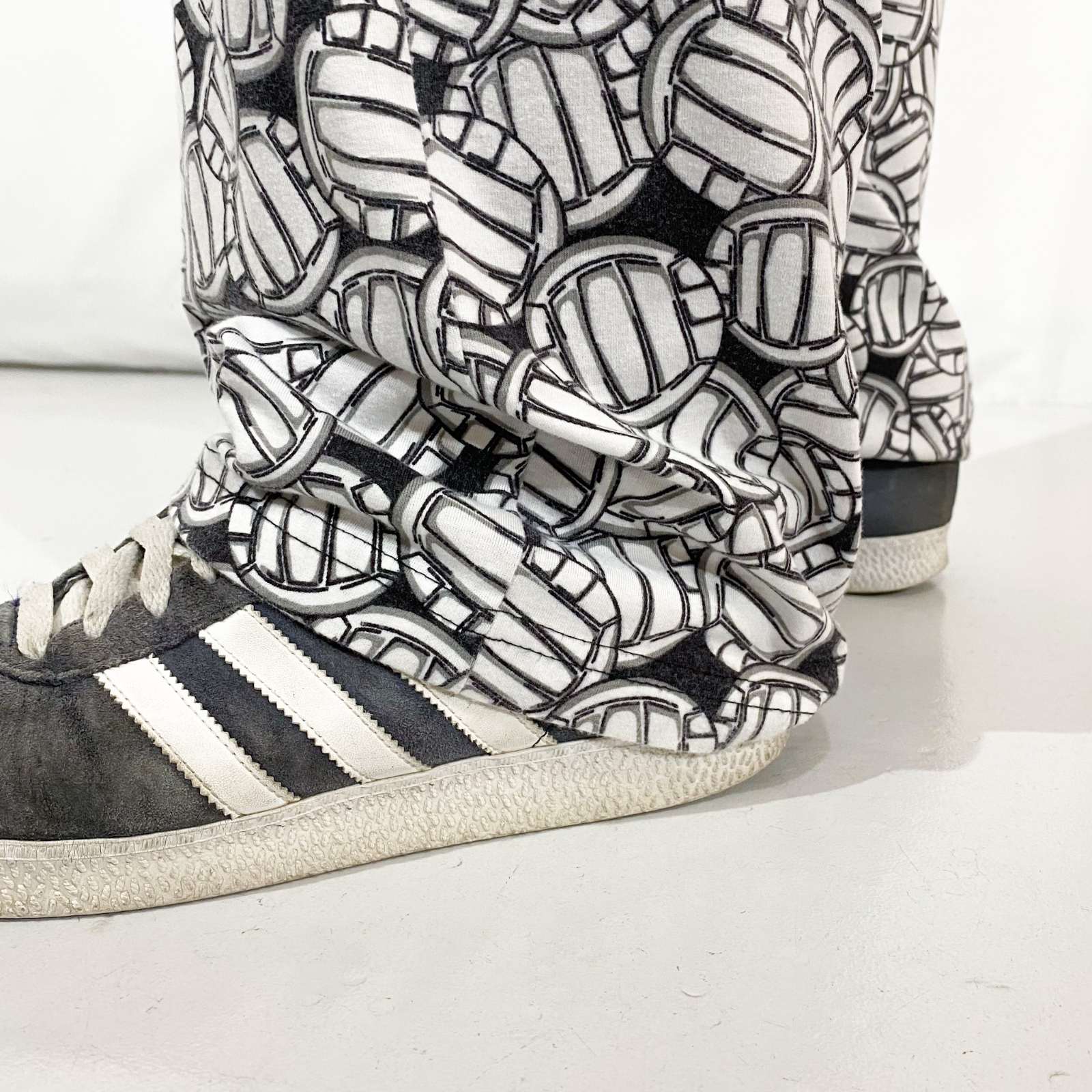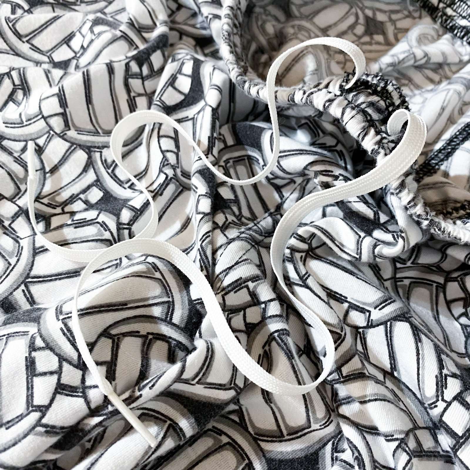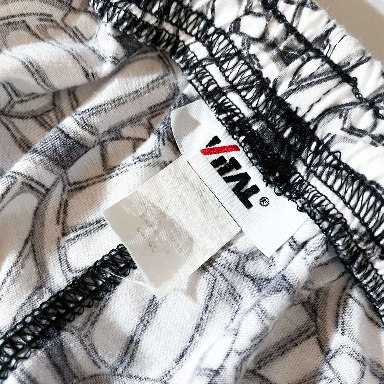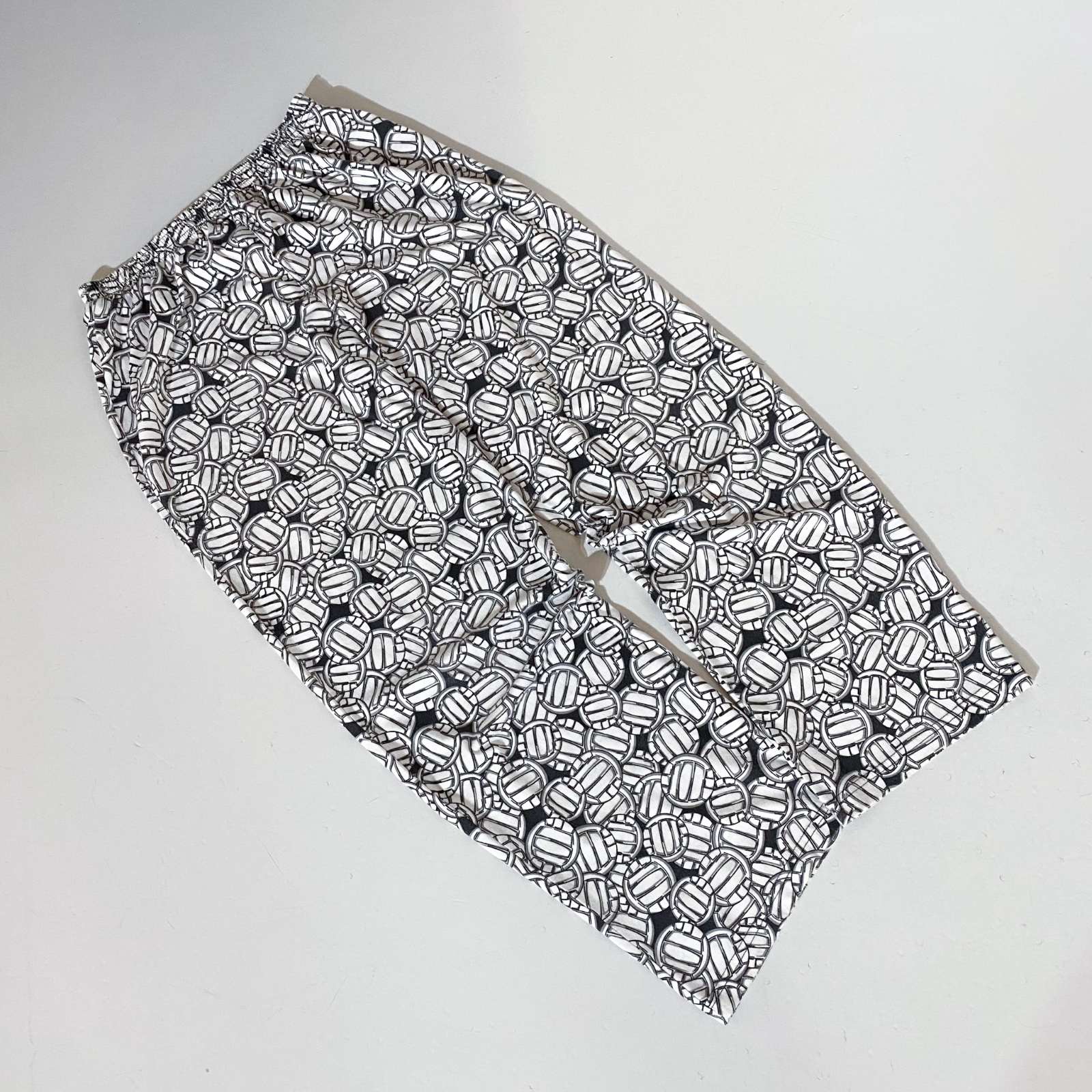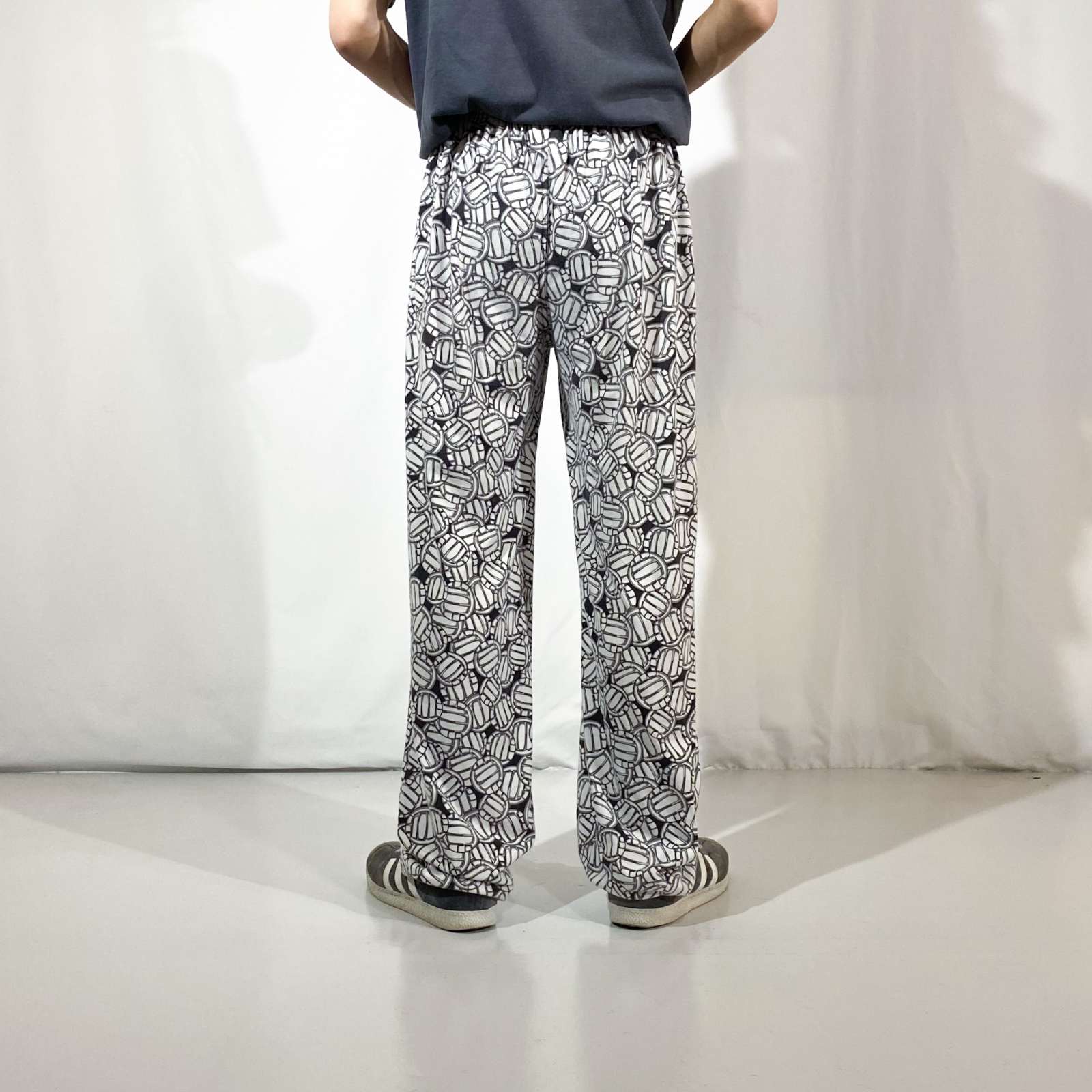 パジャマパンツの総柄といえば派手なカラーリングが多いですが、こちらはモノトーンで落ち着いた雰囲気の一枚。夏場は特にシンプルになりやすい時期なので1枚柄のパンツがあると重宝します。サイズ感もパジャマの為、ゆとりあるシルエットでコーディネートに落とし込みやすいです。コットン100%に比べて毛羽立ちにくく洗濯しても変形しにくいので末永くご着用いただけます。生地は薄いですが、透けないので一枚で着用いただけます。