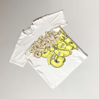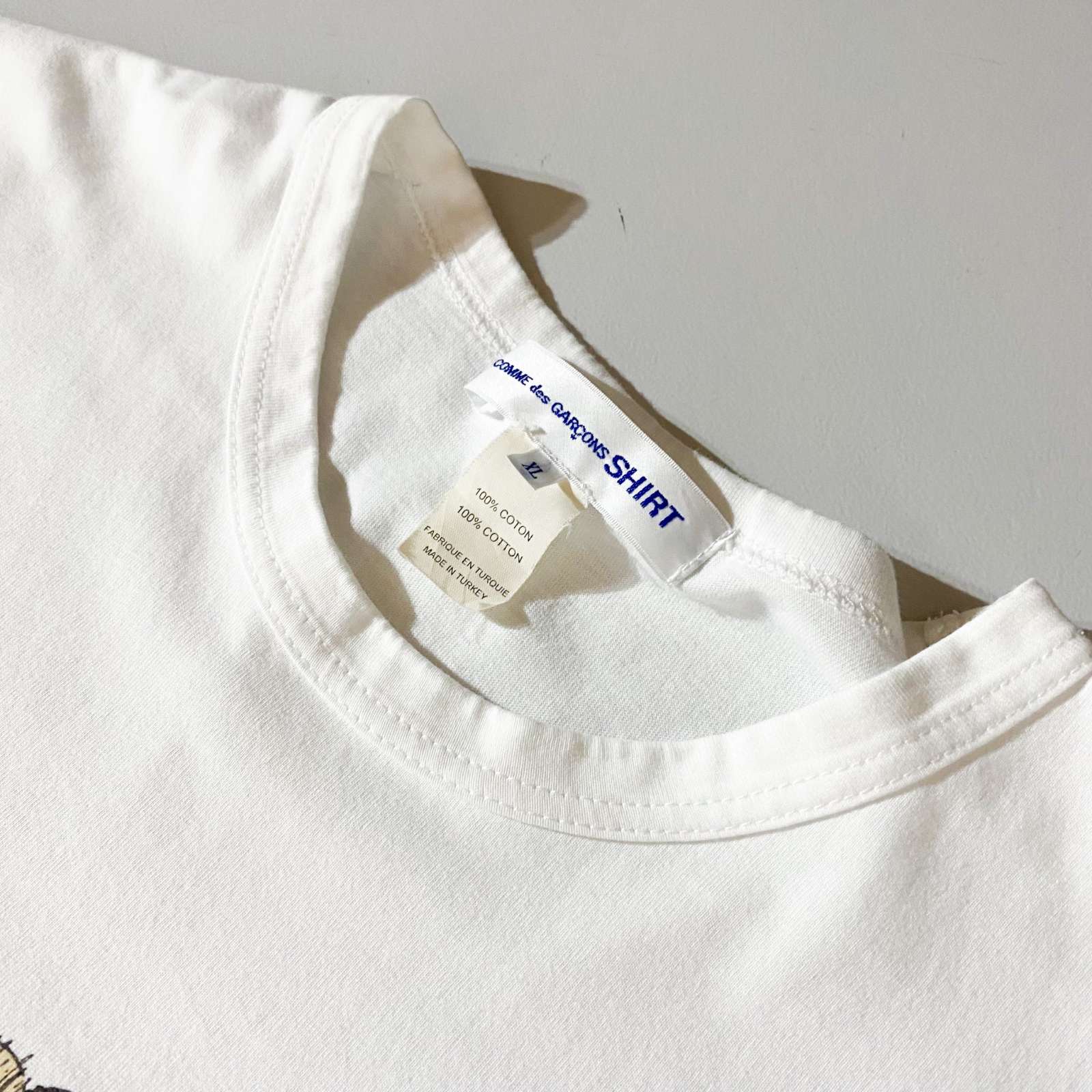 コムデギャルソンのアートTシャツになります。2022年、コムデギャルソンシャツのKAWSコラボTシャツになります。 ホワイトのコットンボディ、フロントにカウズデザインのコラボロゴのグラフティーがプリントされたデザインです。 比較的スッキリとしたシルエットになります。