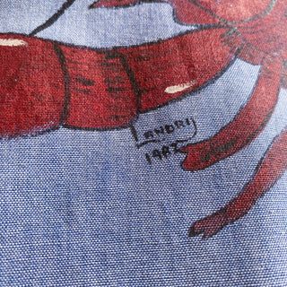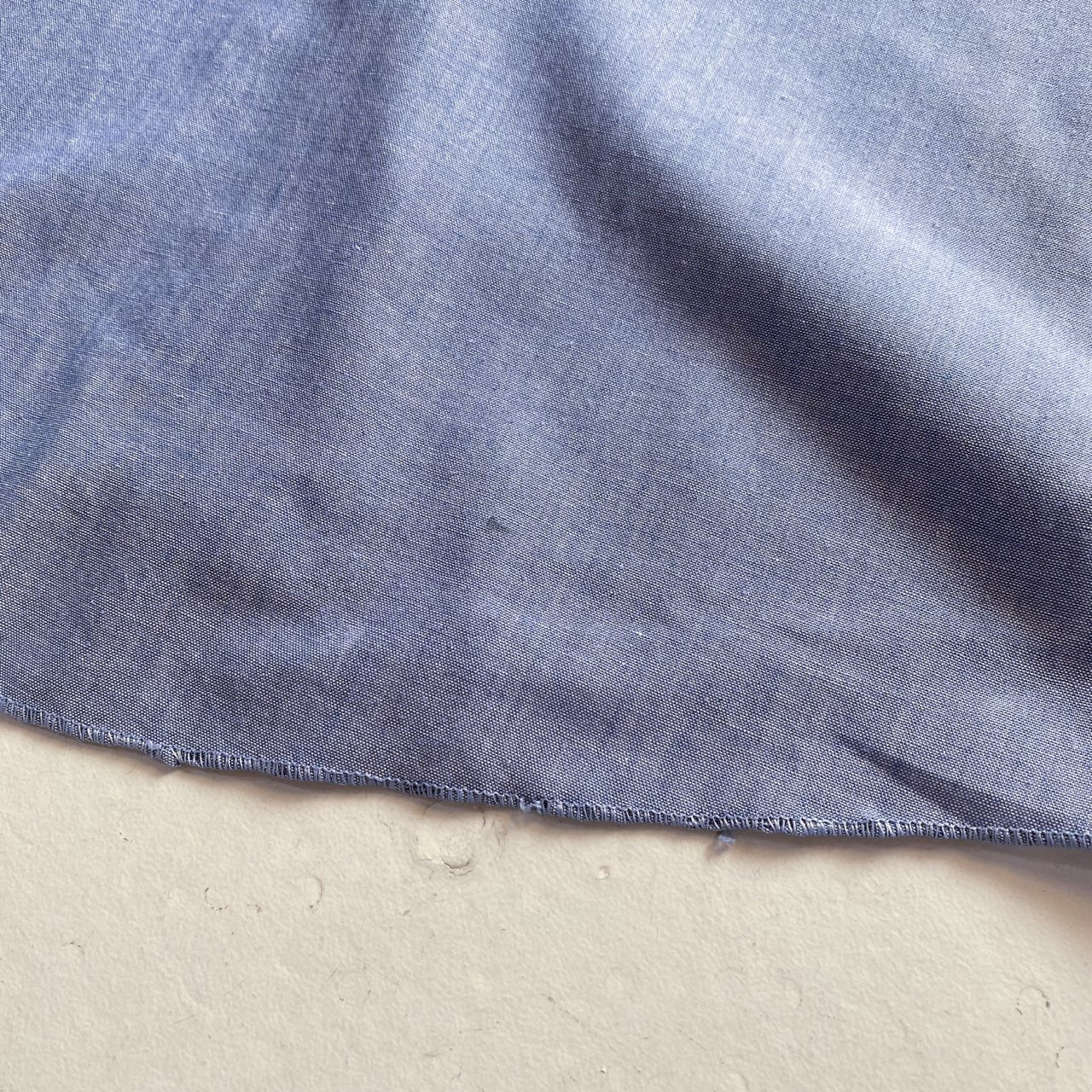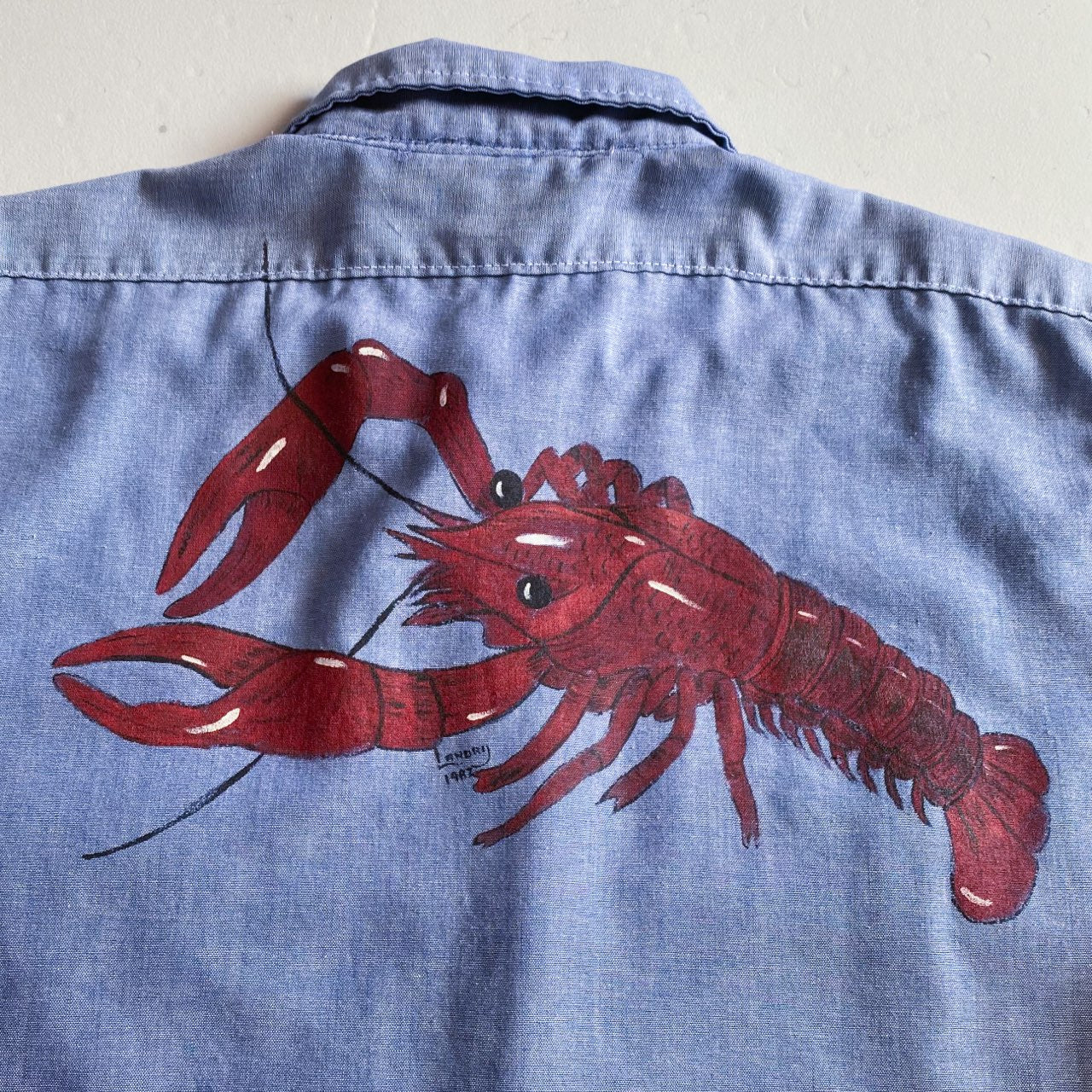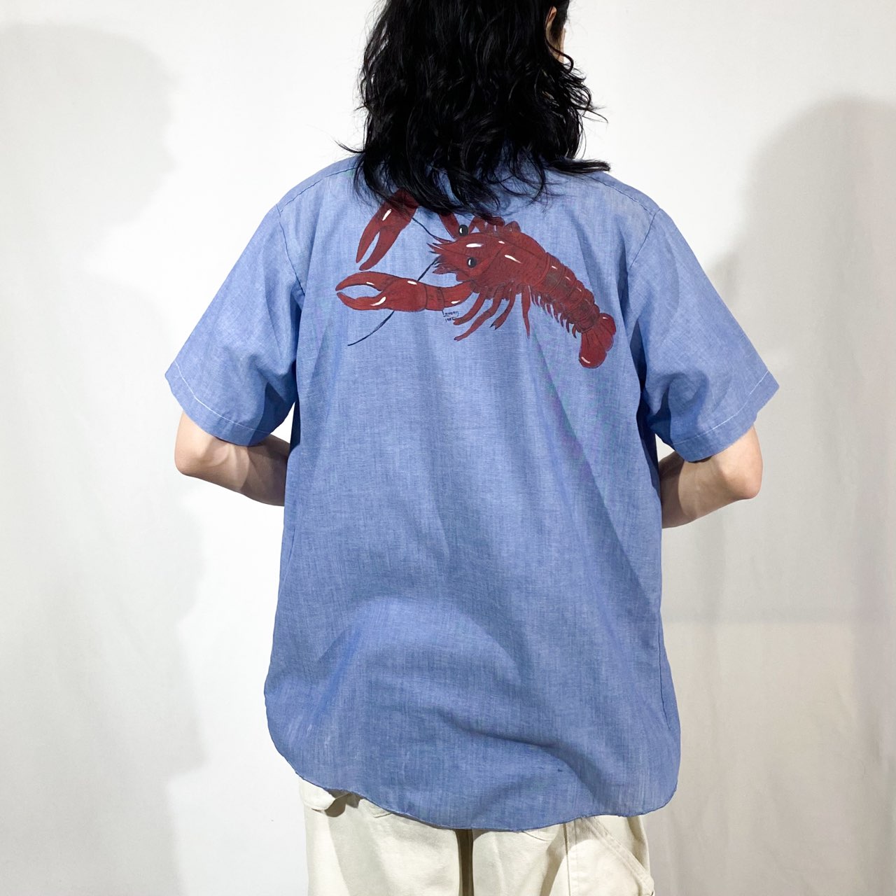 Dickiesのシャンブレーシャツになります。バックにはロブスターのプリントの入る一点物。サイズ表記はMediumサイズとなっている為、173cmのメンズでピッタリとした着心地!ラウンドシルエットのシャツは着丈の長いものが多いですが、着丈が短めなのが嬉しいですね。