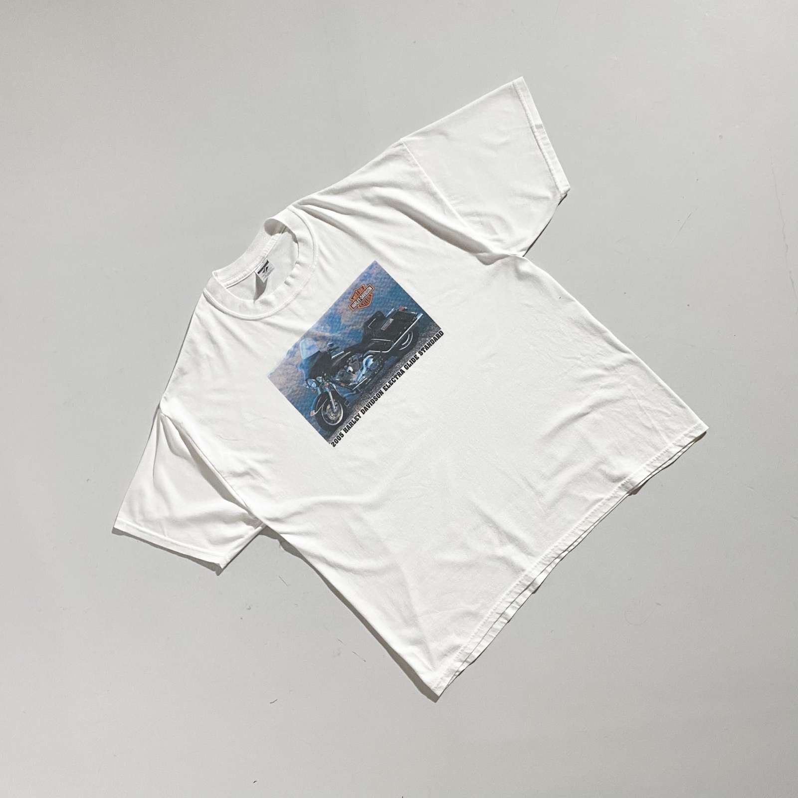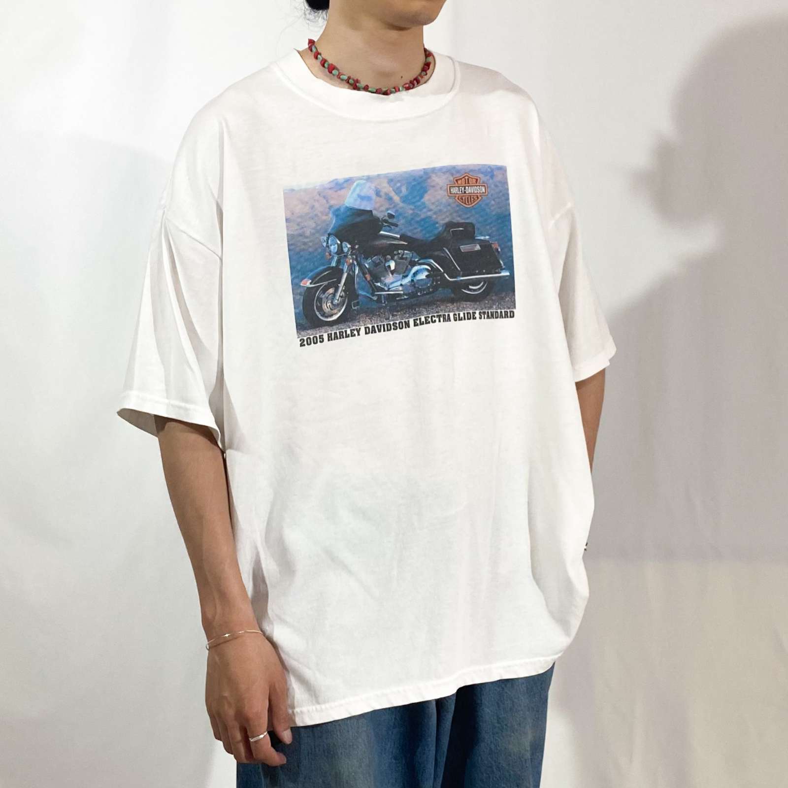 ハーレーダビッドソンにしてはシンプルなデザインが魅力。2005年製のElectra Glide Standardのフォトがプリントされたお洒落な白Tシャツ。あとハーレーダビッドソンで白ボディなのも地味に珍しいですね。