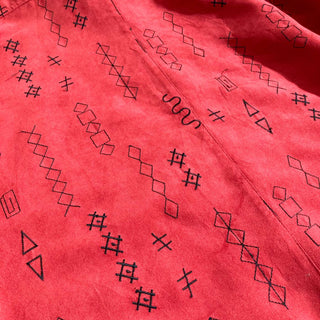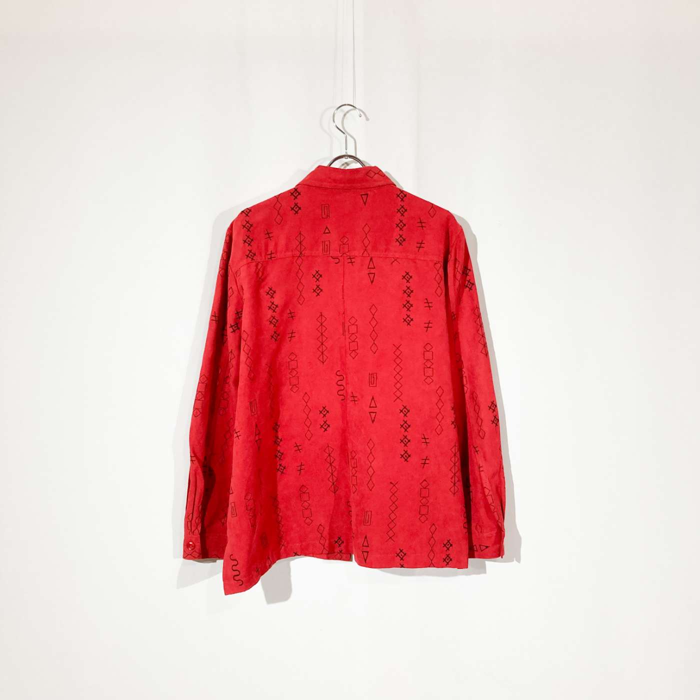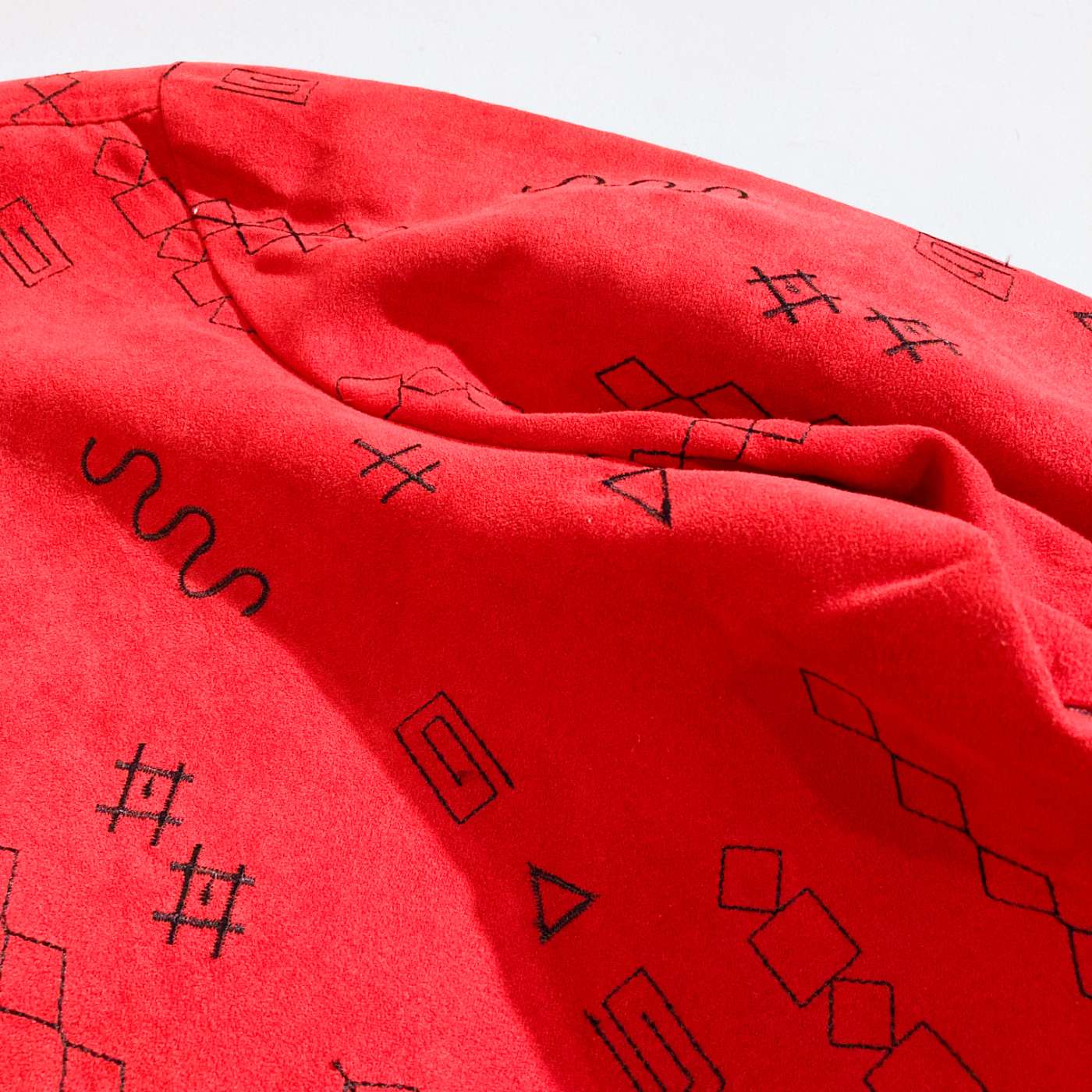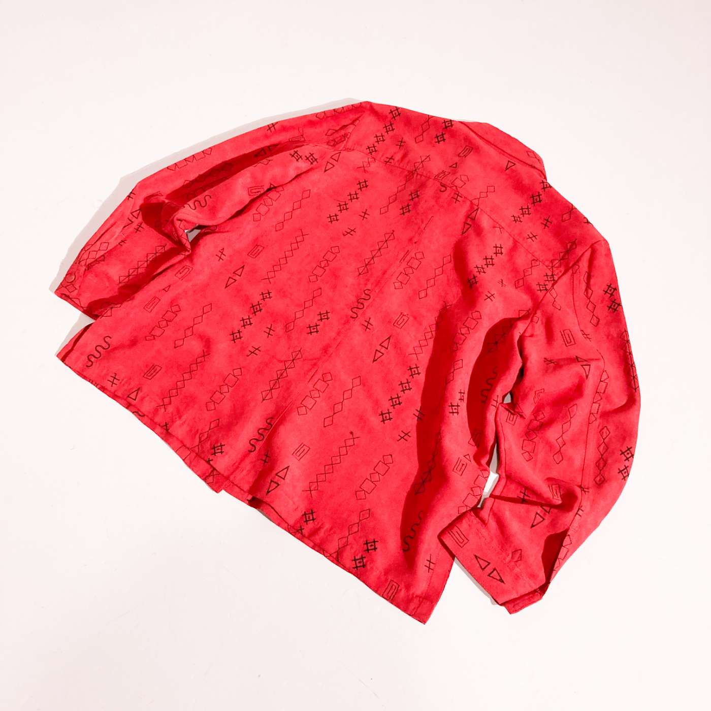赤ベースに黒の幾何学模様が縫われています。ボックスシルエットの程よい短丈で全身黒にこちらのジャケットを羽織っていただきたいですね
