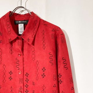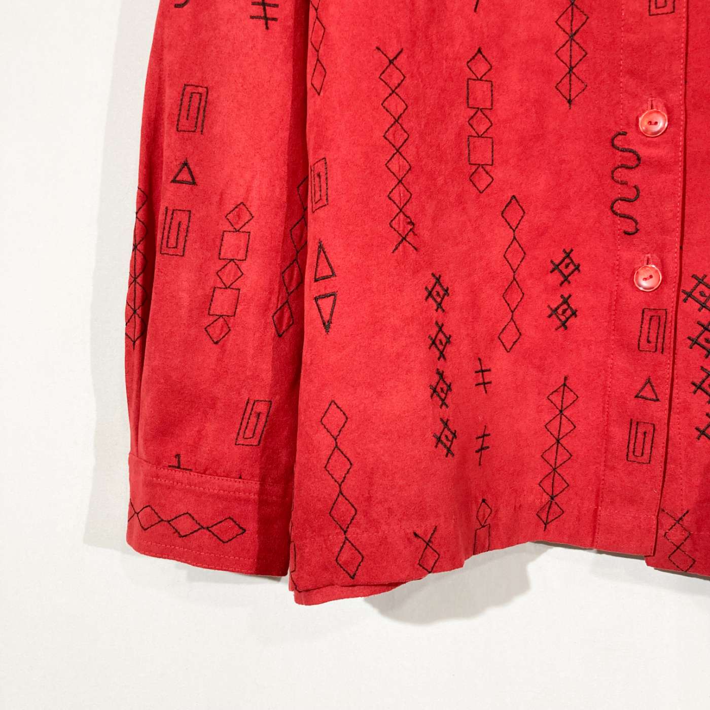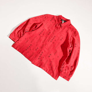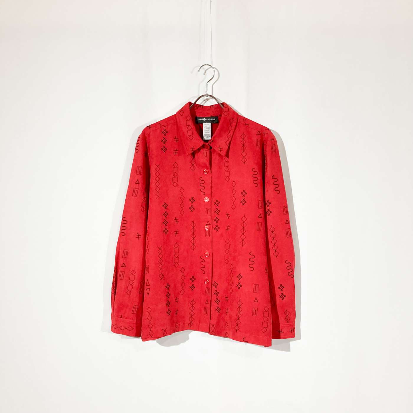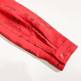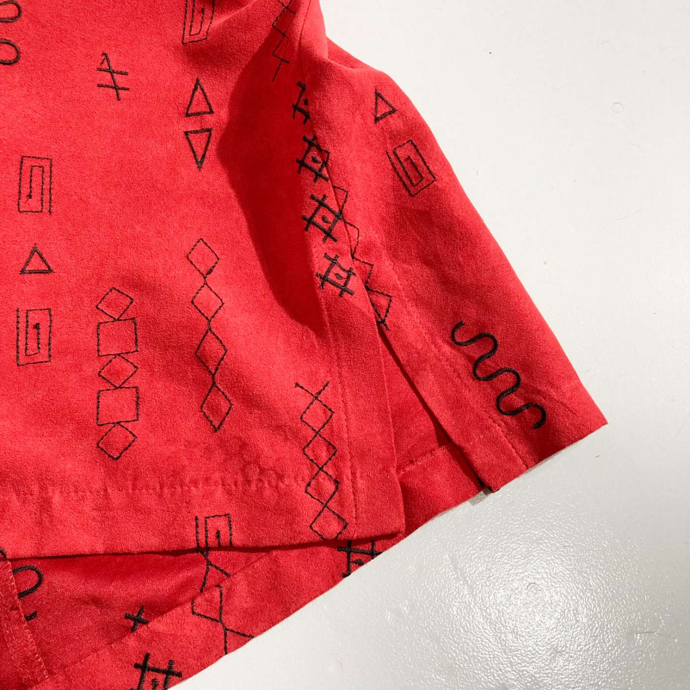 赤ベースに黒の幾何学模様が縫われています。ボックスシルエットの程よい短丈で全身黒にこちらのジャケットを羽織っていただきたいですね