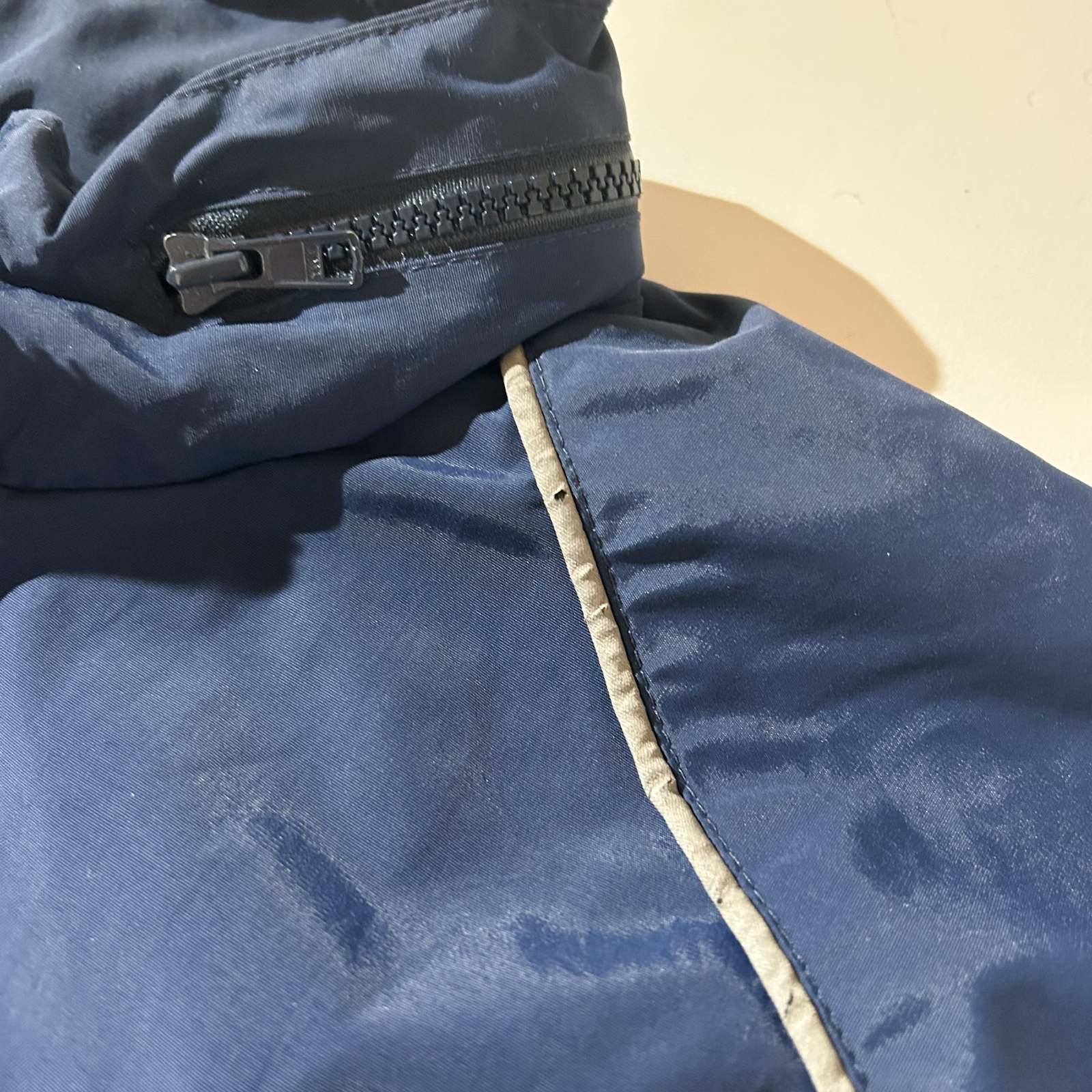 Bランク 数箇所 少ダメージ、裏地複数シミ、袖口汚れが見られます
