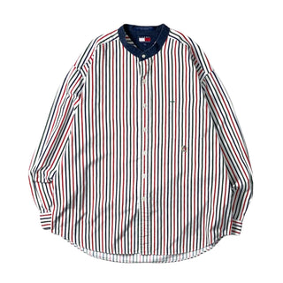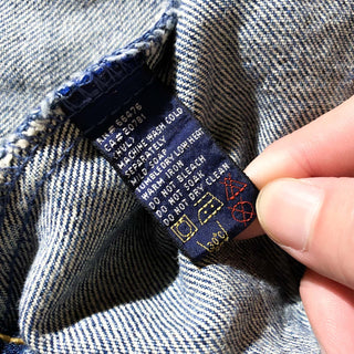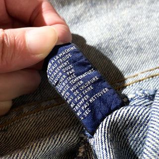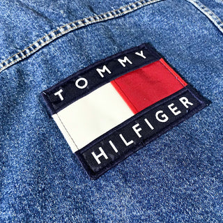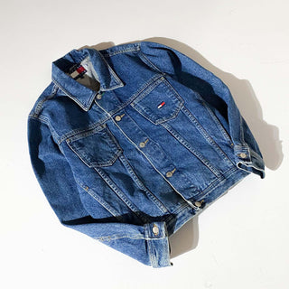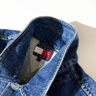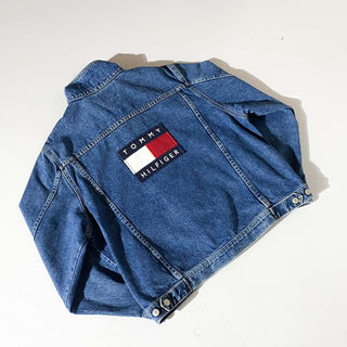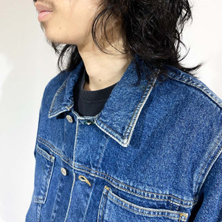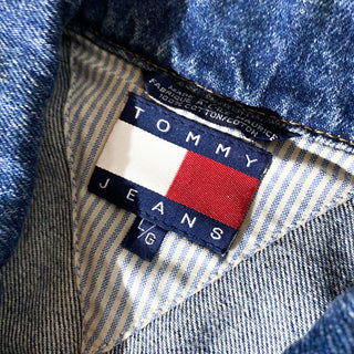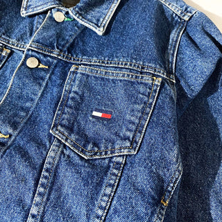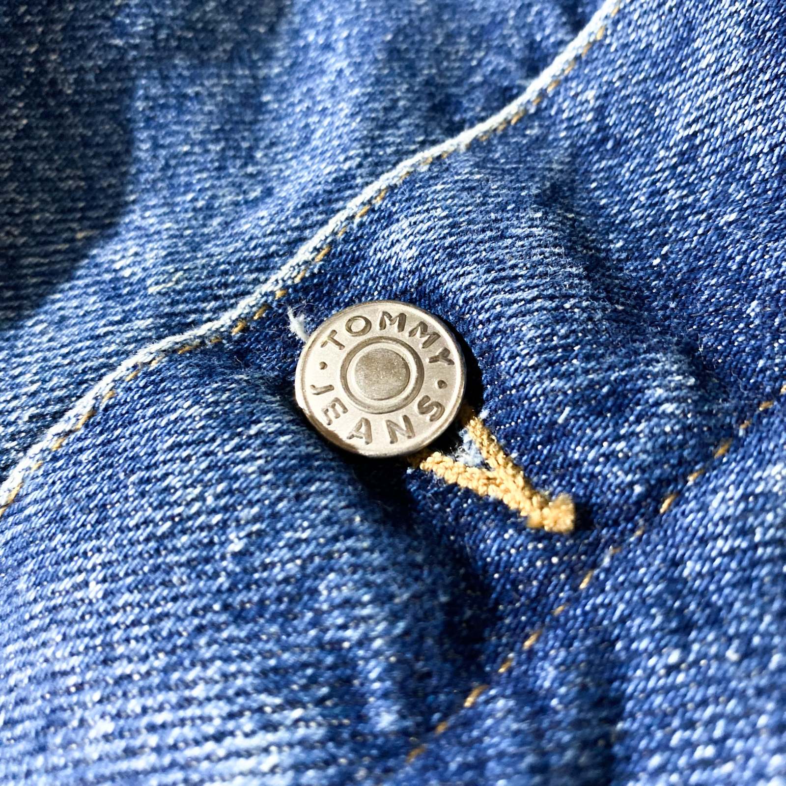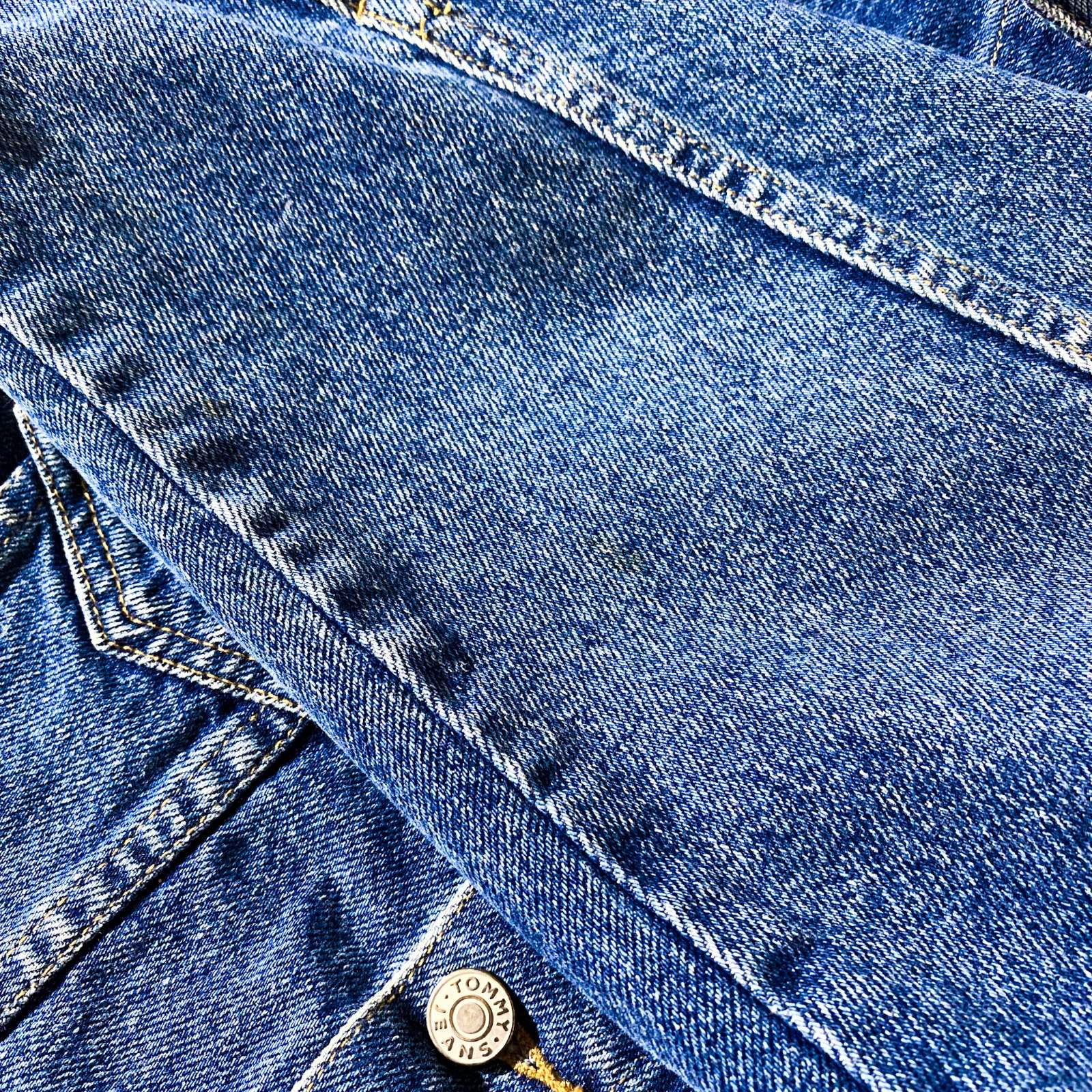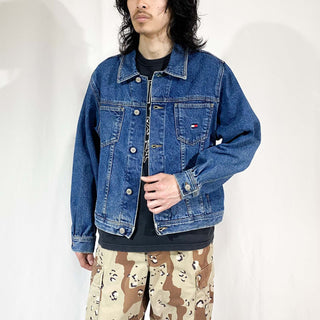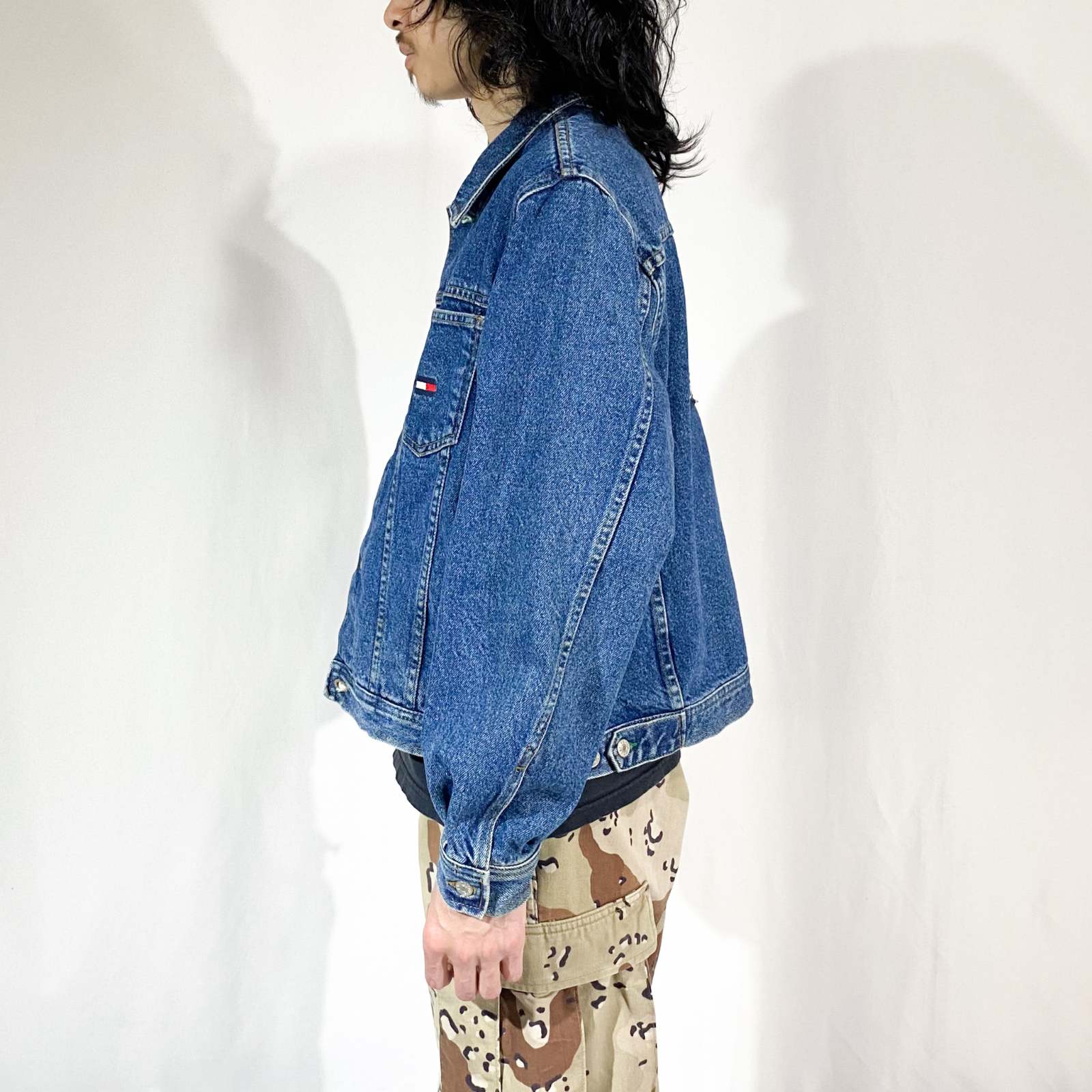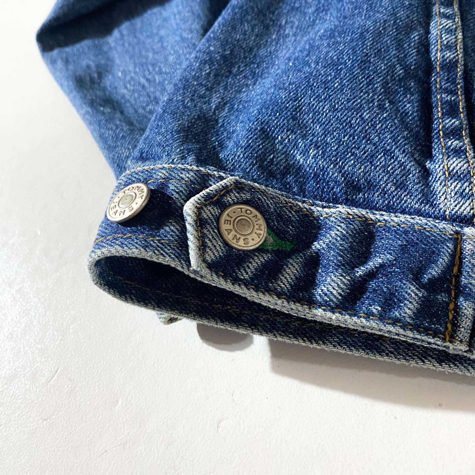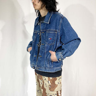 TOMMY JEANSのデニムジャケットになります。後身頃のフラッグタグがアクセント。173cm56kgのモデルでスウェットを中に着込んでも着膨れせず着ていただけます。